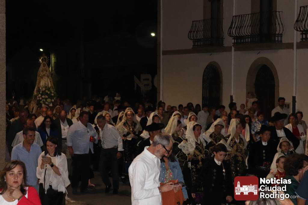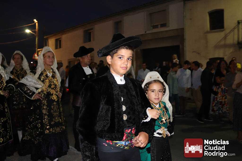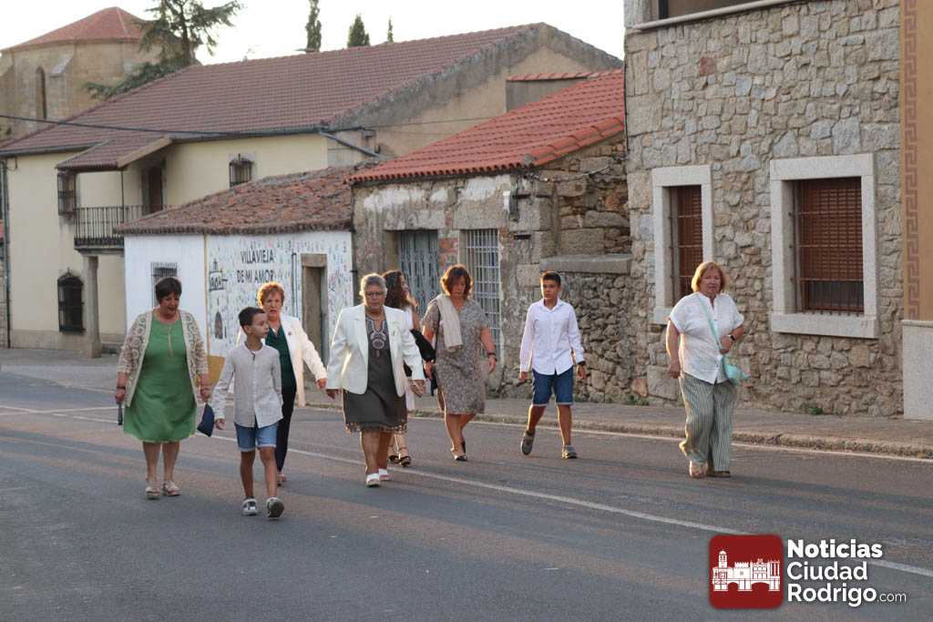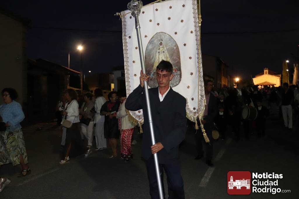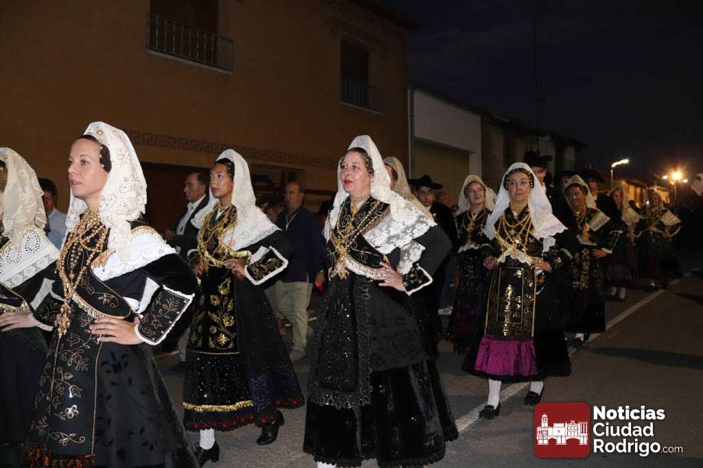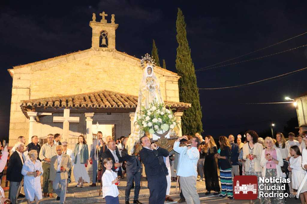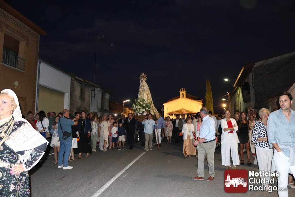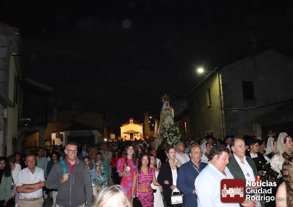 A las nueve de la noche, comienza la novena en la ermita y el Santo Rosario. Los mayordomos, Eva y Javier, acompañados por el sacerdote párroco Jesús Gutiérrez han llegado antes hasta el lugar acompañados de charros y charras de todas las edades al ritmo de la gaita y el tamboril. Al término del rezo, comienza el traslado. El grupo de charros delante, decenas de personas con velas y la Virgen en andas realizando el trayecto procesional hasta la plaza Mayor.