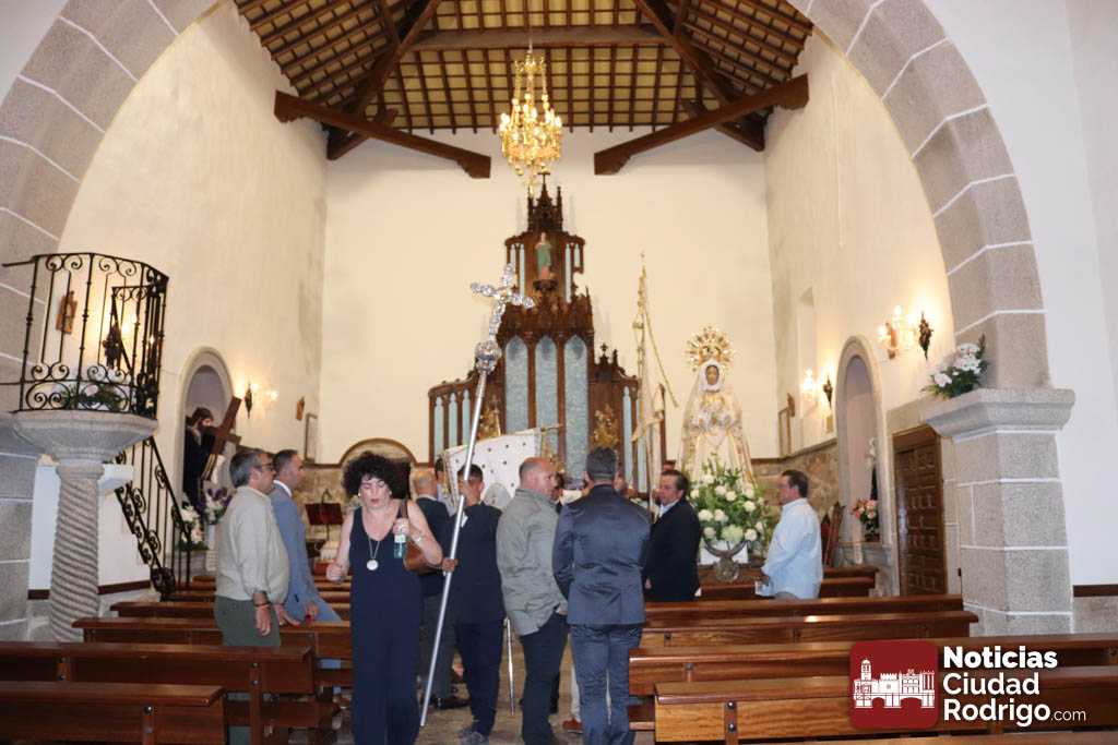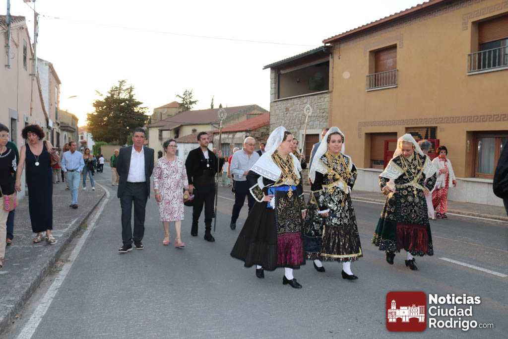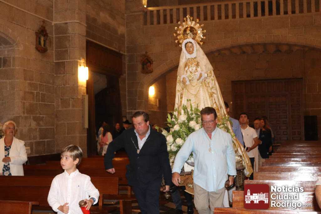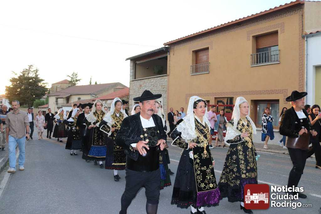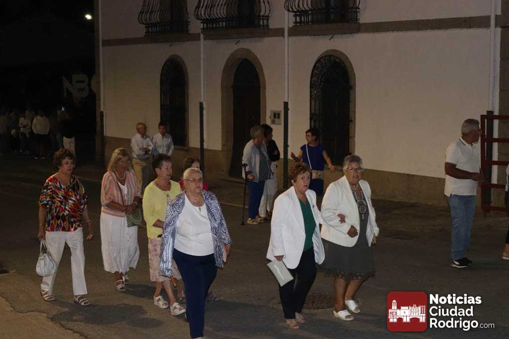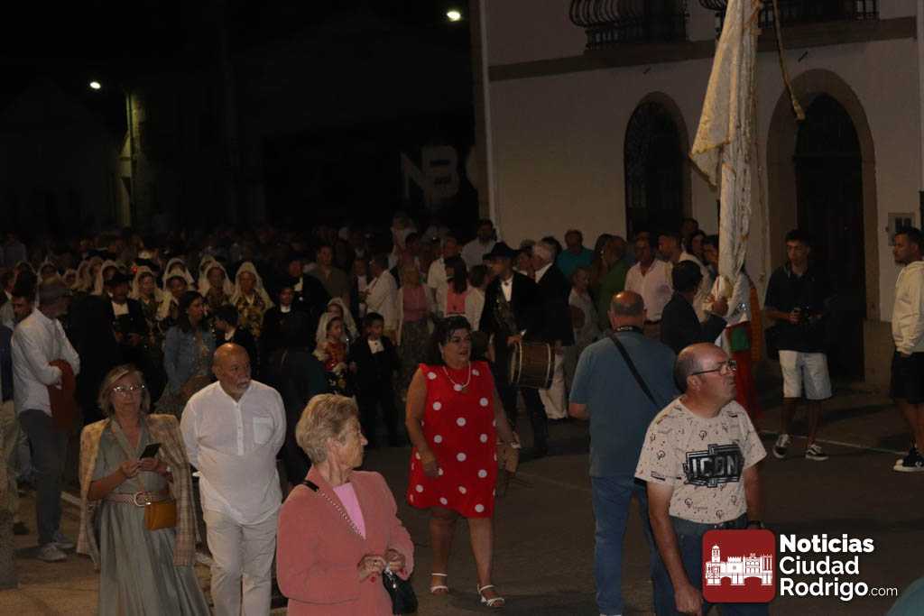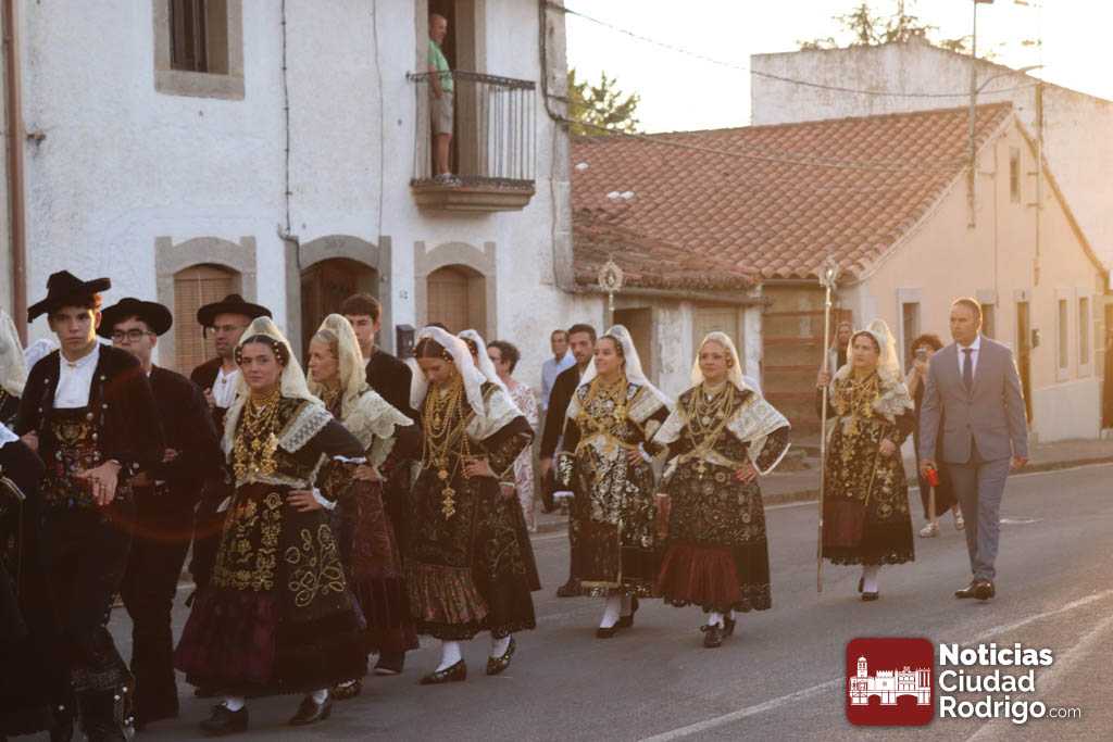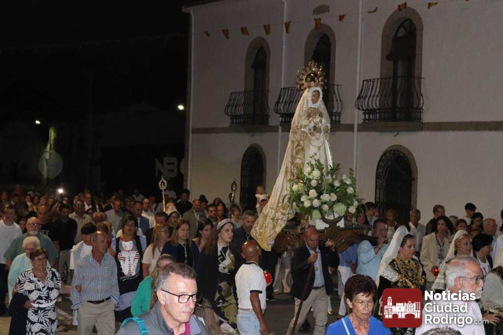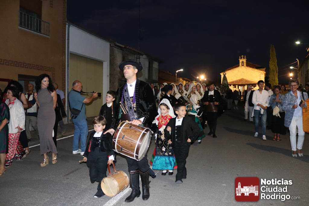 A las nueve de la noche, comienza la novena en la ermita y el Santo Rosario. Los mayordomos, Eva y Javier, acompañados por el sacerdote párroco Jesús Gutiérrez han llegado antes hasta el lugar acompañados de charros y charras de todas las edades al ritmo de la gaita y el tamboril. Al término del rezo, comienza el traslado. El grupo de charros delante, decenas de personas con velas y la Virgen en andas realizando el trayecto procesional hasta la plaza Mayor.