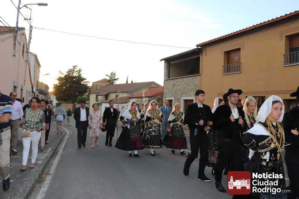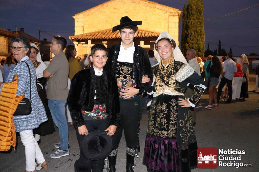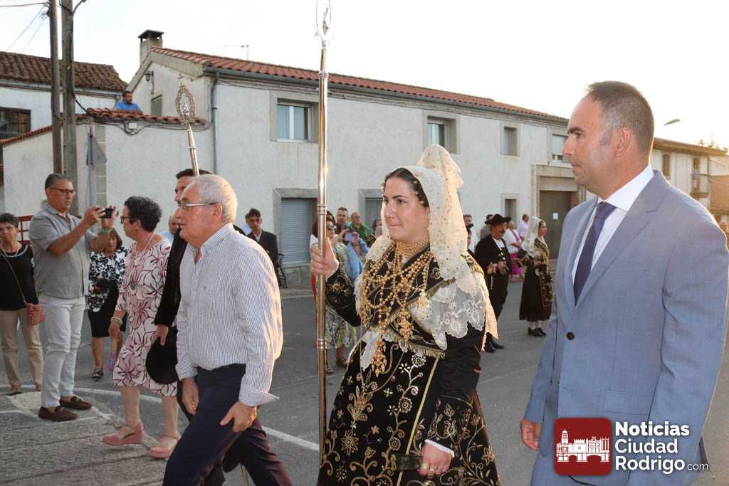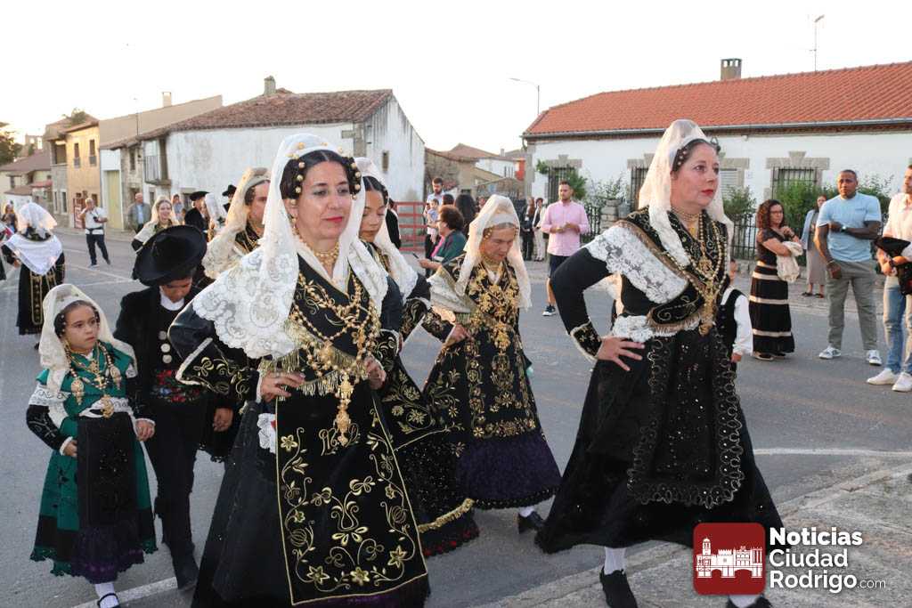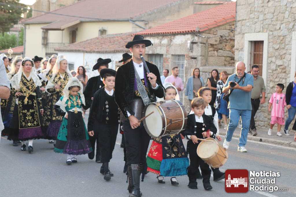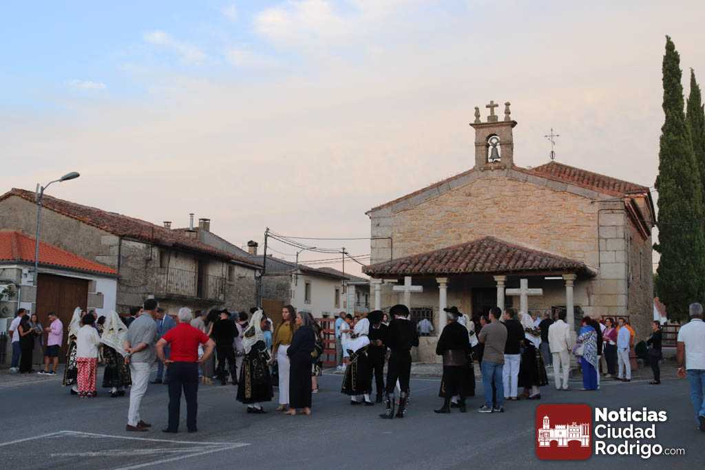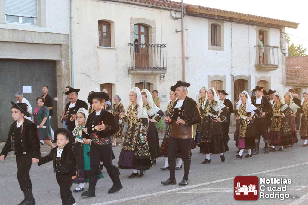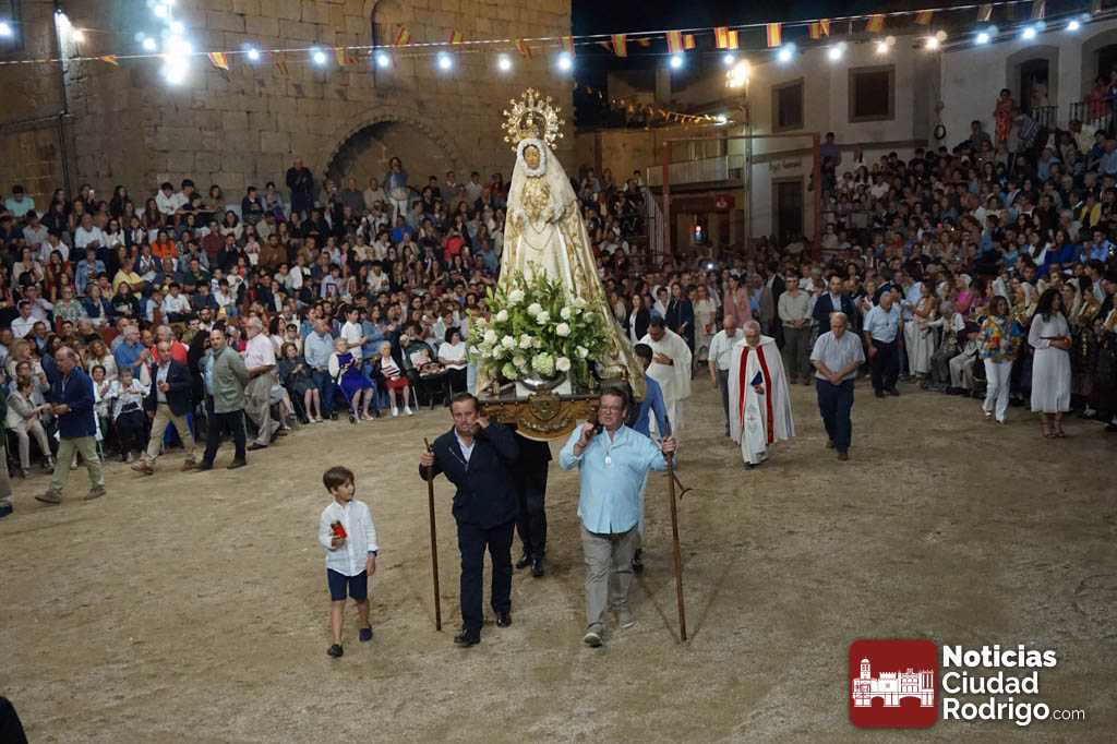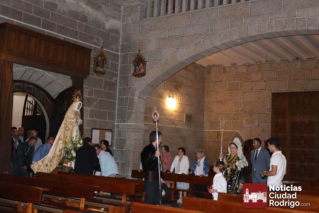 A las nueve de la noche, comienza la novena en la ermita y el Santo Rosario. Los mayordomos, Eva y Javier, acompañados por el sacerdote párroco Jesús Gutiérrez han llegado antes hasta el lugar acompañados de charros y charras de todas las edades al ritmo de la gaita y el tamboril. Al término del rezo, comienza el traslado. El grupo de charros delante, decenas de personas con velas y la Virgen en andas realizando el trayecto procesional hasta la plaza Mayor.