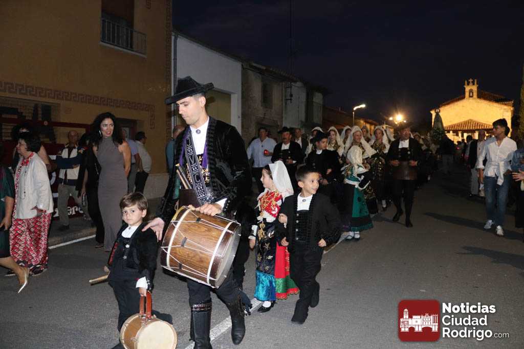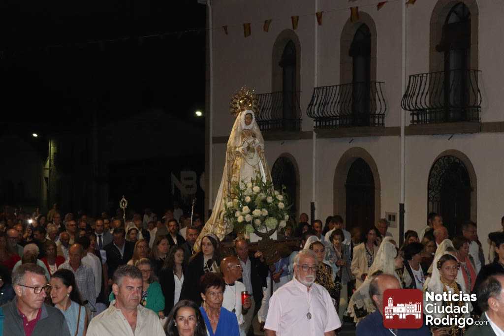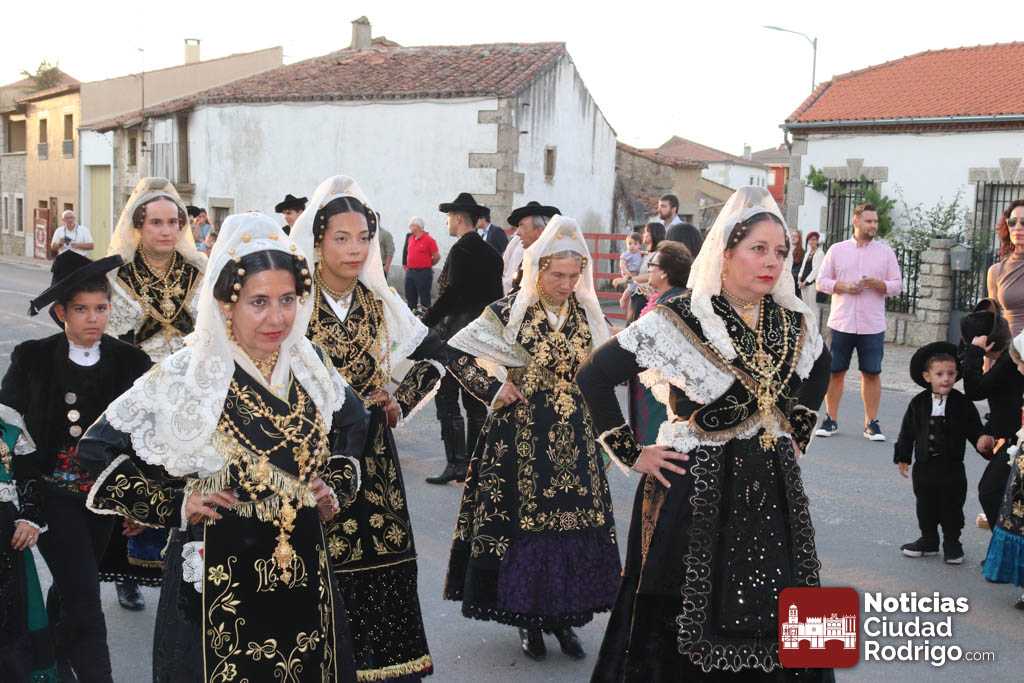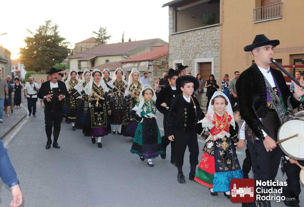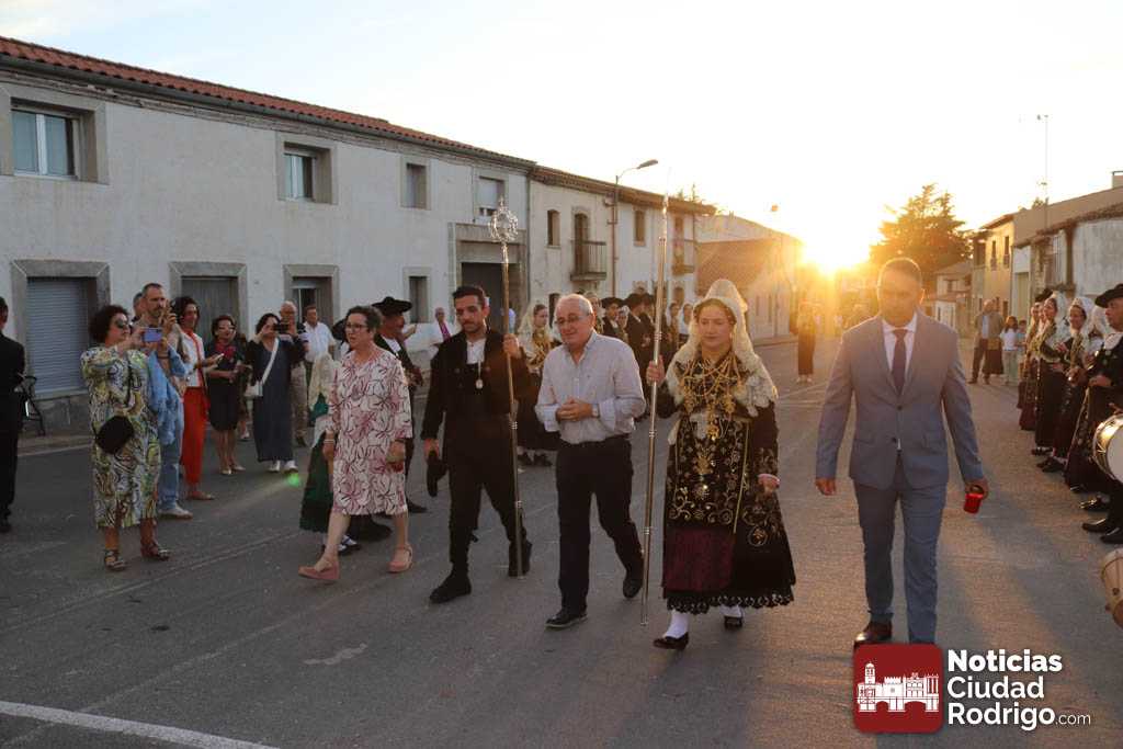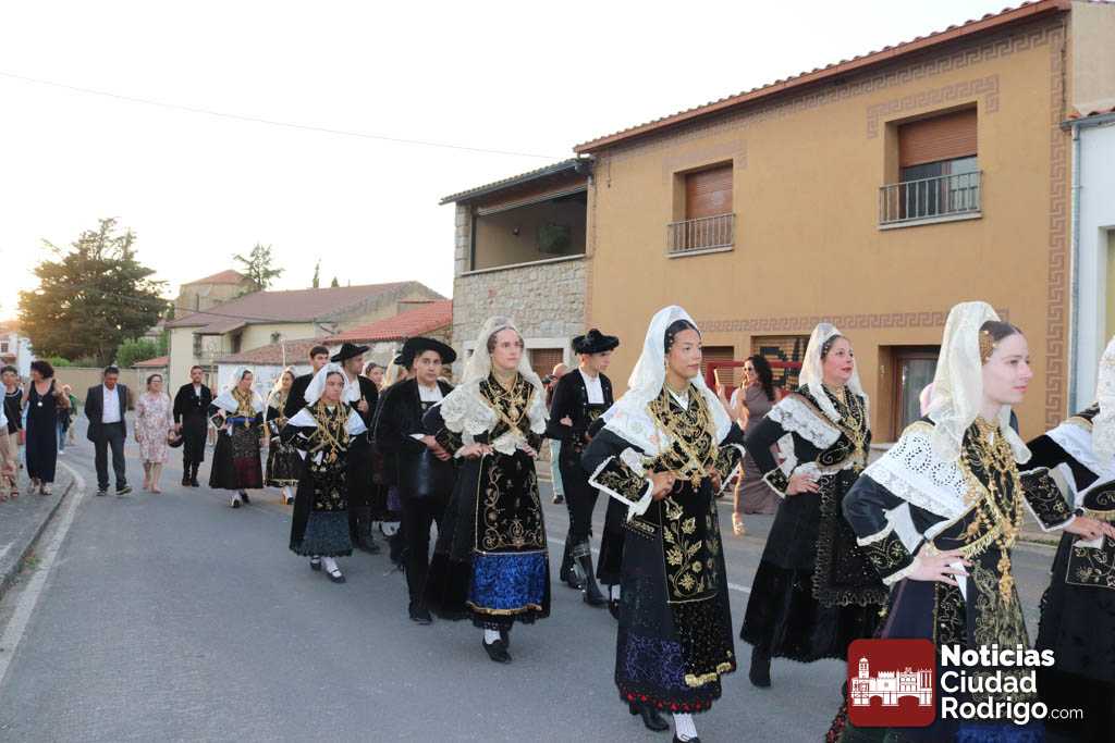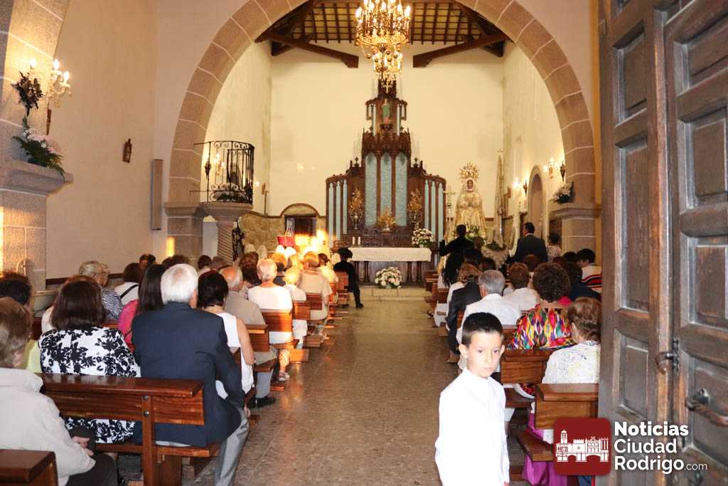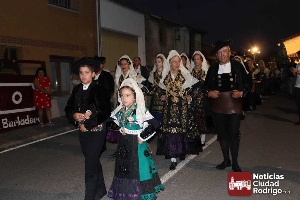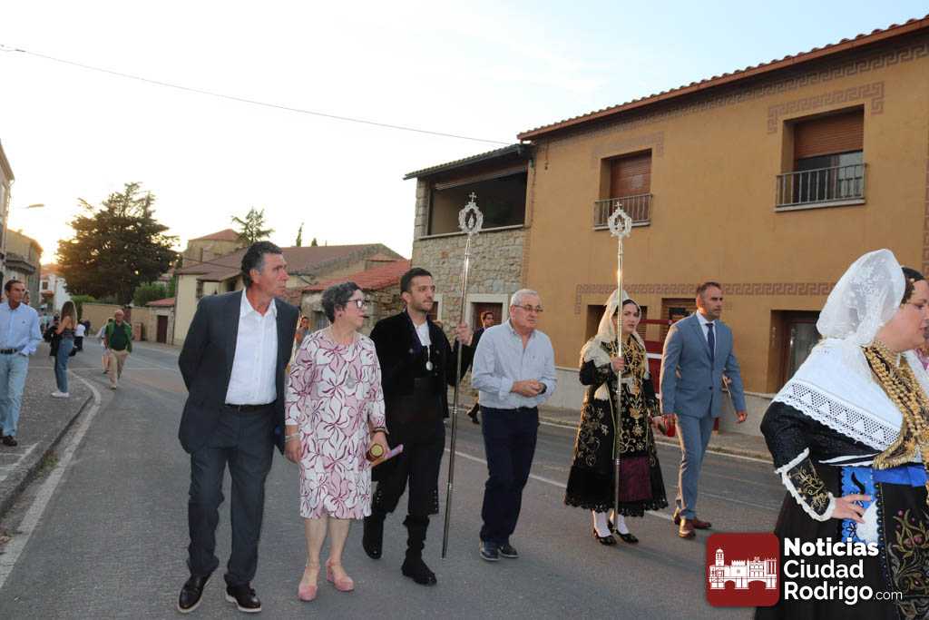 A las nueve de la noche, comienza la novena en la ermita y el Santo Rosario. Los mayordomos, Eva y Javier, acompañados por el sacerdote párroco Jesús Gutiérrez han llegado antes hasta el lugar acompañados de charros y charras de todas las edades al ritmo de la gaita y el tamboril. Al término del rezo, comienza el traslado. El grupo de charros delante, decenas de personas con velas y la Virgen en andas realizando el trayecto procesional hasta la plaza Mayor.