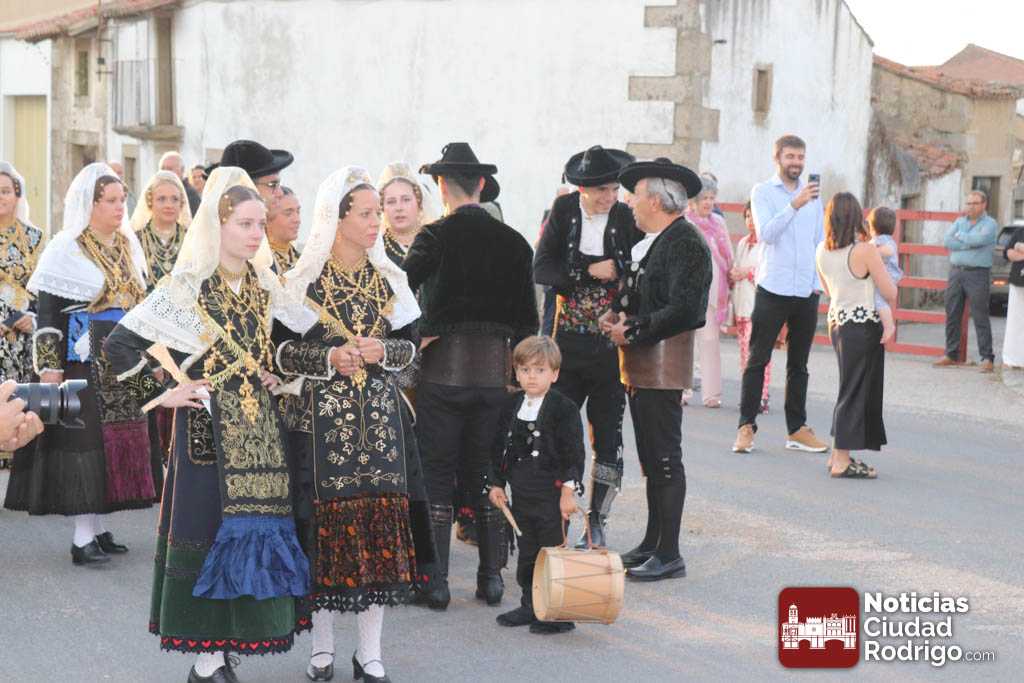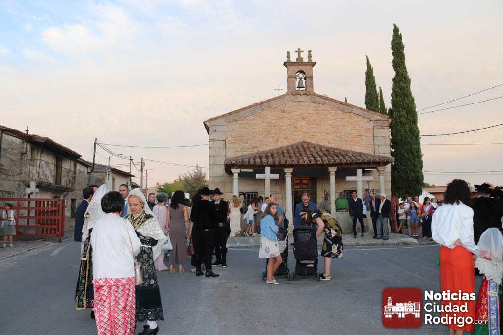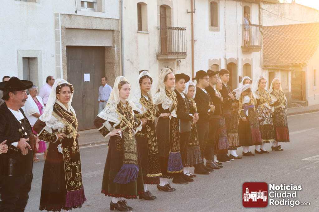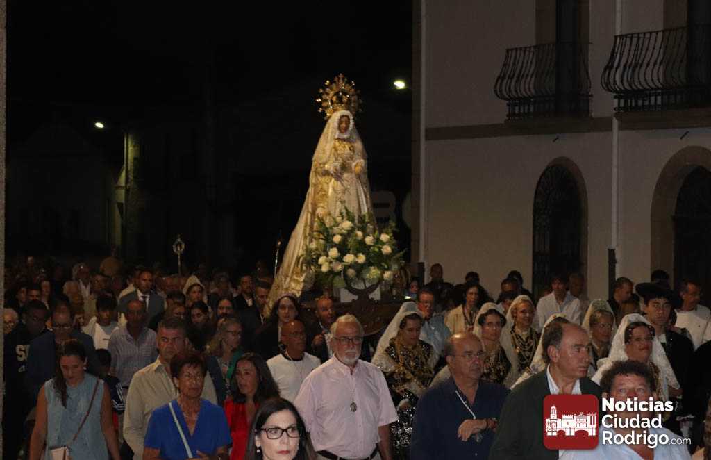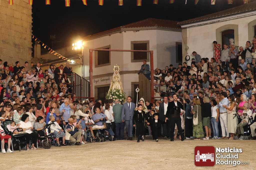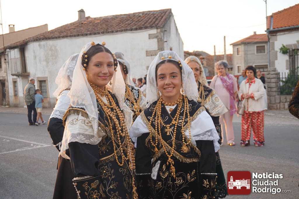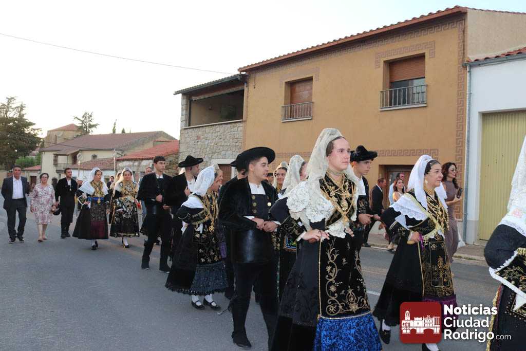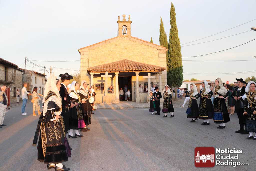 A las nueve de la noche, comienza la novena en la ermita y el Santo Rosario. Los mayordomos, Eva y Javier, acompañados por el sacerdote párroco Jesús Gutiérrez han llegado antes hasta el lugar acompañados de charros y charras de todas las edades al ritmo de la gaita y el tamboril. Al término del rezo, comienza el traslado. El grupo de charros delante, decenas de personas con velas y la Virgen en andas realizando el trayecto procesional hasta la plaza Mayor.