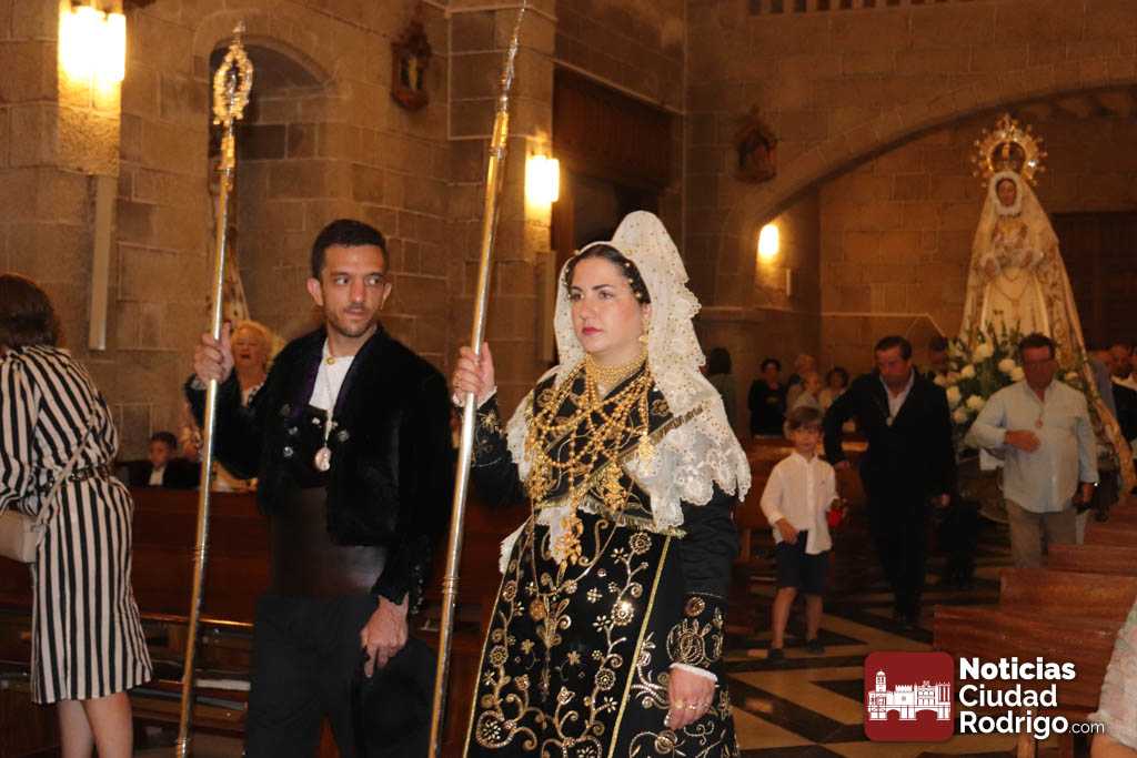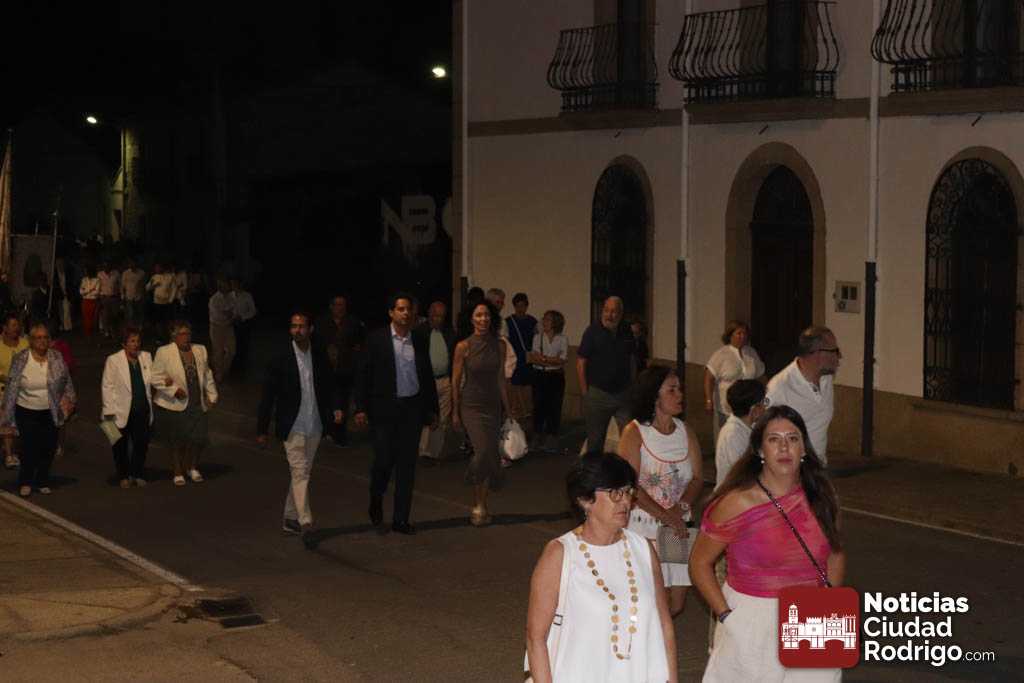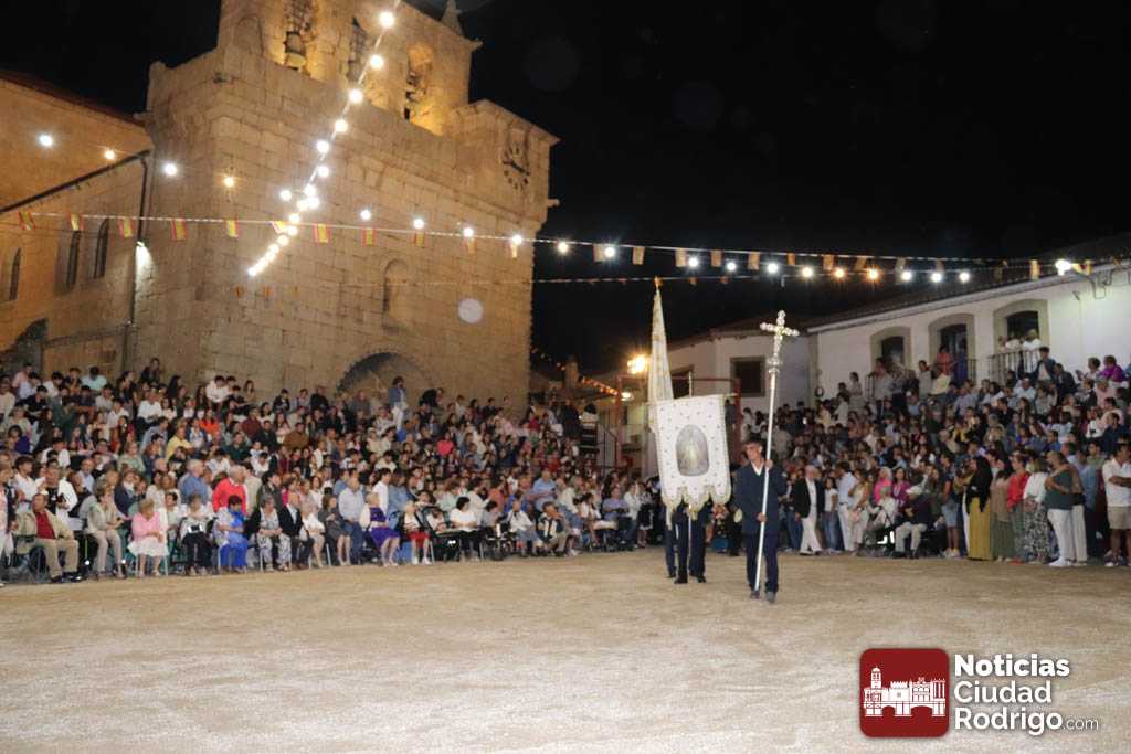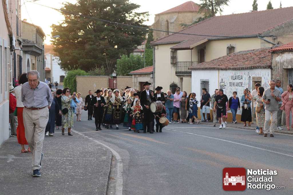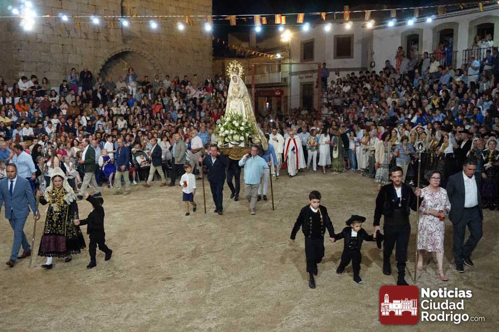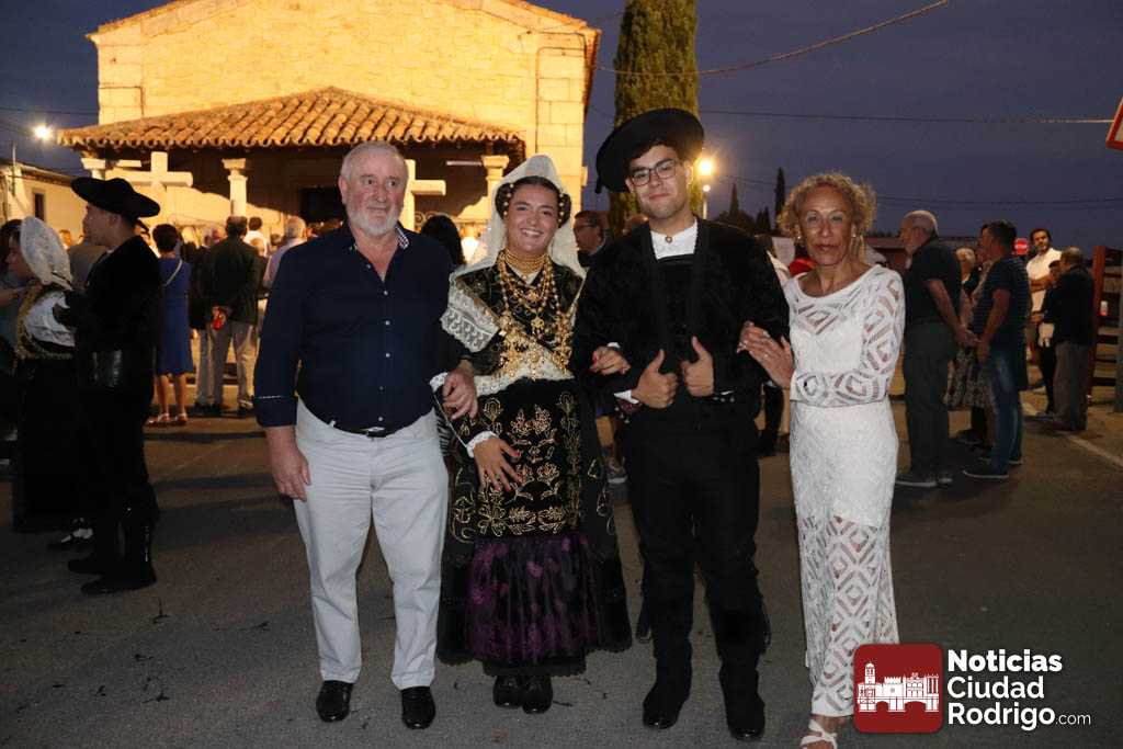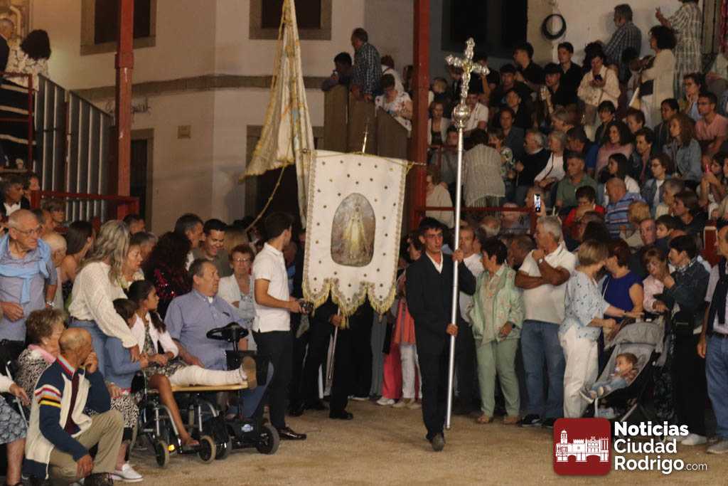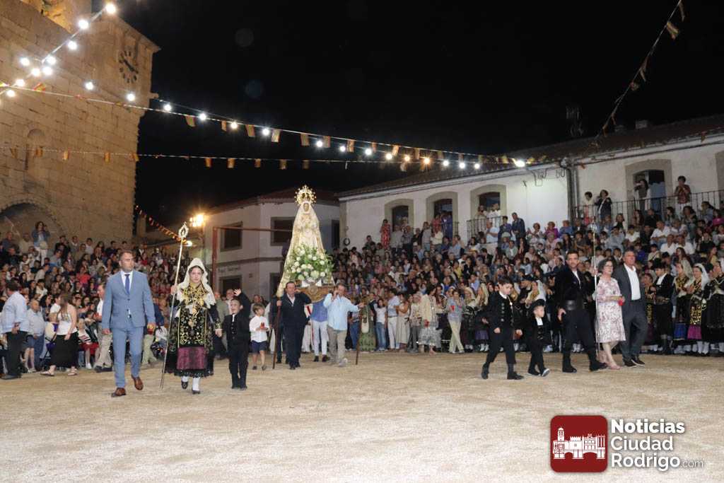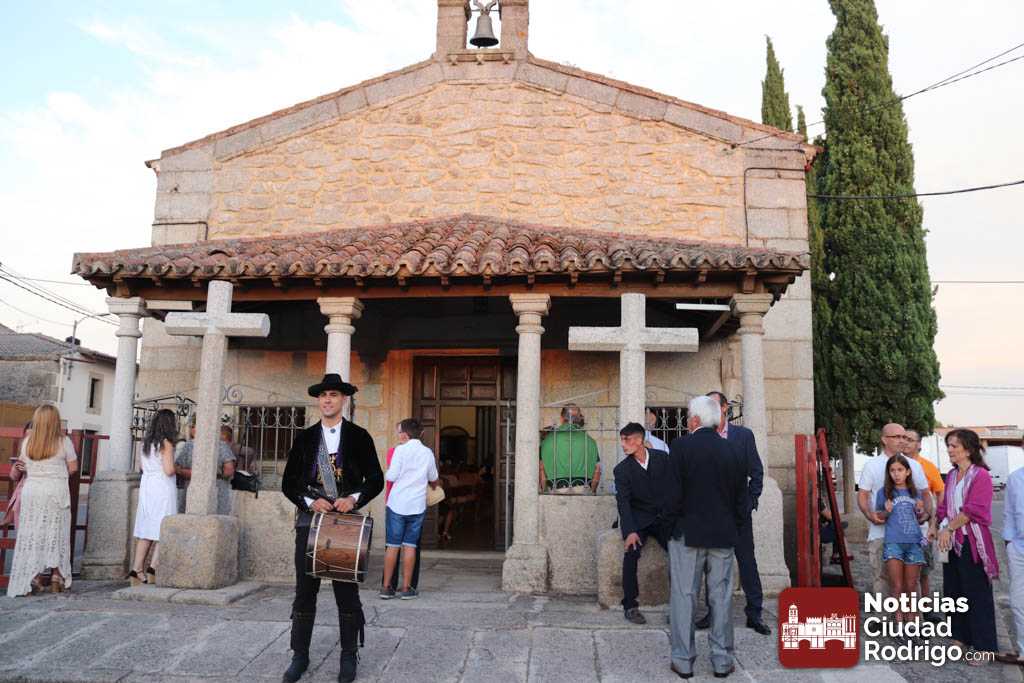 A las nueve de la noche, comienza la novena en la ermita y el Santo Rosario. Los mayordomos, Eva y Javier, acompañados por el sacerdote párroco Jesús Gutiérrez han llegado antes hasta el lugar acompañados de charros y charras de todas las edades al ritmo de la gaita y el tamboril. Al término del rezo, comienza el traslado. El grupo de charros delante, decenas de personas con velas y la Virgen en andas realizando el trayecto procesional hasta la plaza Mayor.
