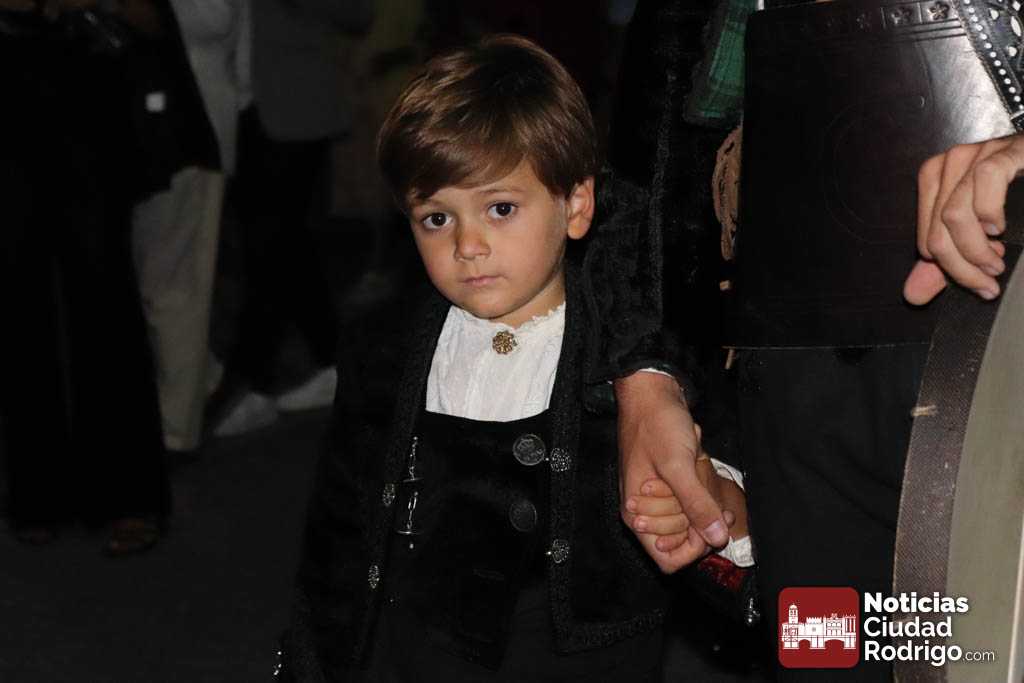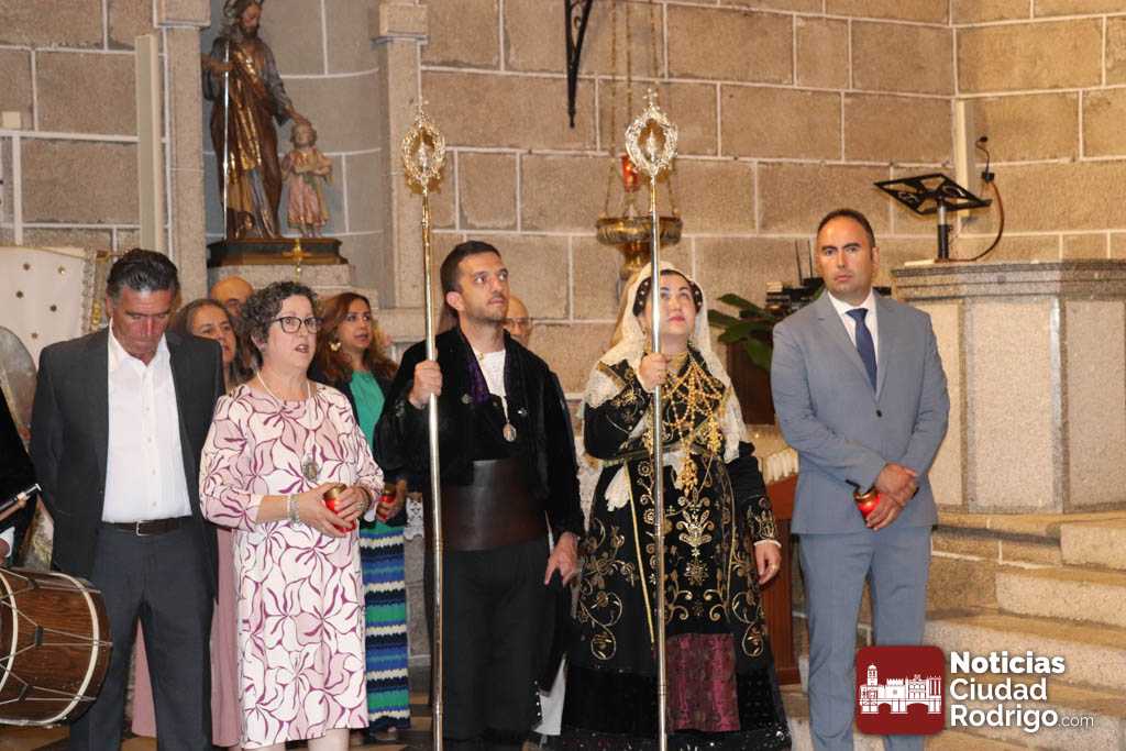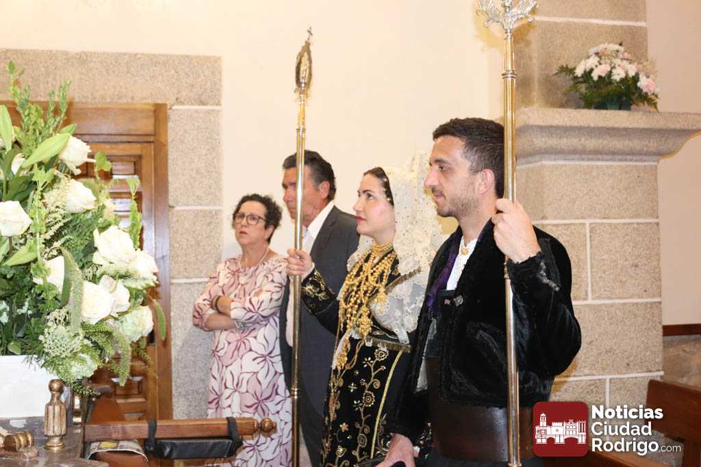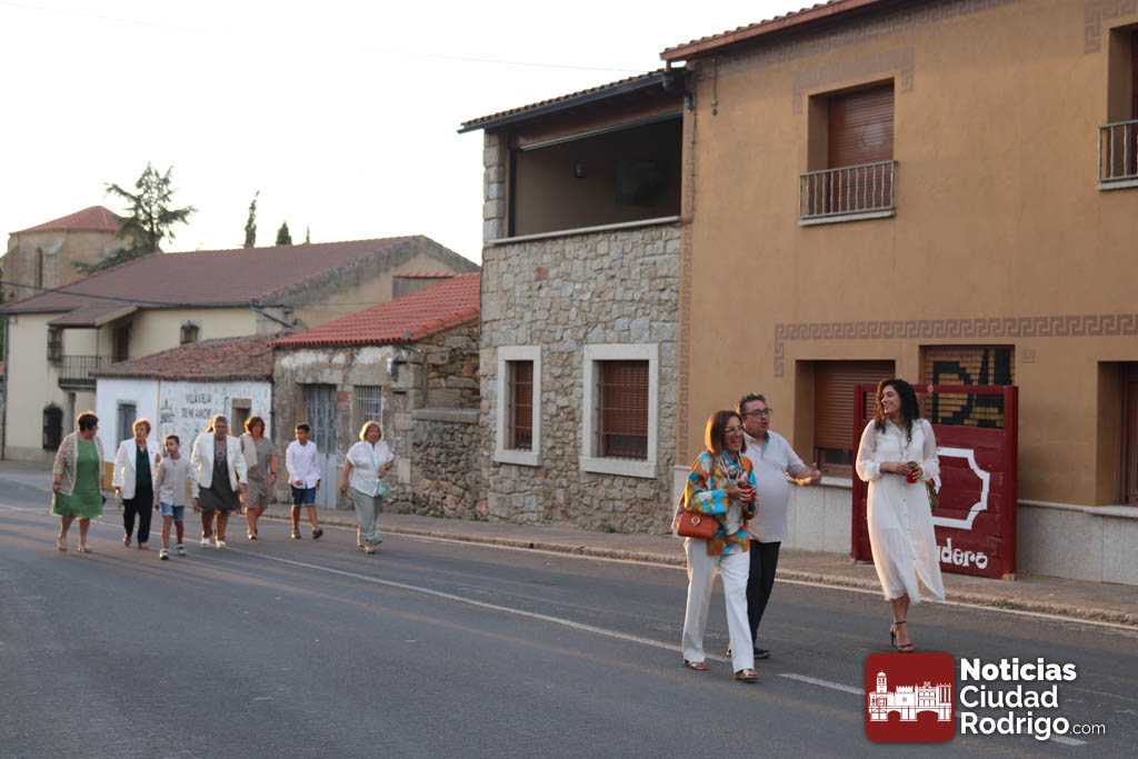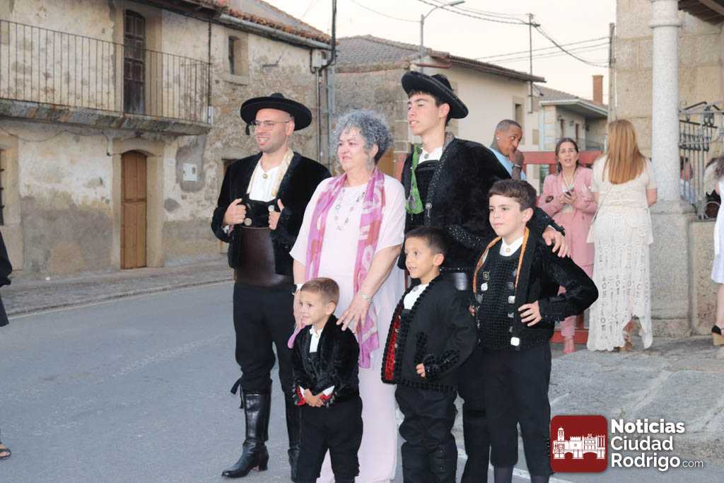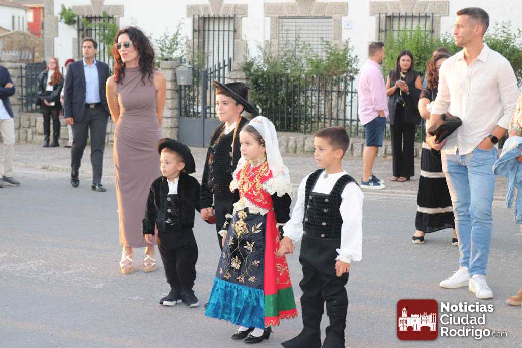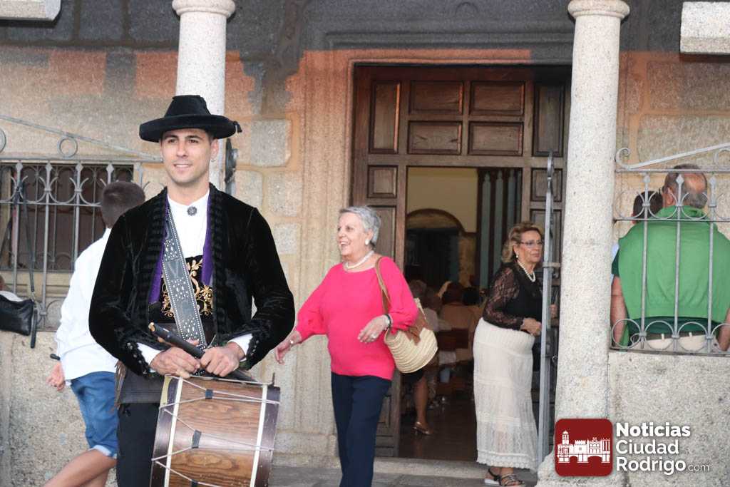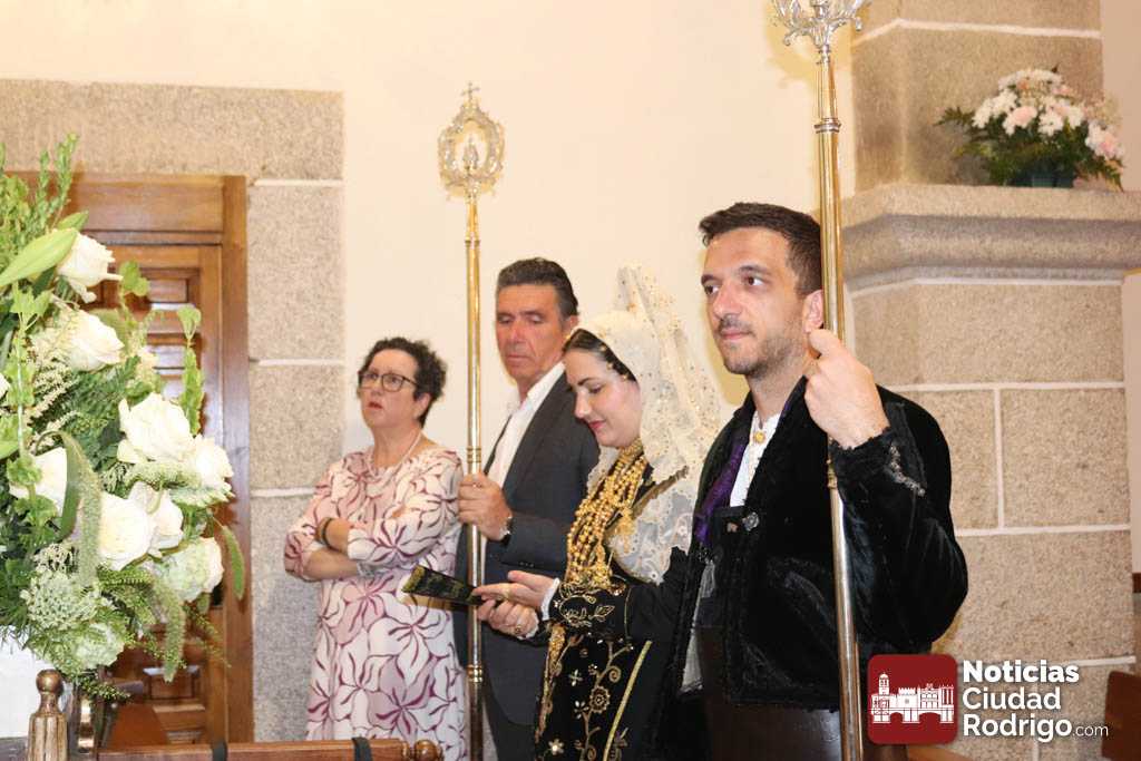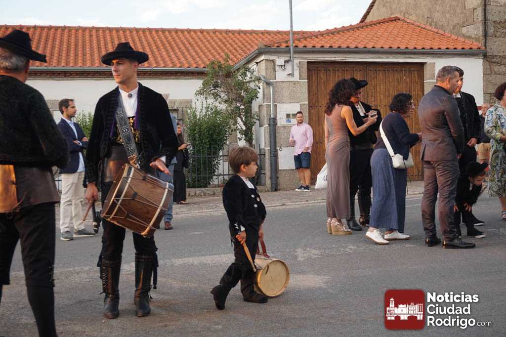 A las nueve de la noche, comienza la novena en la ermita y el Santo Rosario. Los mayordomos, Eva y Javier, acompañados por el sacerdote párroco Jesús Gutiérrez han llegado antes hasta el lugar acompañados de charros y charras de todas las edades al ritmo de la gaita y el tamboril. Al término del rezo, comienza el traslado. El grupo de charros delante, decenas de personas con velas y la Virgen en andas realizando el trayecto procesional hasta la plaza Mayor.