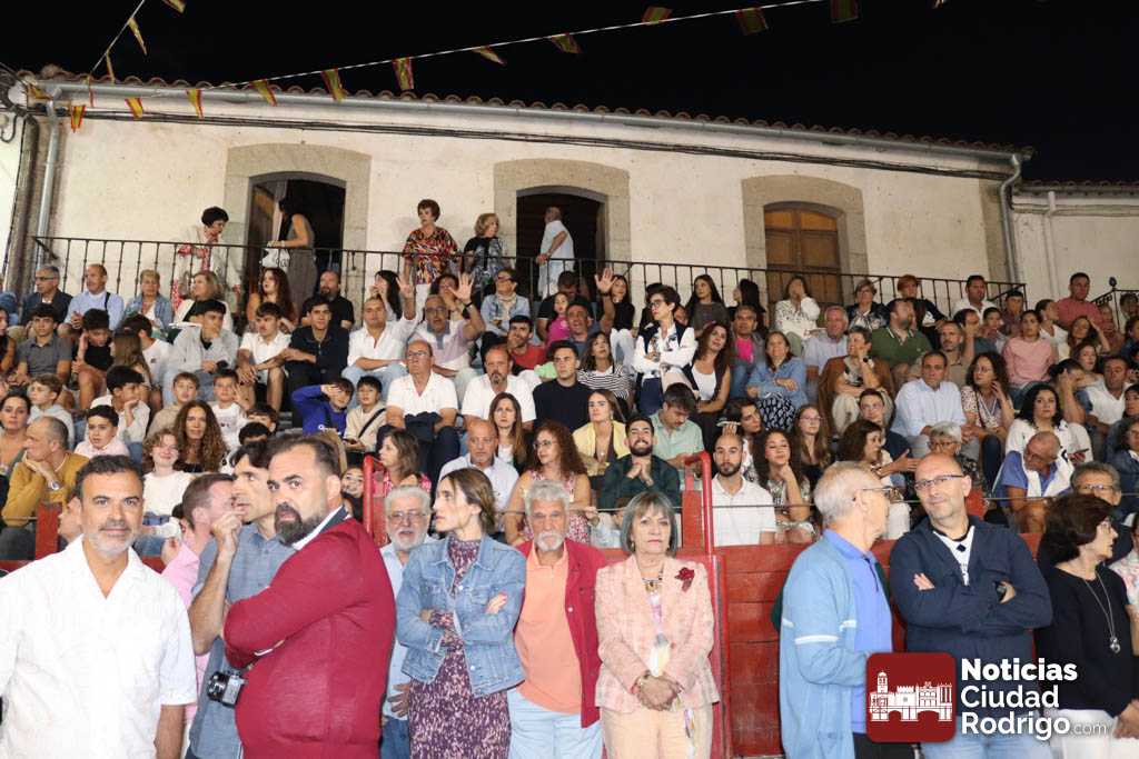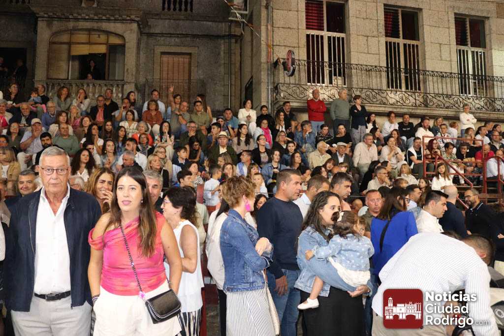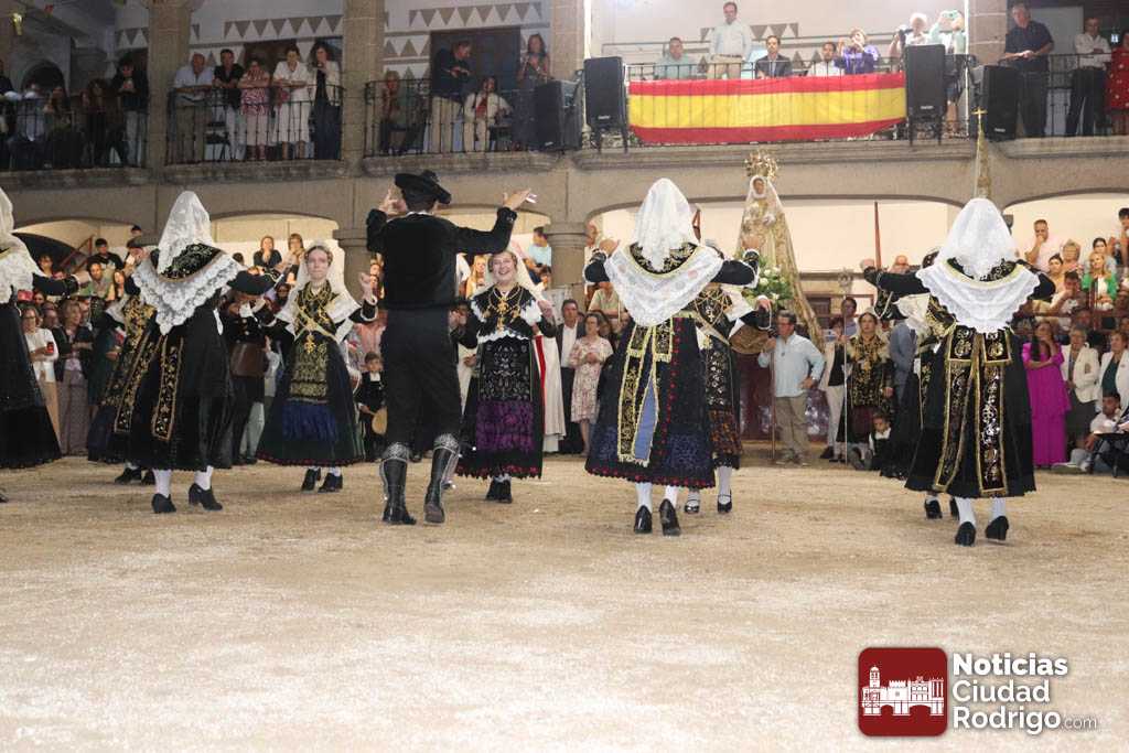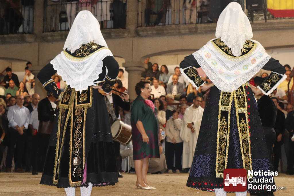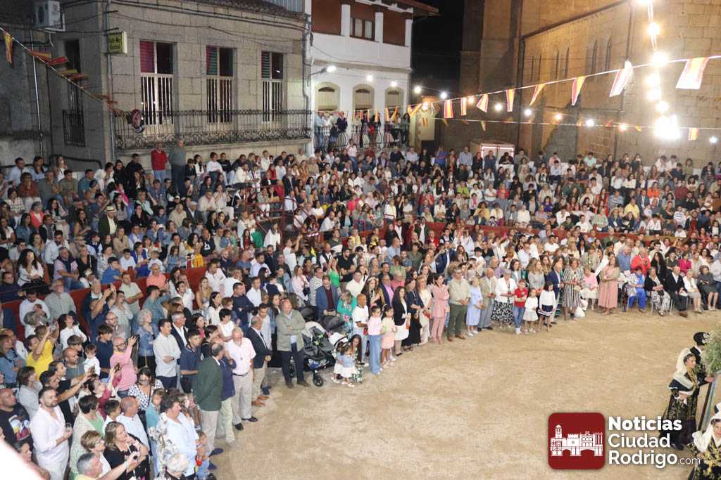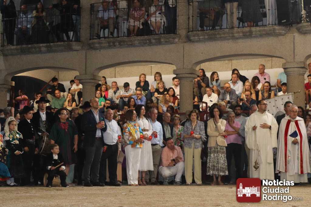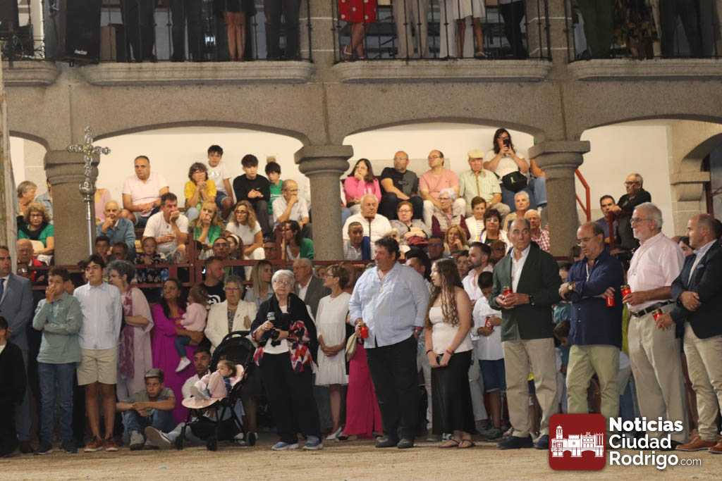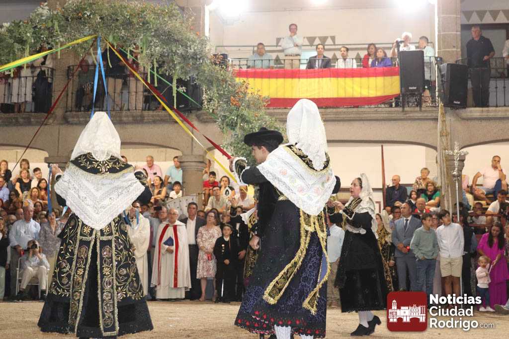 Repican las campanas de la imponente y hermosa iglesia gótica, aplausos generalizados al entrar en la plaza Mayor cuando la comitiva entra en la plaza Mayor. Después el cántico de una Salve y a continuación silencio para escuchar las palabras que desde el balcón de la casa central en esta ocasión ofrecen Carlos Velasco y Ángel Moro, que están acompañados por la alcaldesa Dory Giner. Y tras las palabras, el momento de exaltación de la charrería con el Baile del Cordón, danzado por ocho mujeres. Un baile más y un extra de la mano de María José Calderero y el niño Martín.