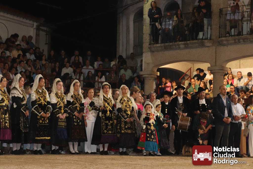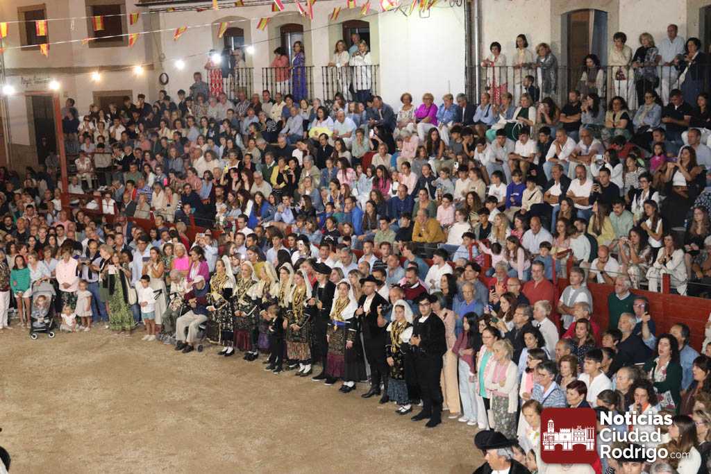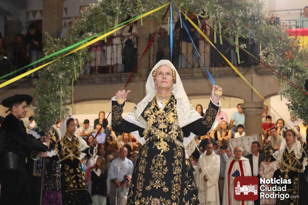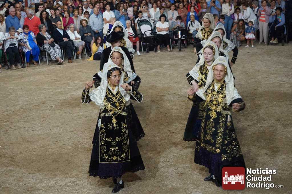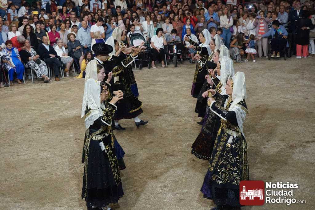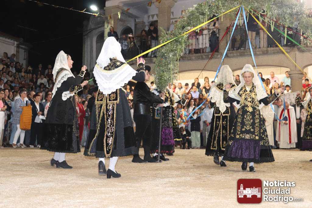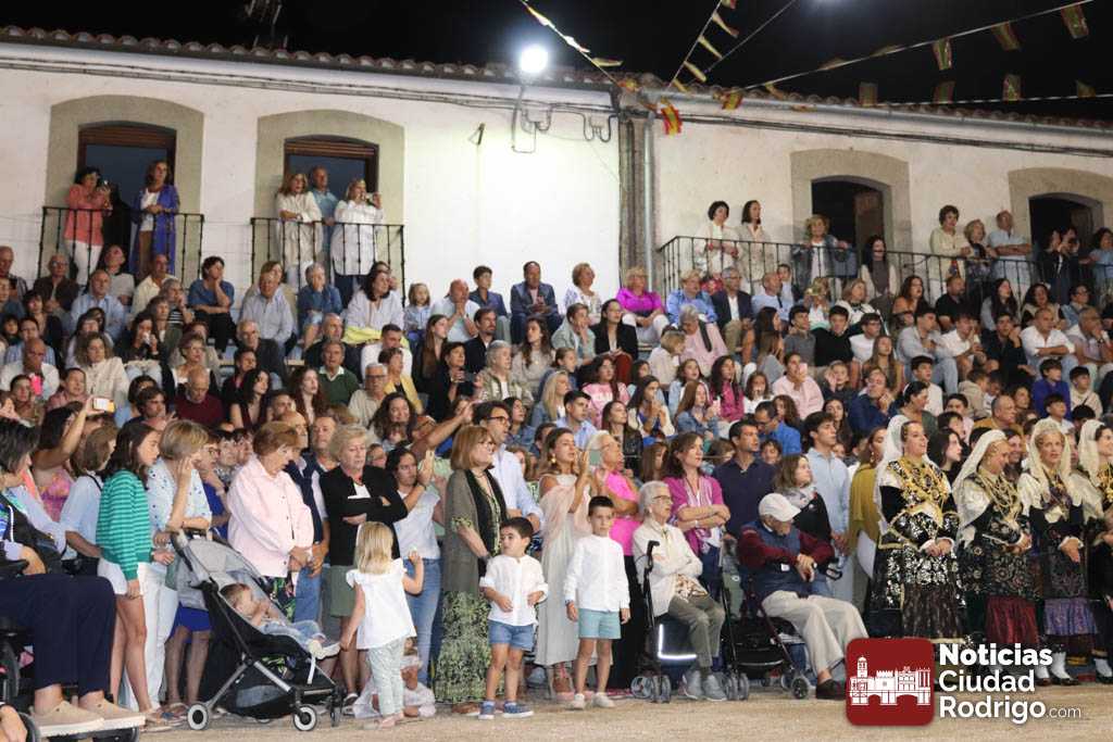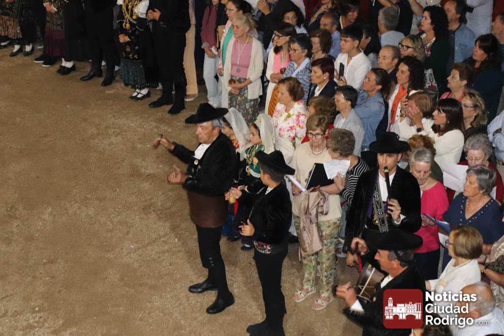Repican las campanas de la imponente y hermosa iglesia gótica, aplausos generalizados al entrar en la plaza Mayor cuando la comitiva entra en la plaza Mayor. Después el cántico de una Salve y a continuación silencio para escuchar las palabras que desde el balcón de la casa central en esta ocasión ofrecen Carlos Velasco y Ángel Moro, que están acompañados por la alcaldesa Dory Giner. Y tras las palabras, el momento de exaltación de la charrería con el Baile del Cordón, danzado por ocho mujeres. Un baile más y un extra de la mano de María José Calderero y el niño Martín.
