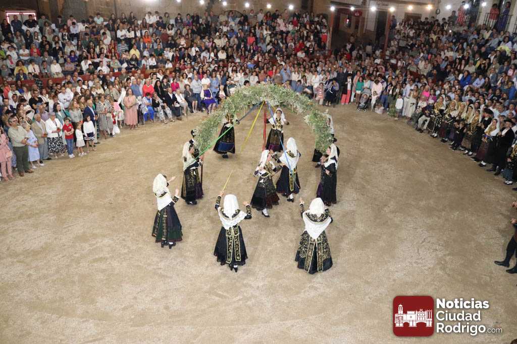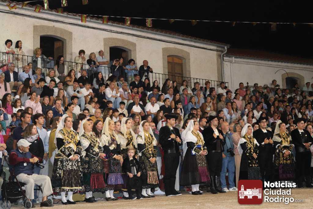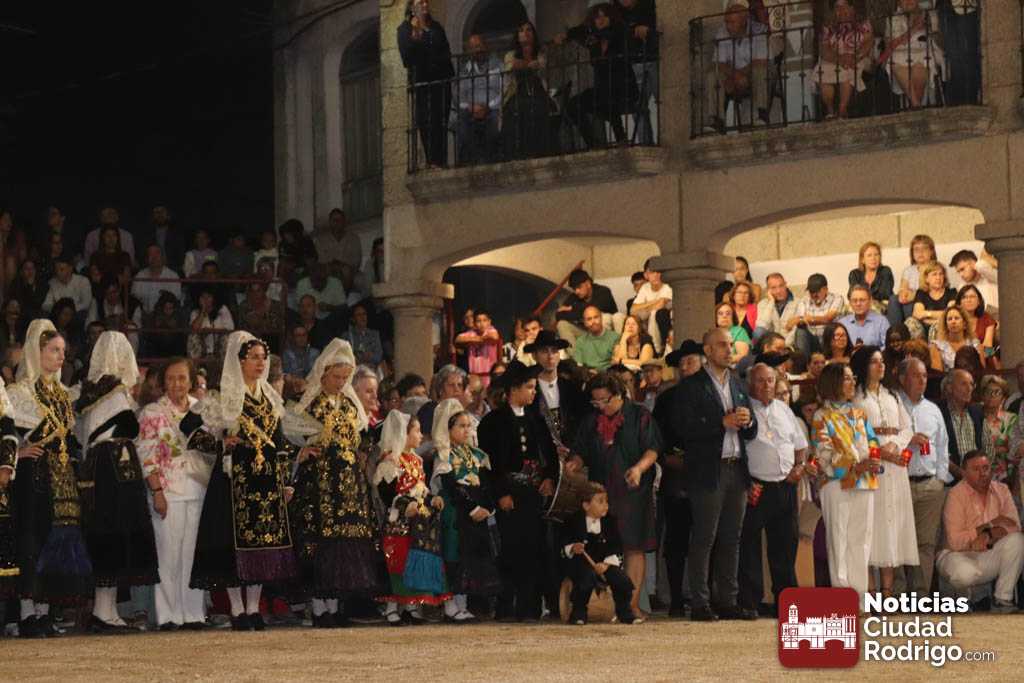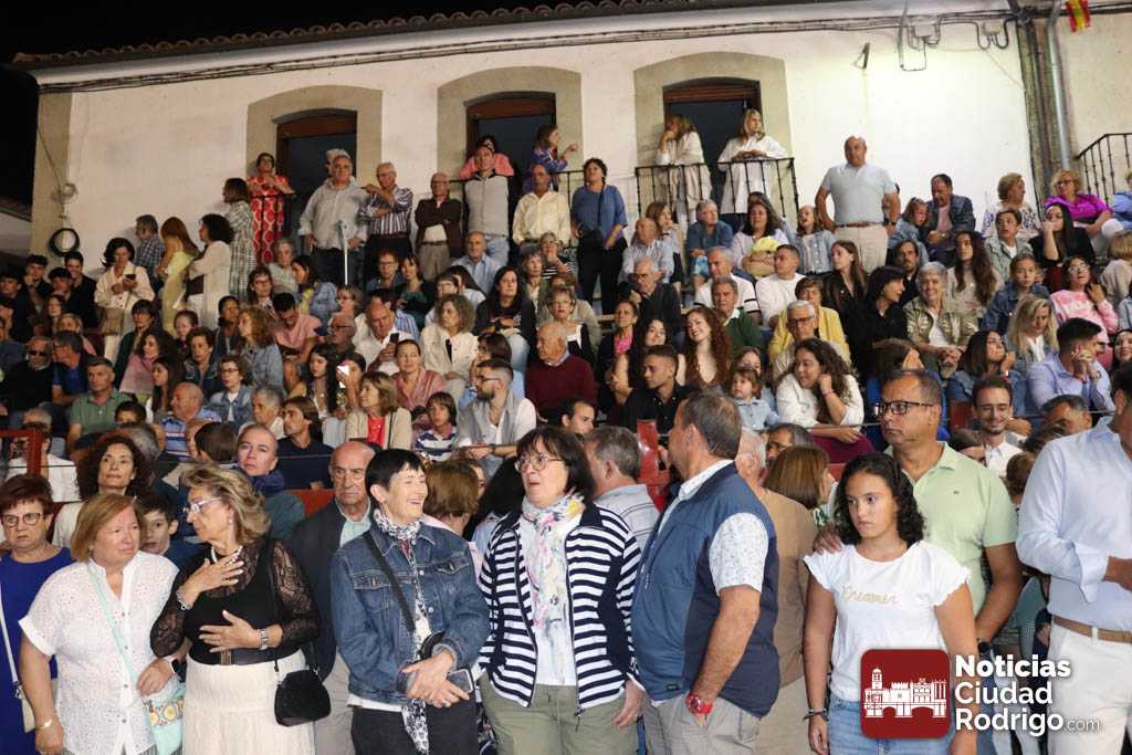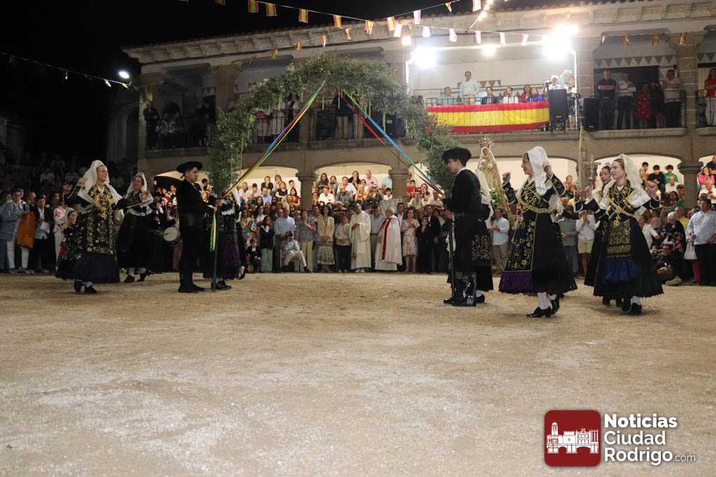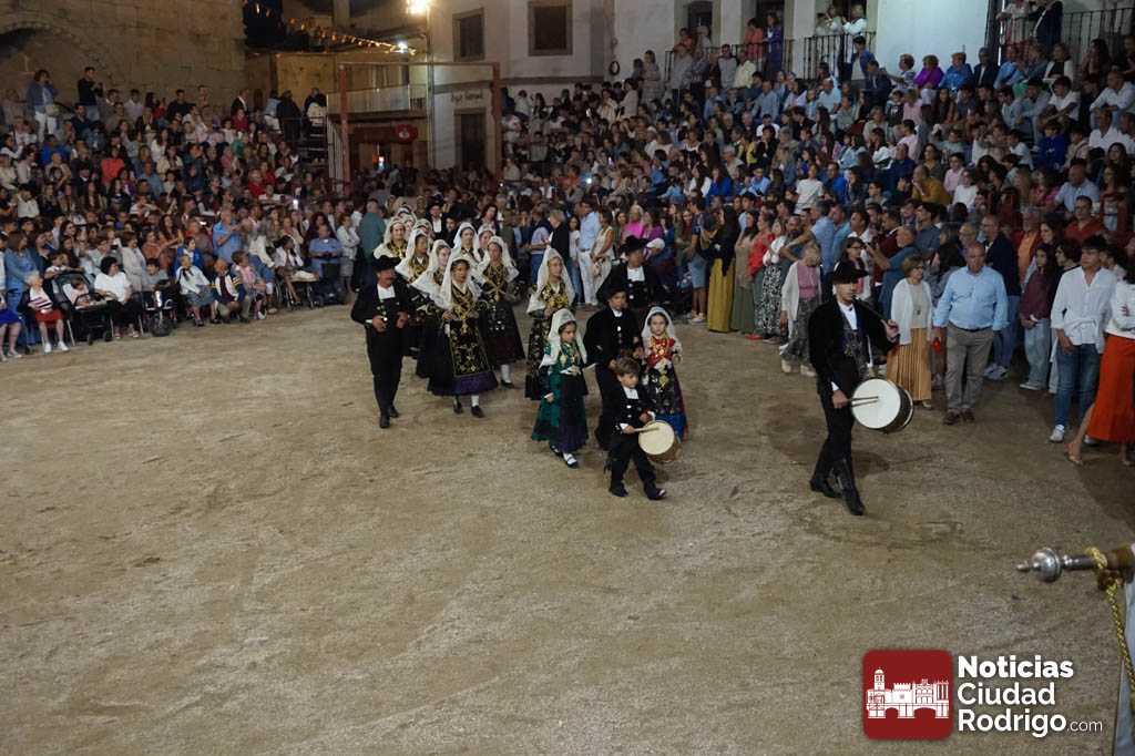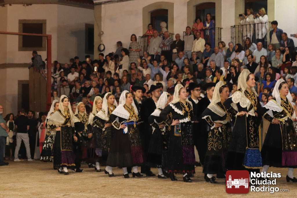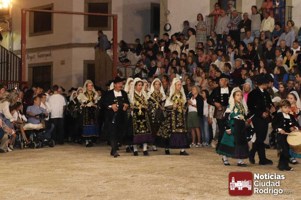 Repican las campanas de la imponente y hermosa iglesia gótica, aplausos generalizados al entrar en la plaza Mayor cuando la comitiva entra en la plaza Mayor. Después el cántico de una Salve y a continuación silencio para escuchar las palabras que desde el balcón de la casa central en esta ocasión ofrecen Carlos Velasco y Ángel Moro, que están acompañados por la alcaldesa Dory Giner. Y tras las palabras, el momento de exaltación de la charrería con el Baile del Cordón, danzado por ocho mujeres. Un baile más y un extra de la mano de María José Calderero y el niño Martín.