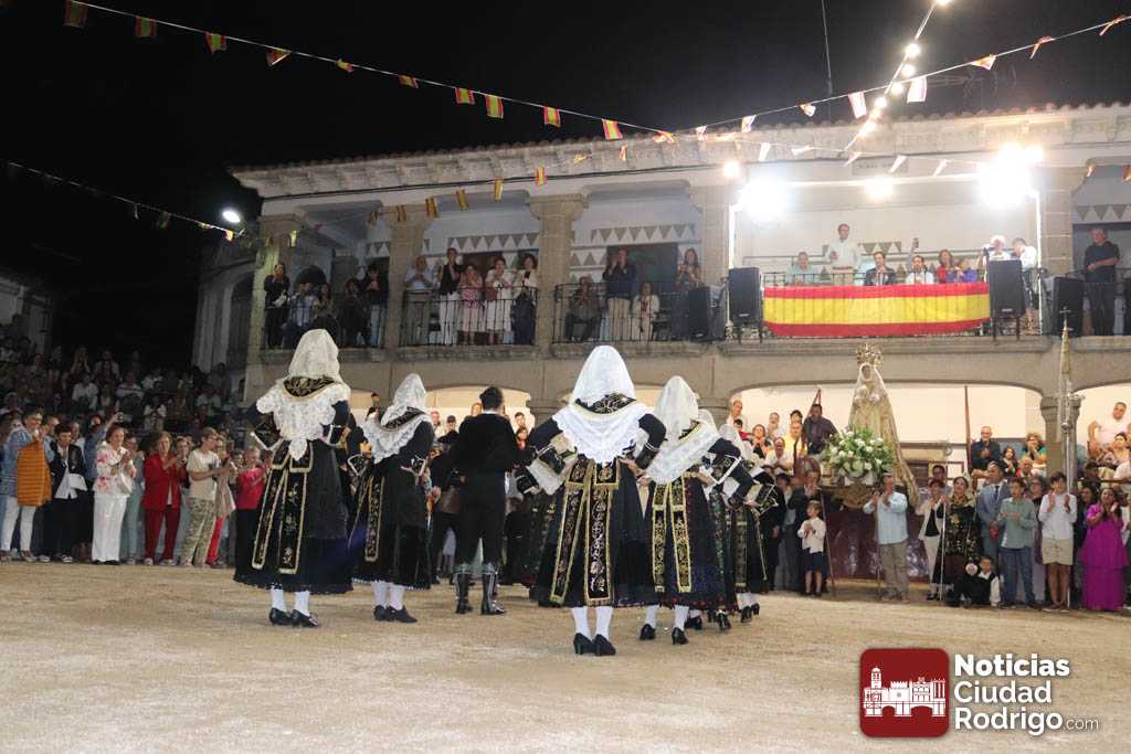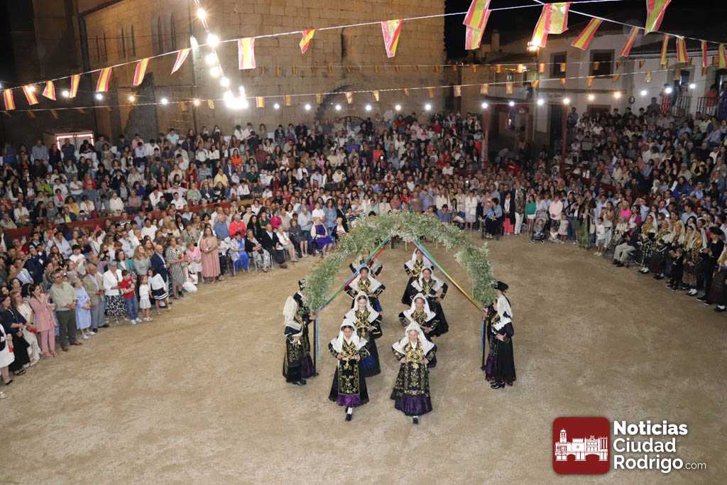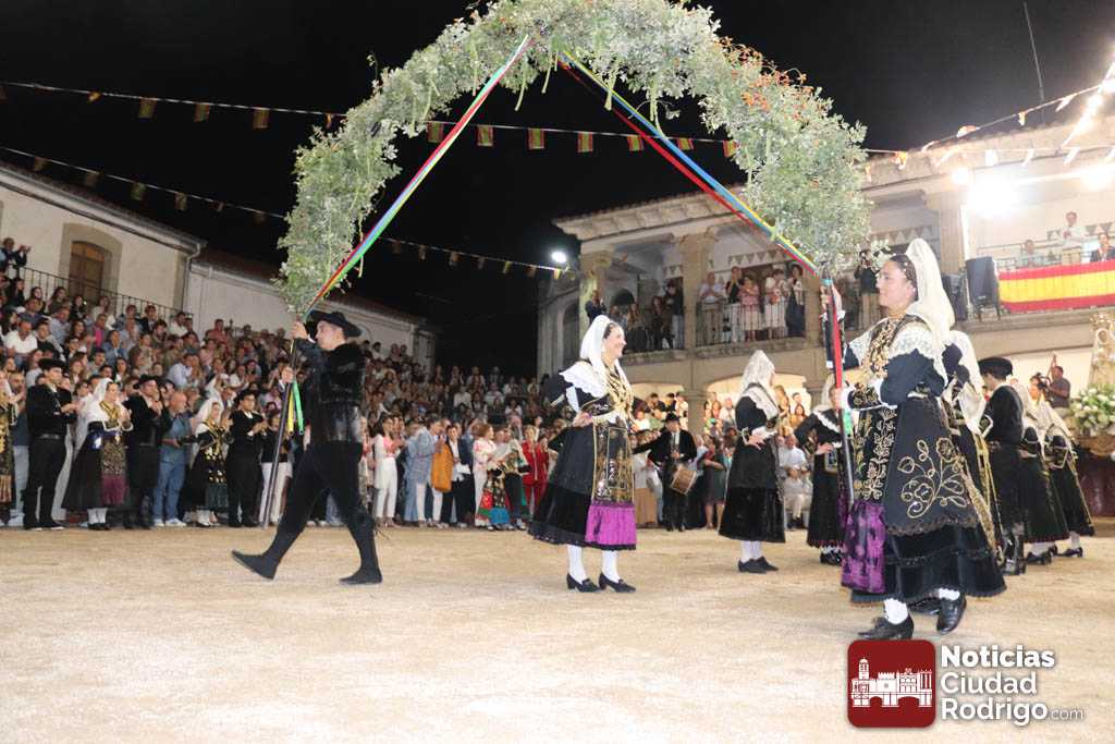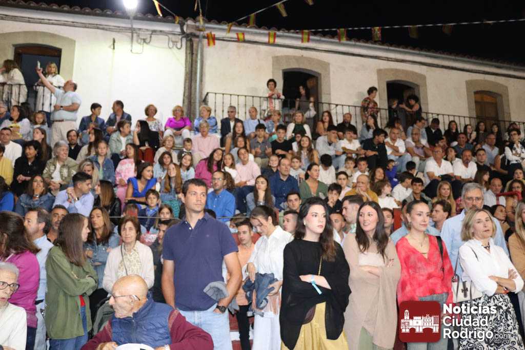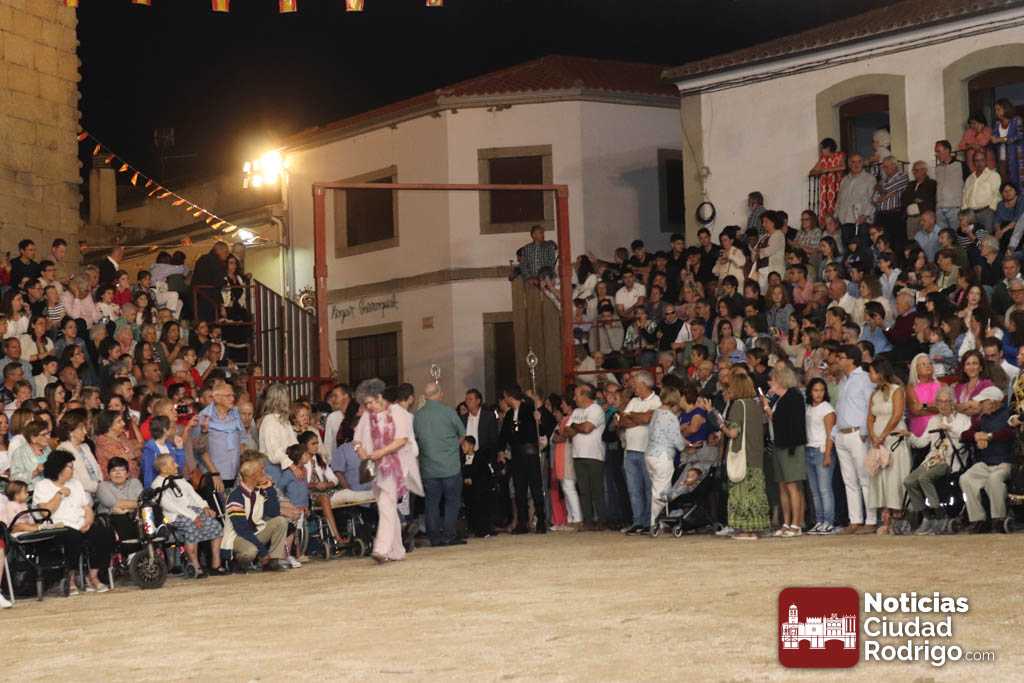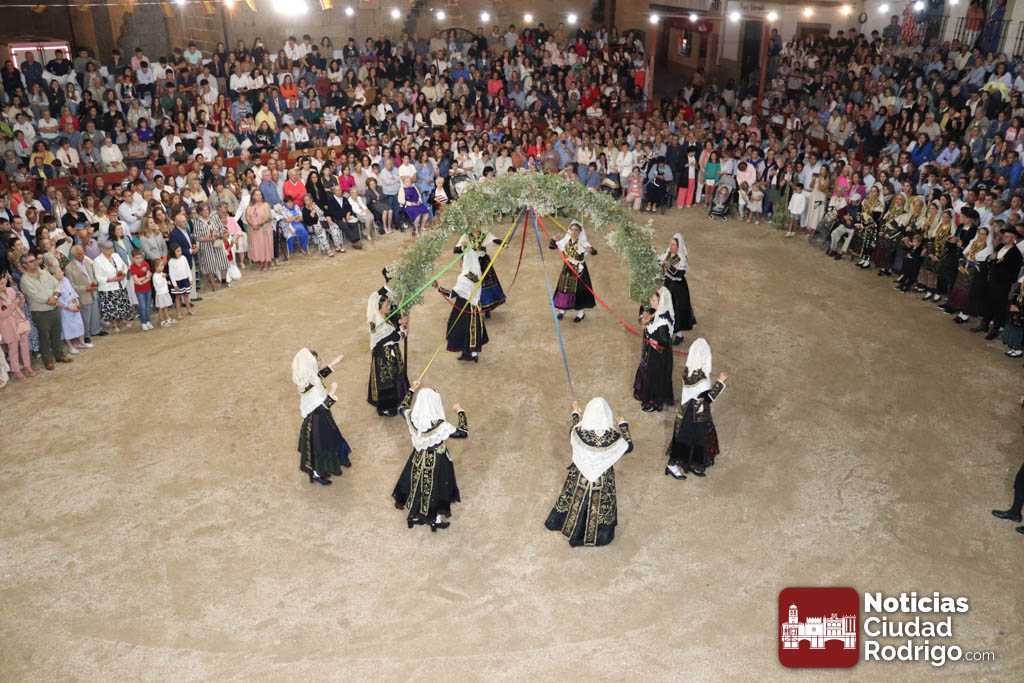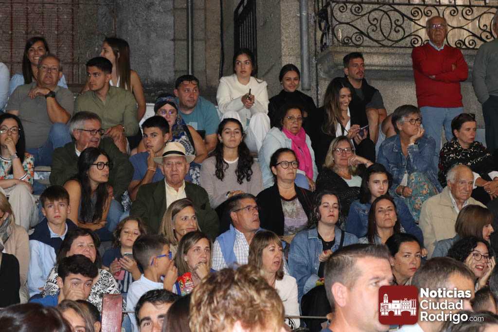 Repican las campanas de la imponente y hermosa iglesia gótica, aplausos generalizados al entrar en la plaza Mayor cuando la comitiva entra en la plaza Mayor. Después el cántico de una Salve y a continuación silencio para escuchar las palabras que desde el balcón de la casa central en esta ocasión ofrecen Carlos Velasco y Ángel Moro, que están acompañados por la alcaldesa Dory Giner. Y tras las palabras, el momento de exaltación de la charrería con el Baile del Cordón, danzado por ocho mujeres. Un baile más y un extra de la mano de María José Calderero y el niño Martín.