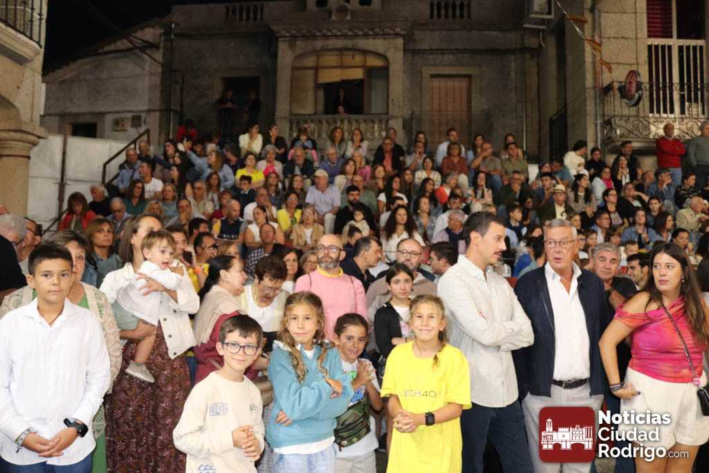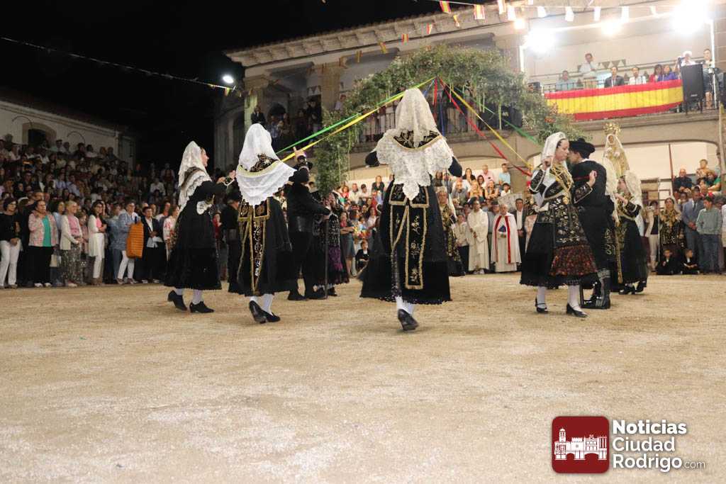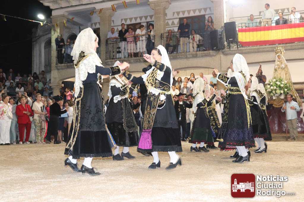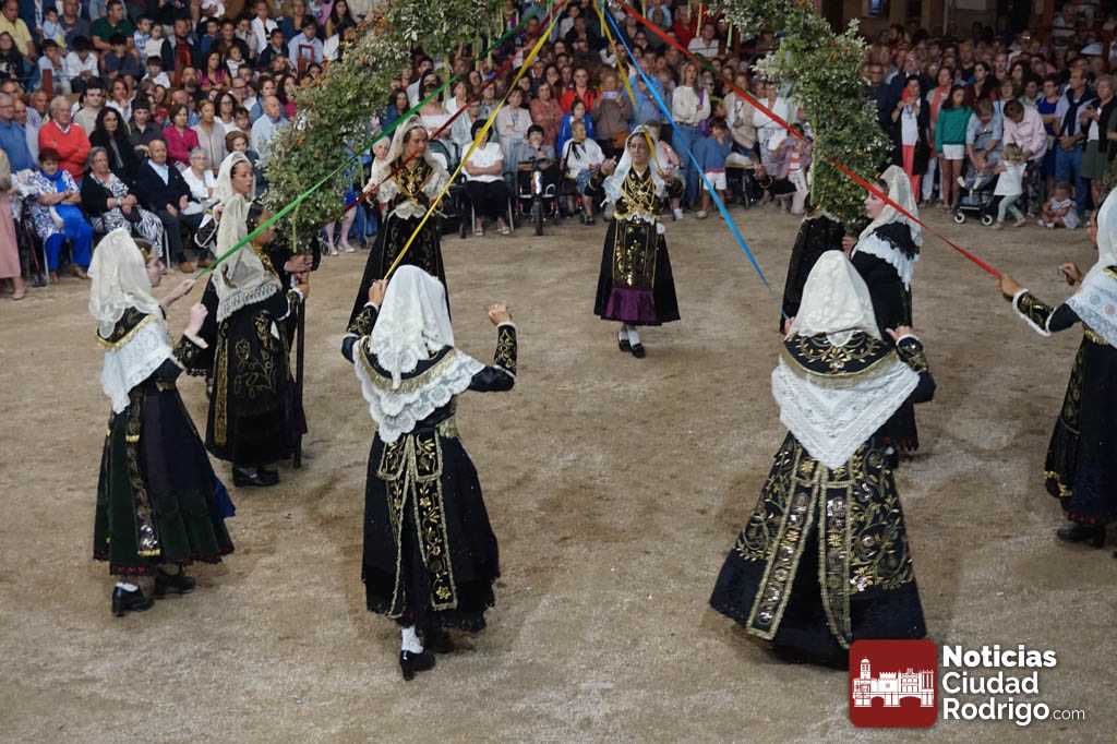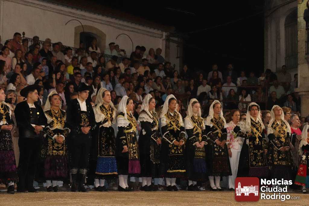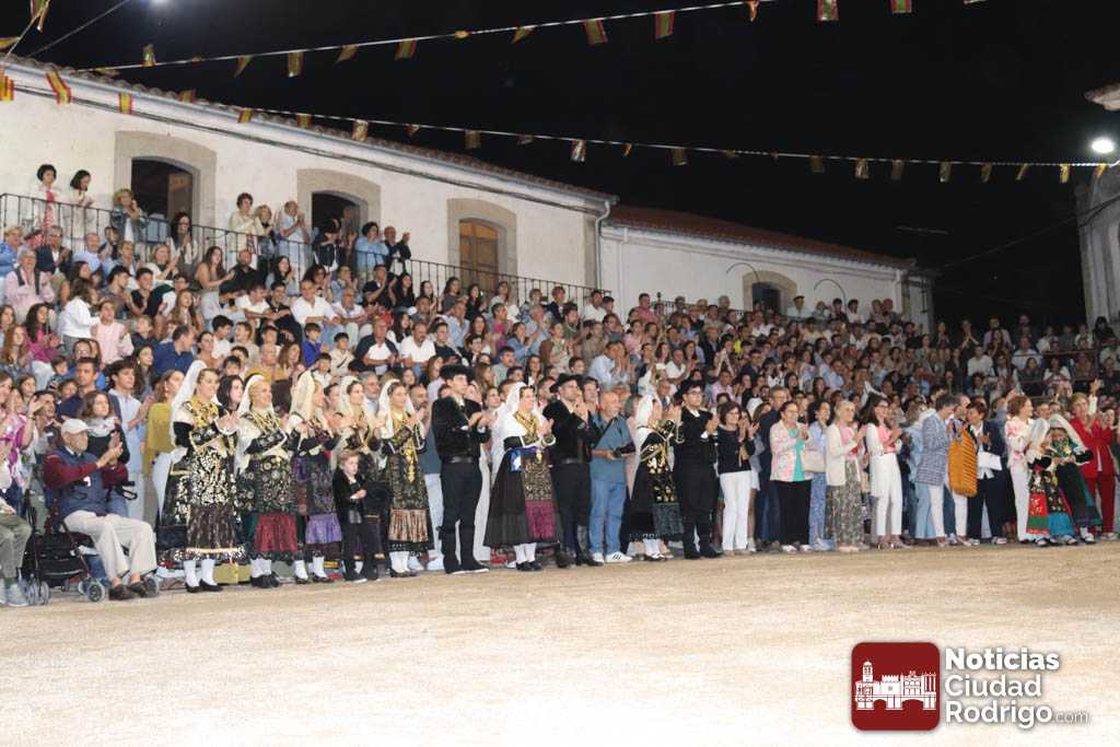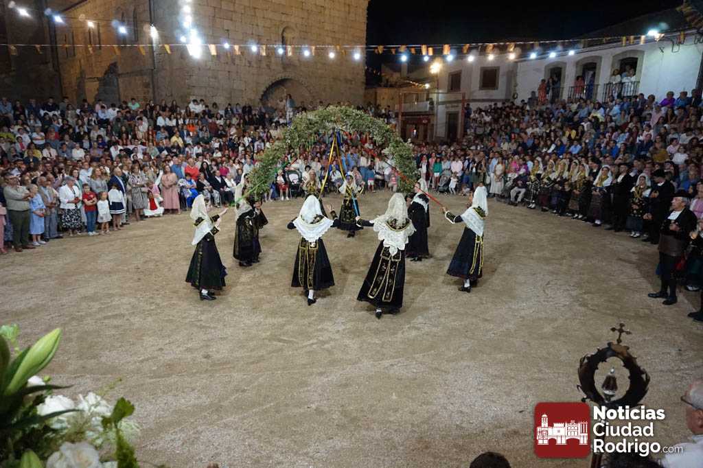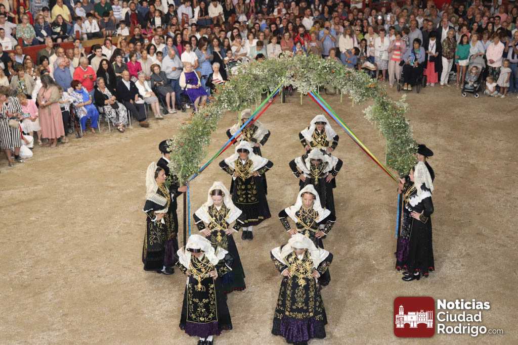 Repican las campanas de la imponente y hermosa iglesia gótica, aplausos generalizados al entrar en la plaza Mayor cuando la comitiva entra en la plaza Mayor. Después el cántico de una Salve y a continuación silencio para escuchar las palabras que desde el balcón de la casa central en esta ocasión ofrecen Carlos Velasco y Ángel Moro, que están acompañados por la alcaldesa Dory Giner. Y tras las palabras, el momento de exaltación de la charrería con el Baile del Cordón, danzado por ocho mujeres. Un baile más y un extra de la mano de María José Calderero y el niño Martín.