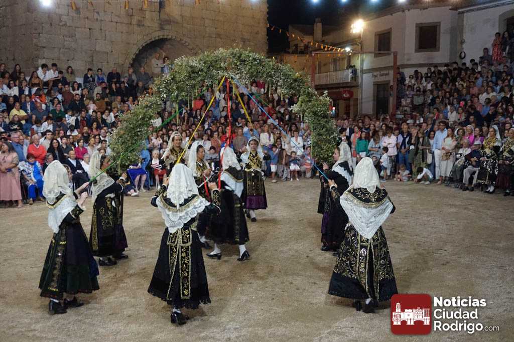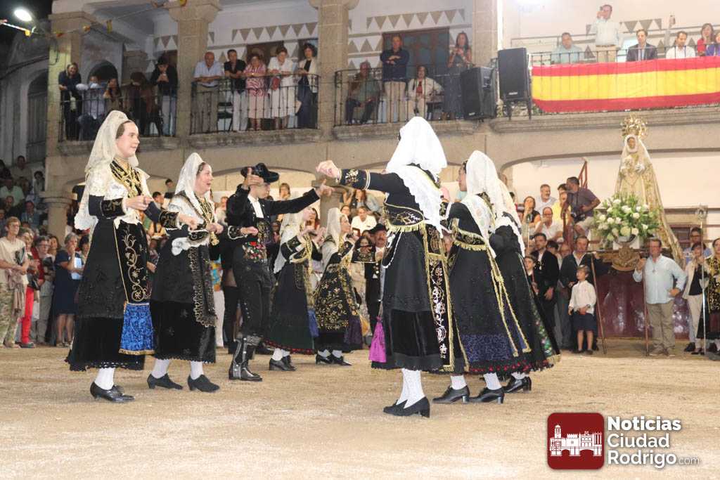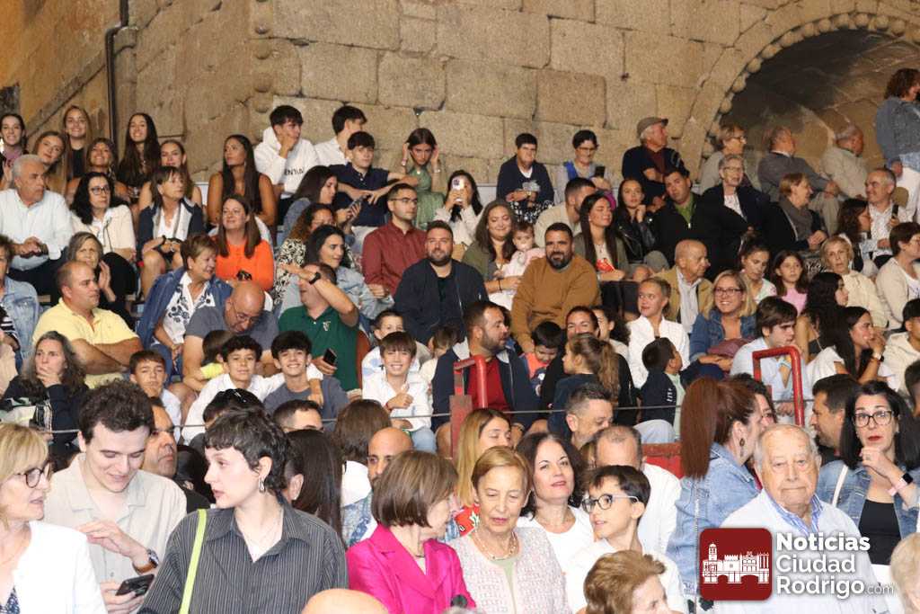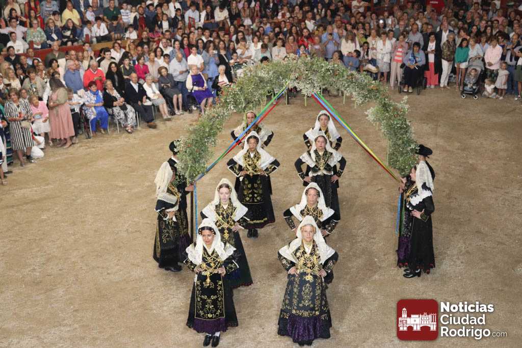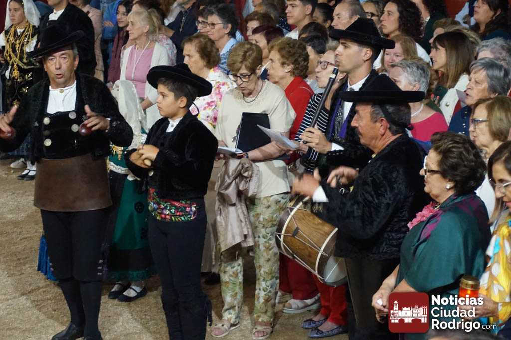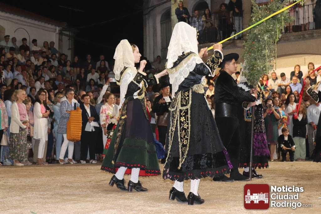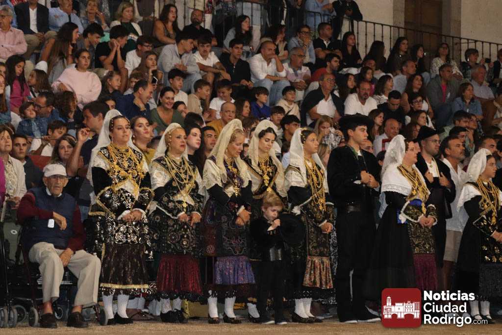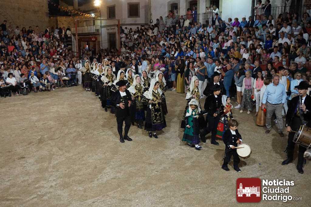 Repican las campanas de la imponente y hermosa iglesia gótica, aplausos generalizados al entrar en la plaza Mayor cuando la comitiva entra en la plaza Mayor. Después el cántico de una Salve y a continuación silencio para escuchar las palabras que desde el balcón de la casa central en esta ocasión ofrecen Carlos Velasco y Ángel Moro, que están acompañados por la alcaldesa Dory Giner. Y tras las palabras, el momento de exaltación de la charrería con el Baile del Cordón, danzado por ocho mujeres. Un baile más y un extra de la mano de María José Calderero y el niño Martín.