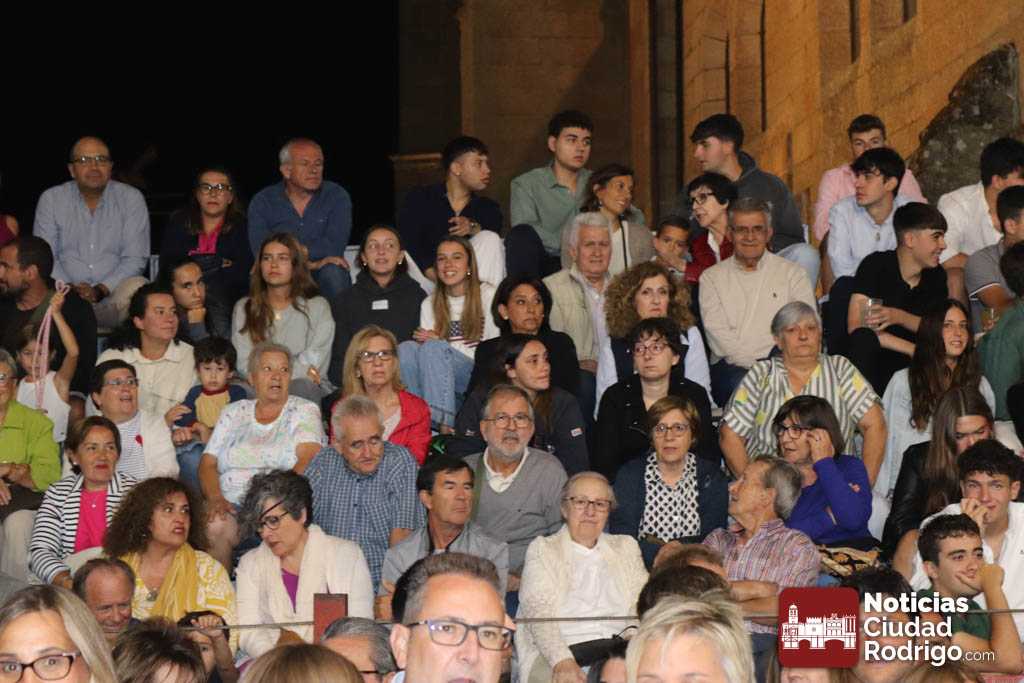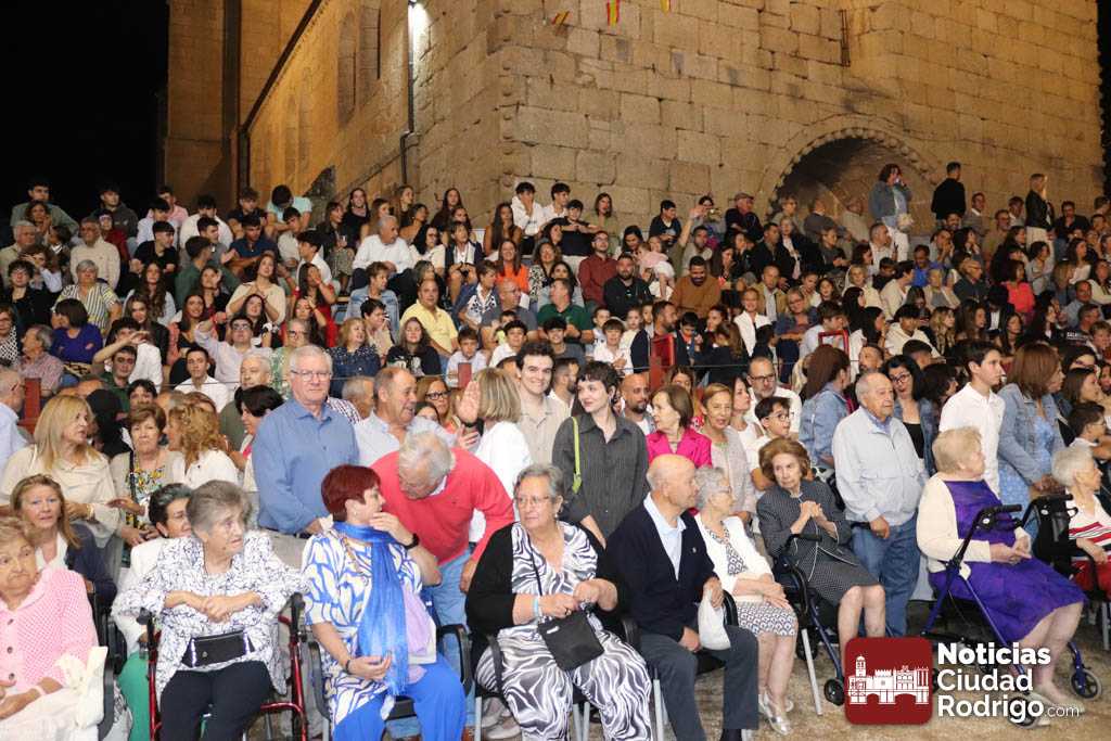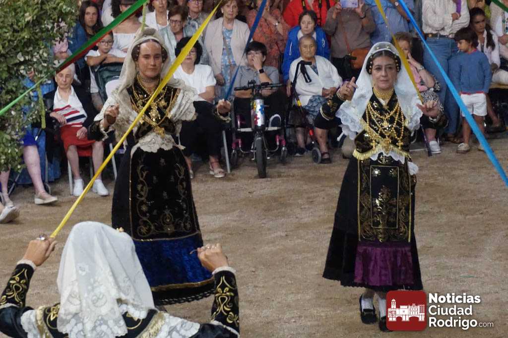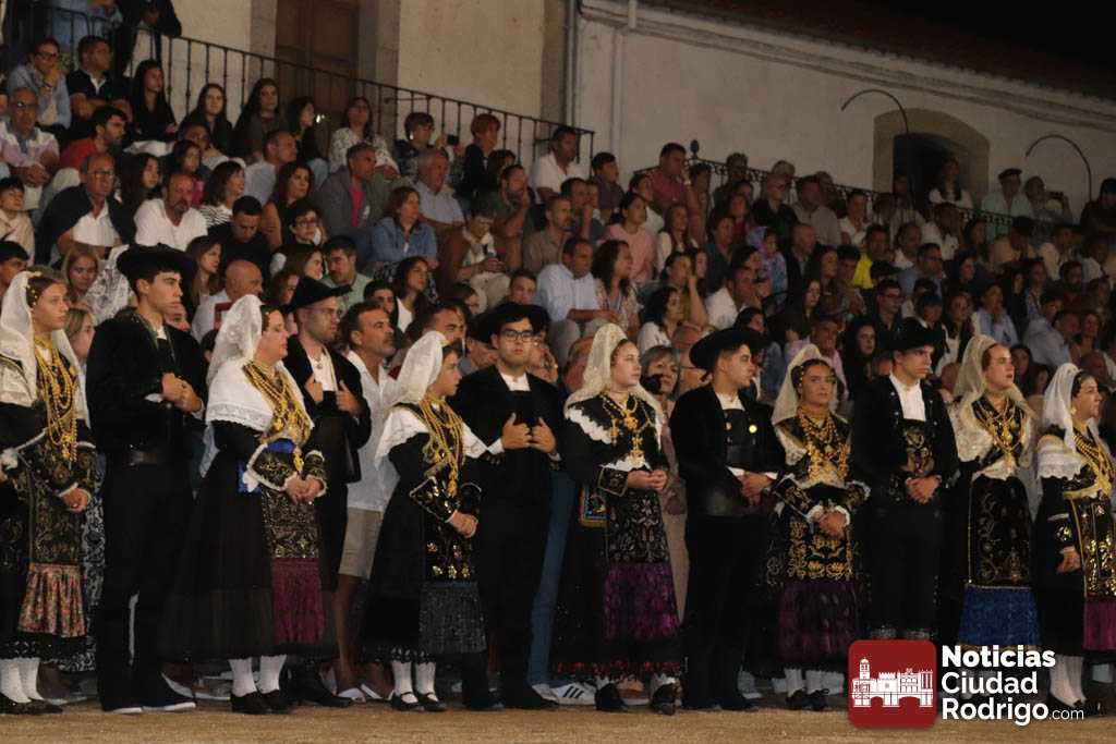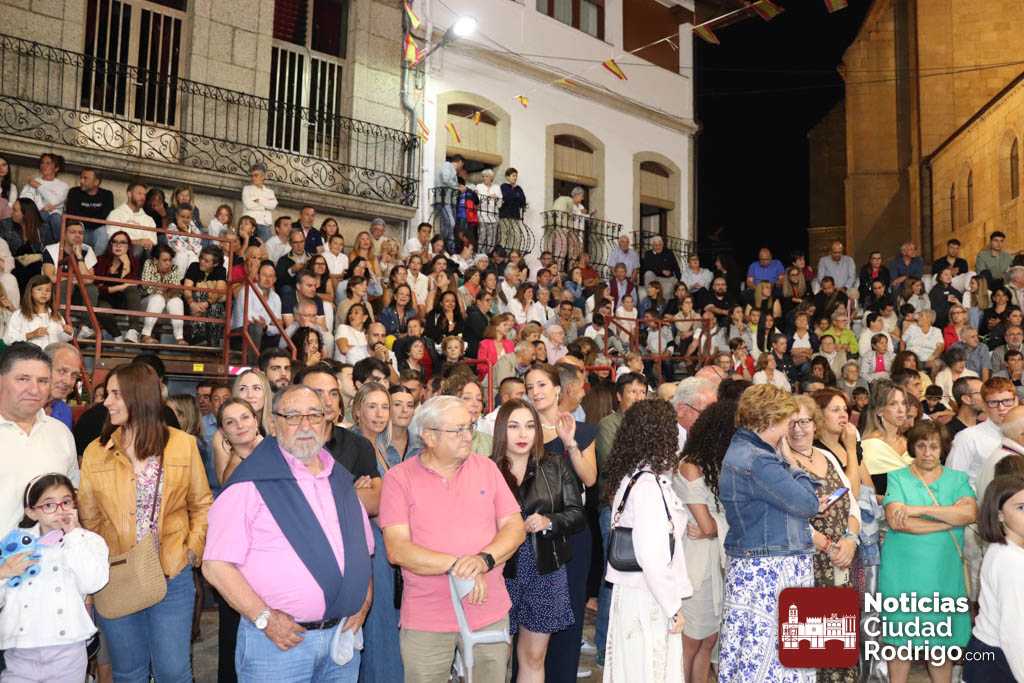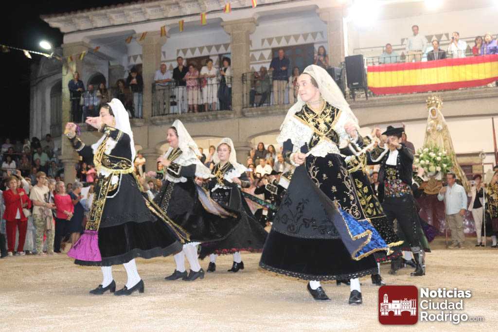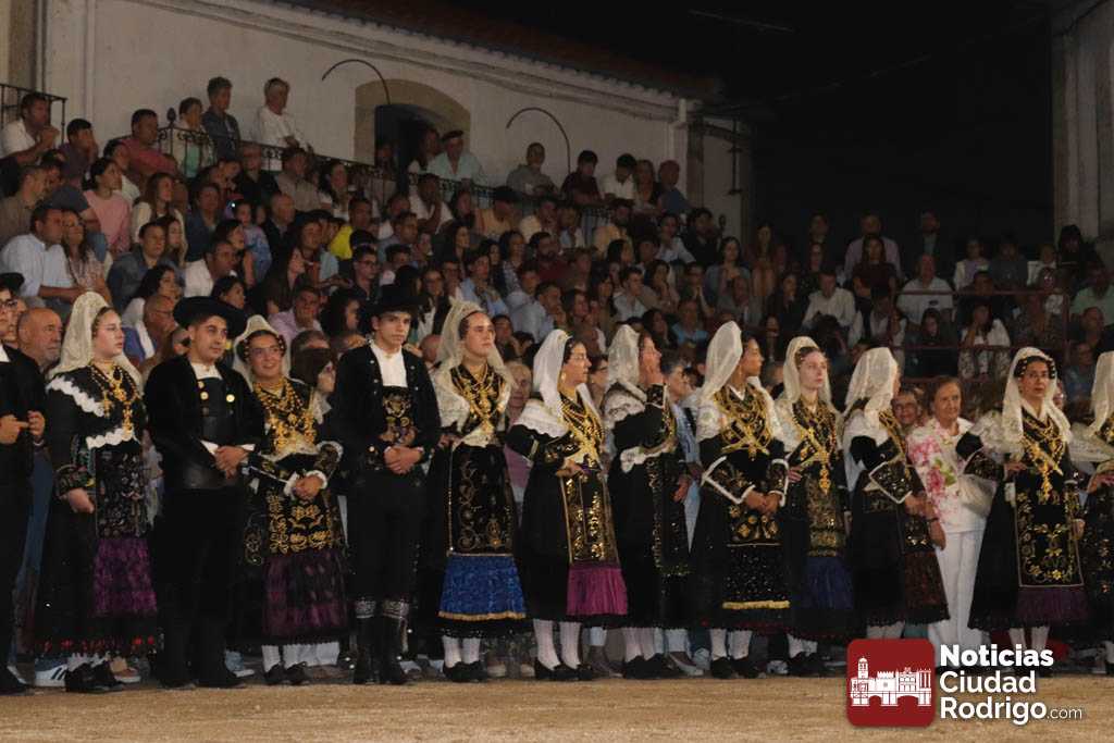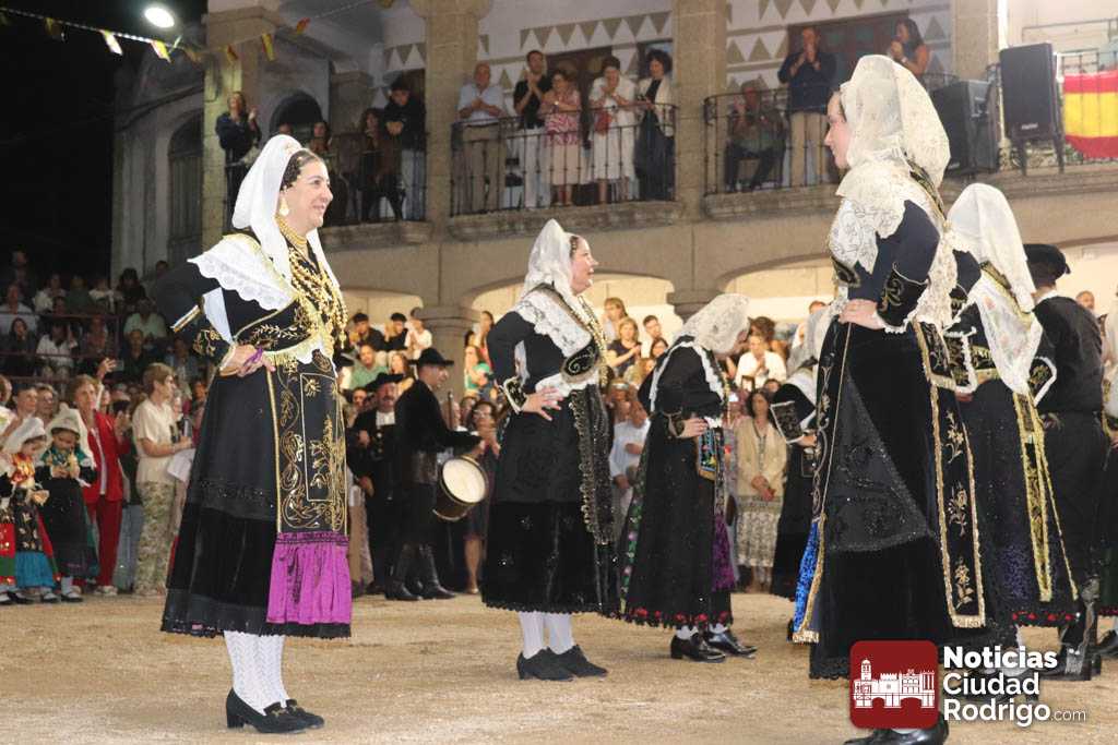 Repican las campanas de la imponente y hermosa iglesia gótica, aplausos generalizados al entrar en la plaza Mayor cuando la comitiva entra en la plaza Mayor. Después el cántico de una Salve y a continuación silencio para escuchar las palabras que desde el balcón de la casa central en esta ocasión ofrecen Carlos Velasco y Ángel Moro, que están acompañados por la alcaldesa Dory Giner. Y tras las palabras, el momento de exaltación de la charrería con el Baile del Cordón, danzado por ocho mujeres. Un baile más y un extra de la mano de María José Calderero y el niño Martín.