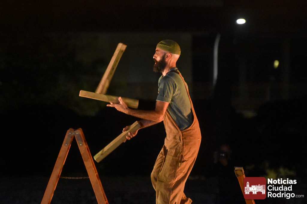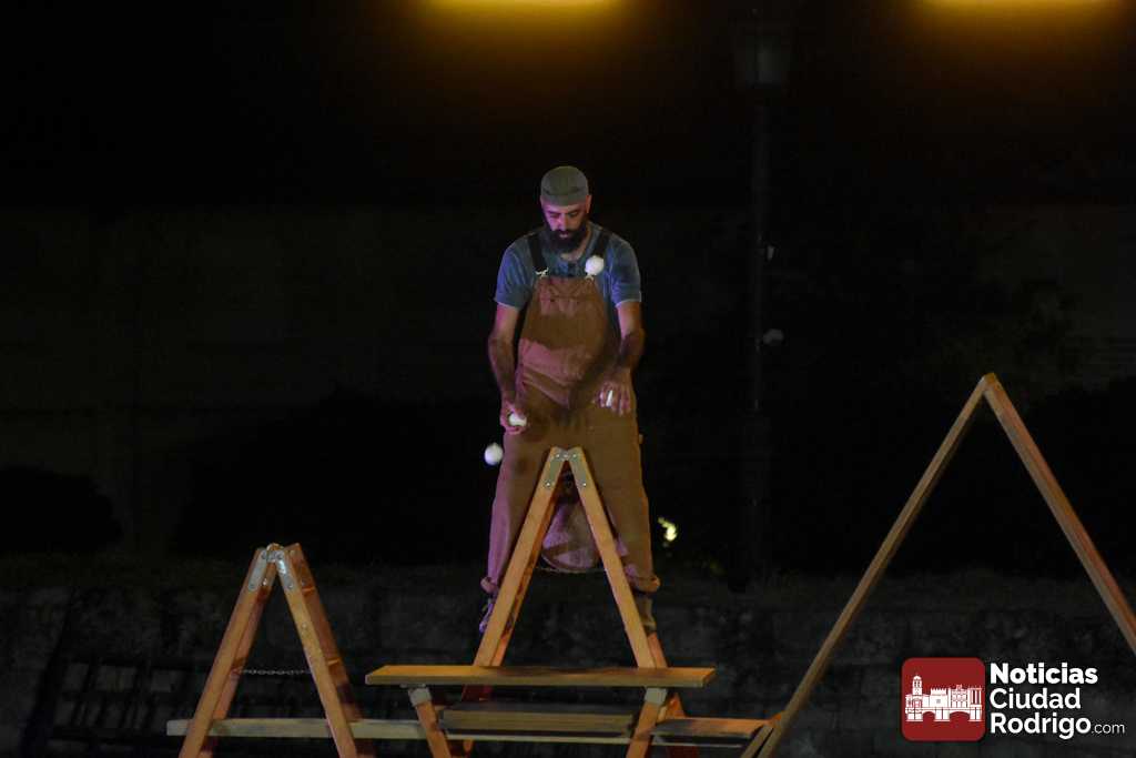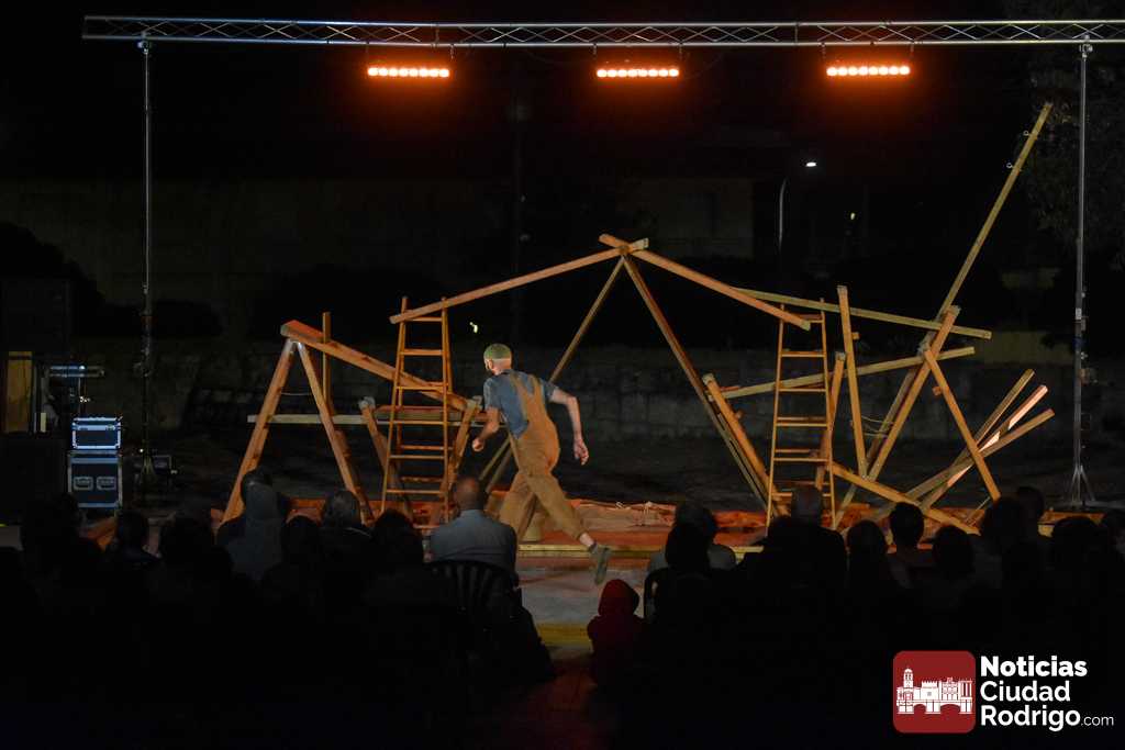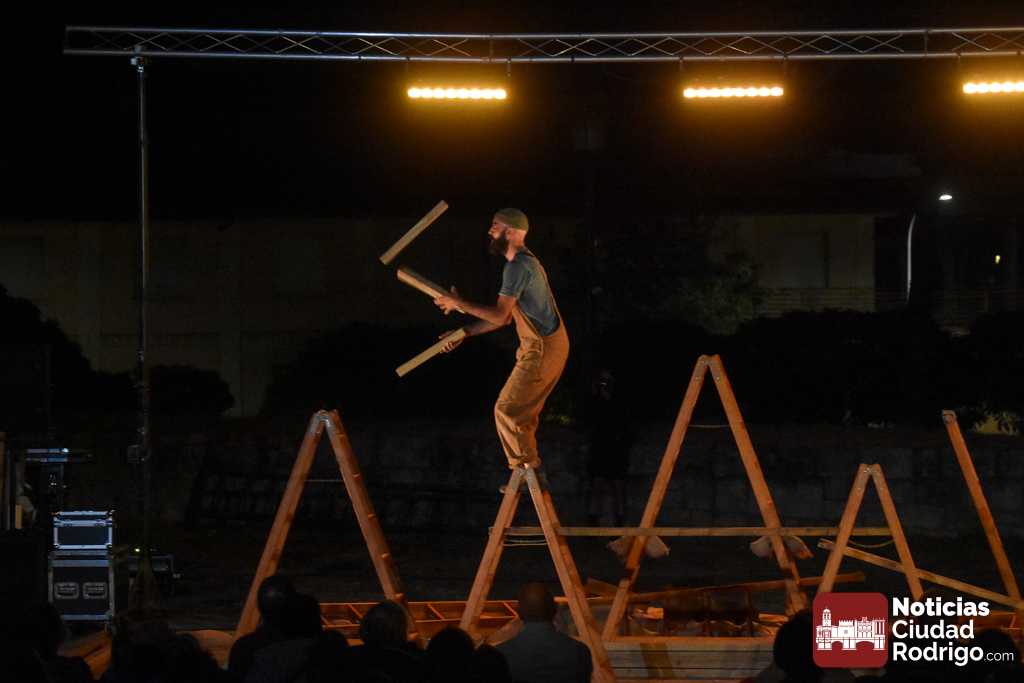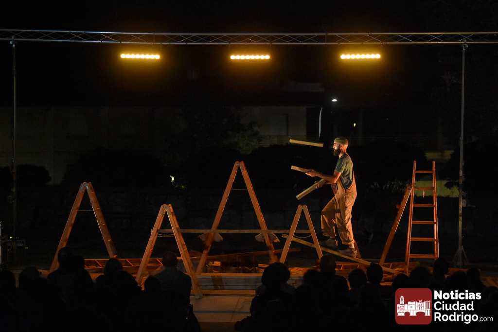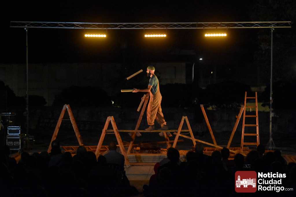 La noche del jueves en la Feria de Teatro mirobrigense tuvo el clásico «doble turno» nocturno tanto en los Jardines de Bolonia como en el Patio de Los Sitios. La nocturna arrancó para todos los públicos y a entrada libre, registrando un gran ambiente, la obra «Llar», de Federico Menini, un encuentro de la arquitectura y las artes circenses con la madera como protagonista, realizándose diferentes ejercicios de equilibrismo y malabares a la vez que se iba montando una estructura.