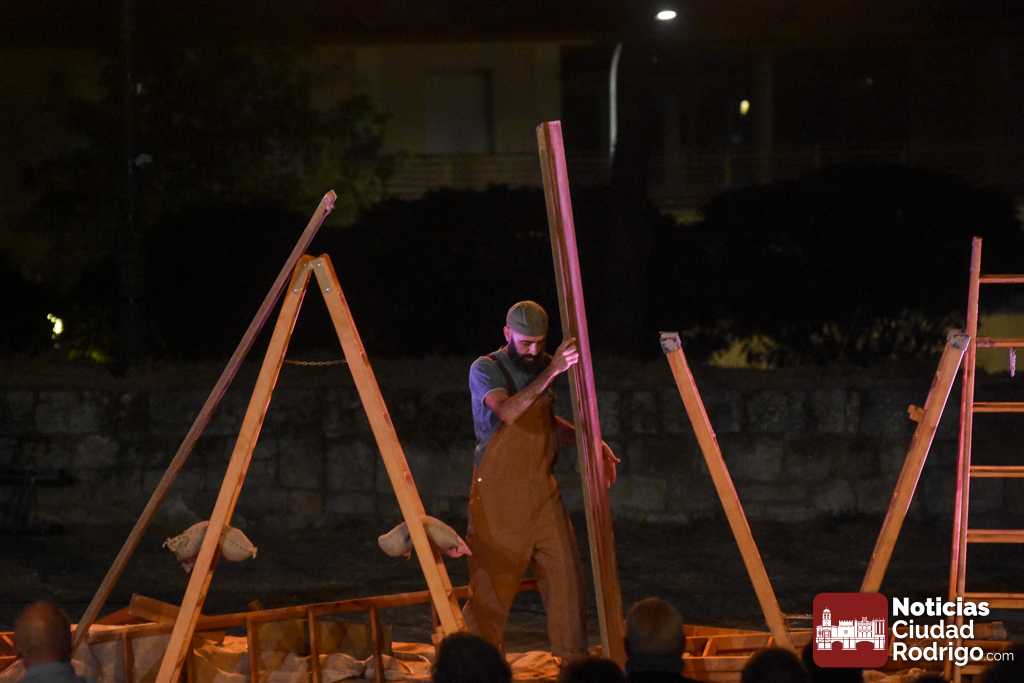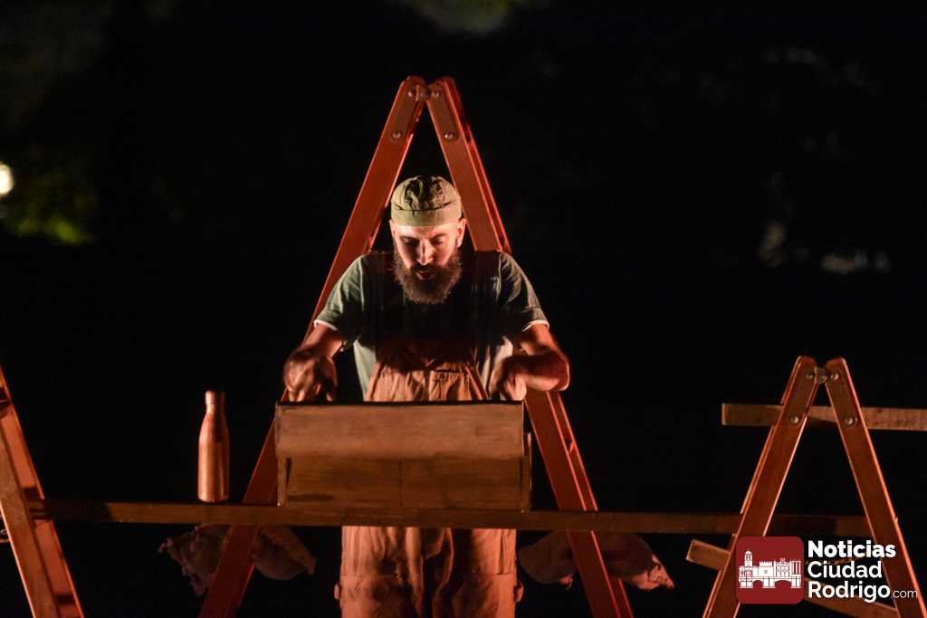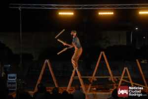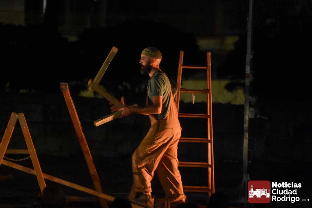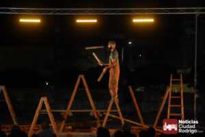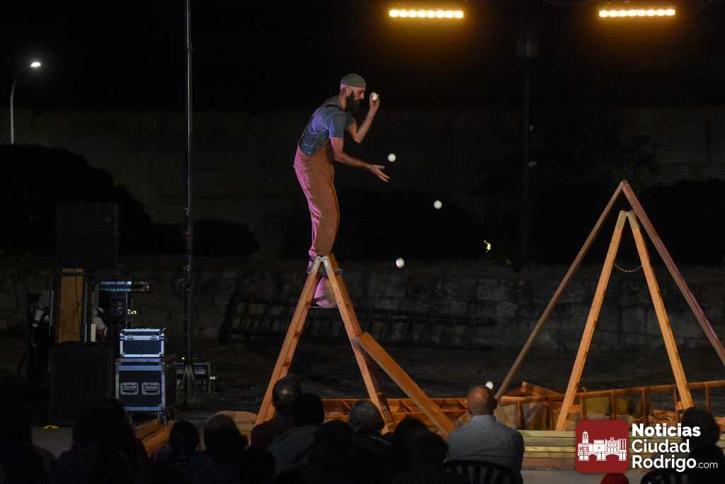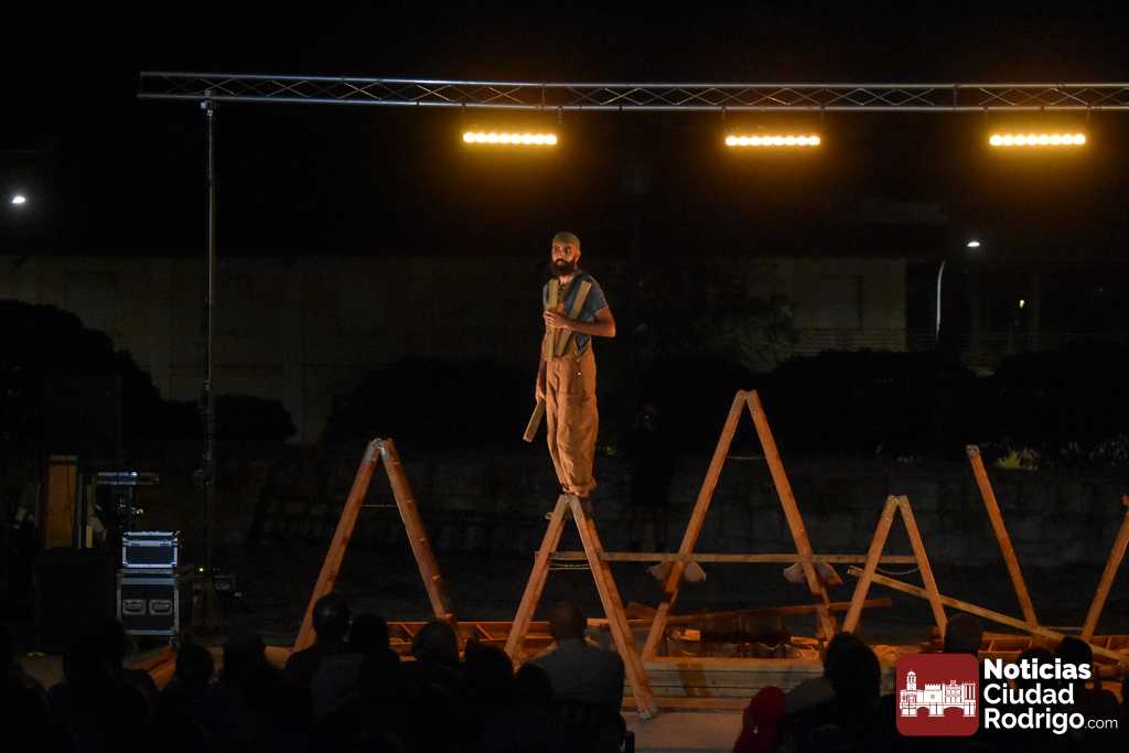 La noche del jueves en la Feria de Teatro mirobrigense tuvo el clásico «doble turno» nocturno tanto en los Jardines de Bolonia como en el Patio de Los Sitios. La nocturna arrancó para todos los públicos y a entrada libre, registrando un gran ambiente, la obra «Llar», de Federico Menini, un encuentro de la arquitectura y las artes circenses con la madera como protagonista, realizándose diferentes ejercicios de equilibrismo y malabares a la vez que se iba montando una estructura.