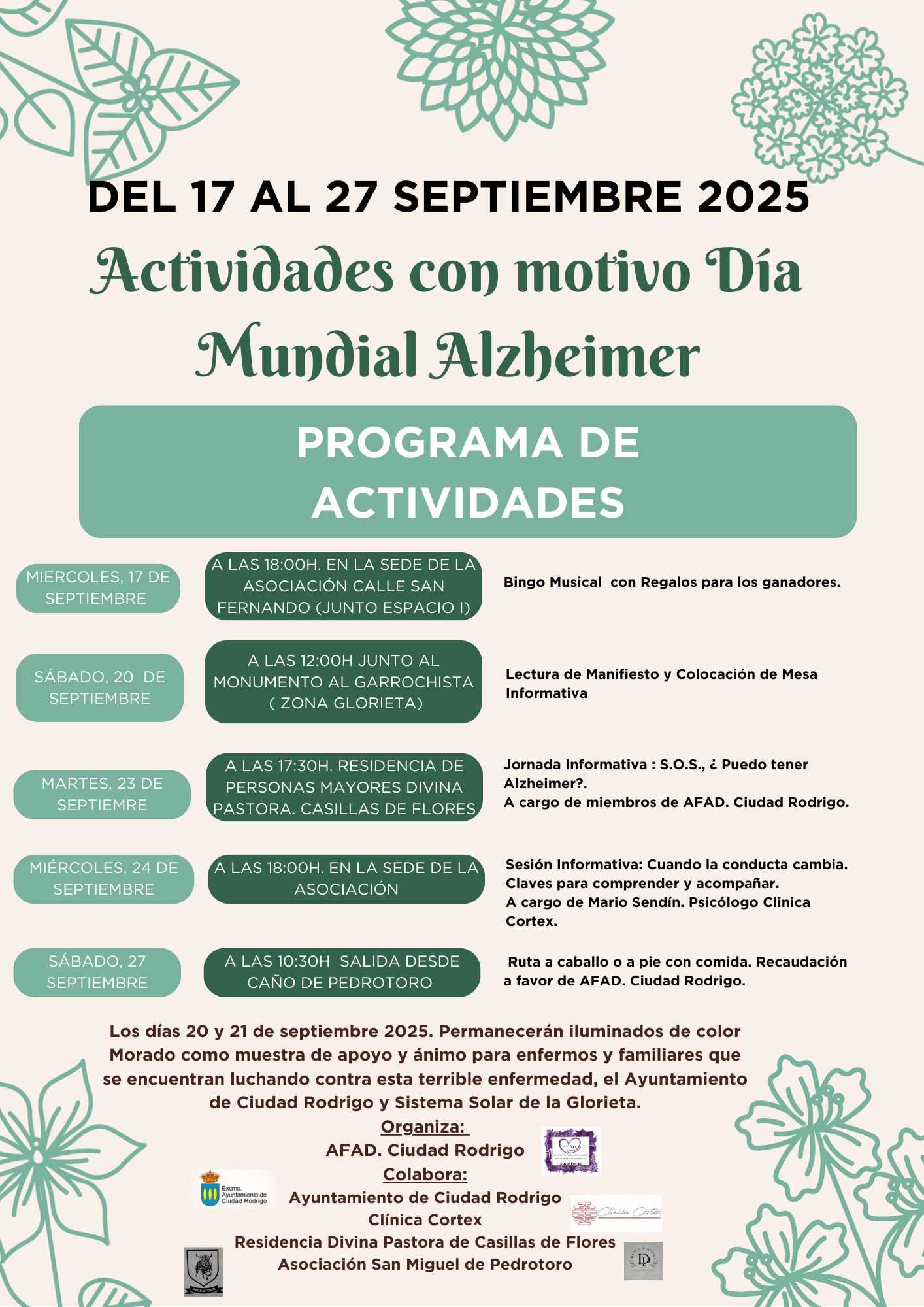 La asociación de familiares de enfermos de Alzheimer de Ciudad Rodrigo y comarca tiene previsto un completo programa con motivo del Día Mundial del Alzheimer, que tendrá lugar el 21 de septiembre. Los actos programados son los siguientes: