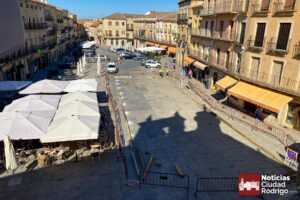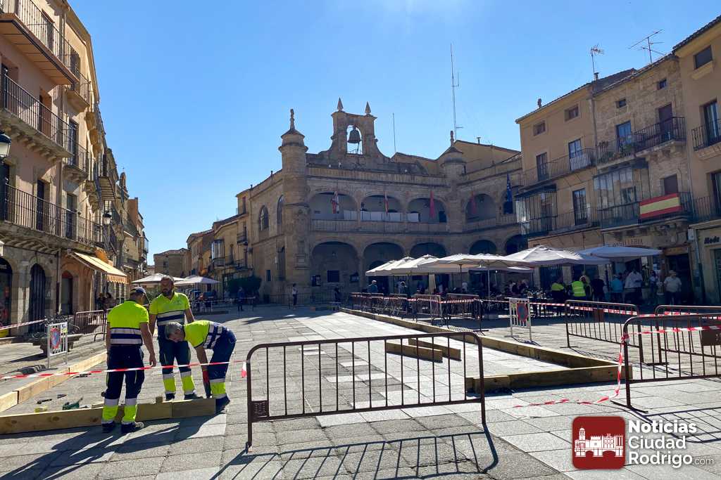Durante esta mañana se ha iniciado en la Plaza Mayor el montaje de la pista de arena destinada a alojar varios espectáculos de la Feria del Caballo en Ciudad Rodrigo este fin de semana. Una estructura que este año gana tanto en el ancho como en largo unos pocos metros y que será utilizada por primera vez durante la inauguración de la feria el viernes 19 de septiembre a las 21:00 h. El espectáculo encargado de la apertura lo realizarán Leandro Araujo y Noelia Mateos, para continuar con un desfile «A lo campero».