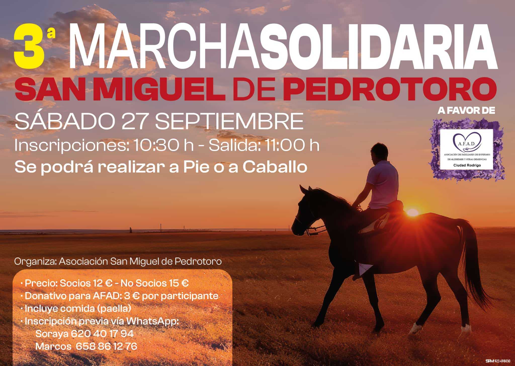 La tercera Marcha Solidaria «San Miguel de Pedrotoro», a favor de la Asociación de Familiares de Enfermos de Alzheimer de Ciudad Rodrigo (AFAD ), tendrá lugar el próximo sábado 27 de septiembre en Pedrotoro. Se podrá realizar a pie o a caballo.