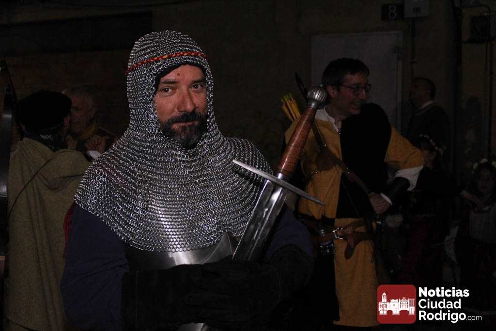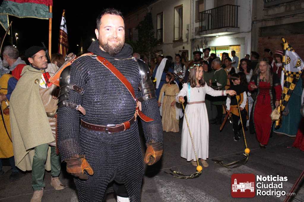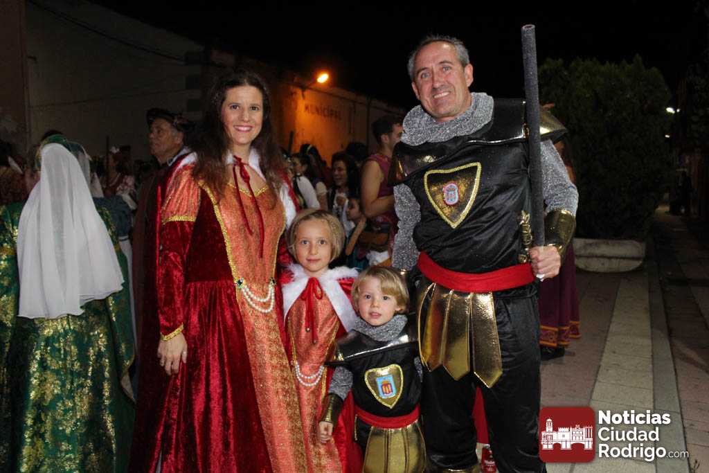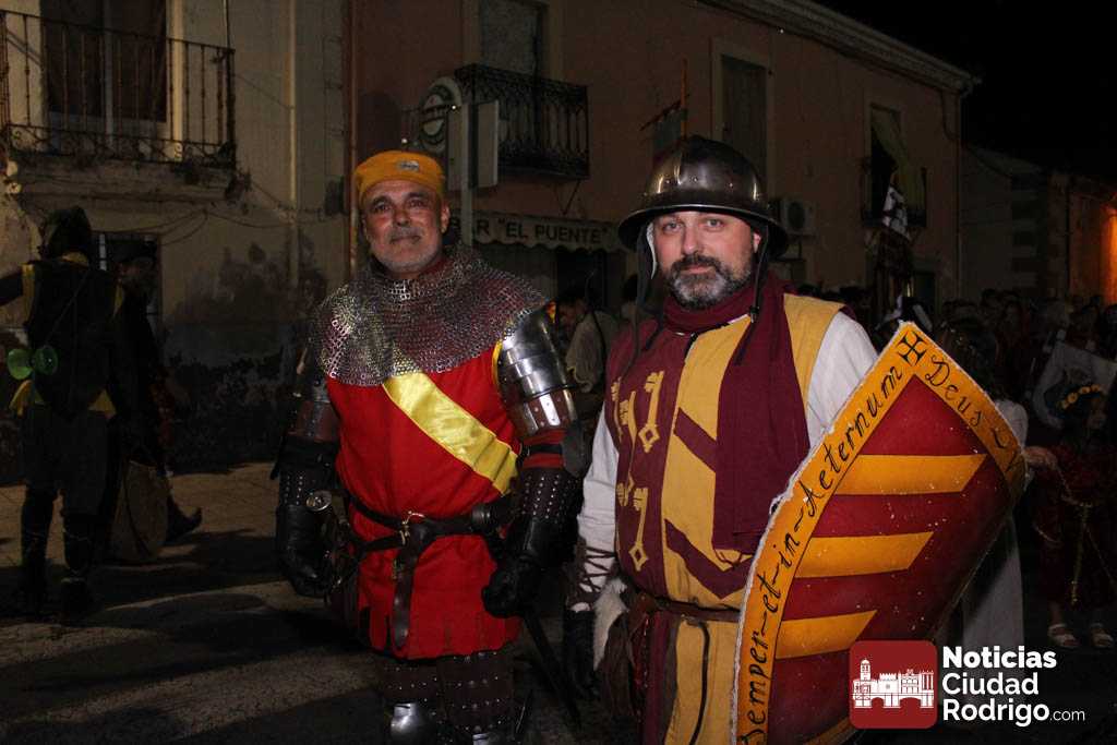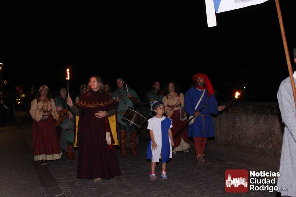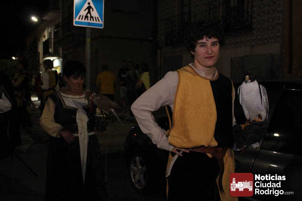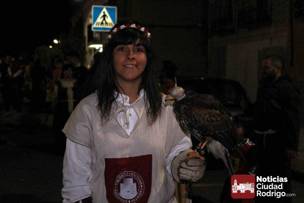 A las nueve de la noche, las personas que iban a desfilar debidamente ataviadas se han dado cita en el Arrabal del Puente. Primero han desfilado los abanderados, seguidos de personas que llevaban aves de cetrería, arqueros,…, decenas y decenas de personas ataviadas con trajes medievales para acompañar a los Reyes. Cerraba la comitiva un buen número de caballos. Música medieval en directo y animación que ha desfilado a lo largo del Puente Mayor con el castillo de fondo iluminado.