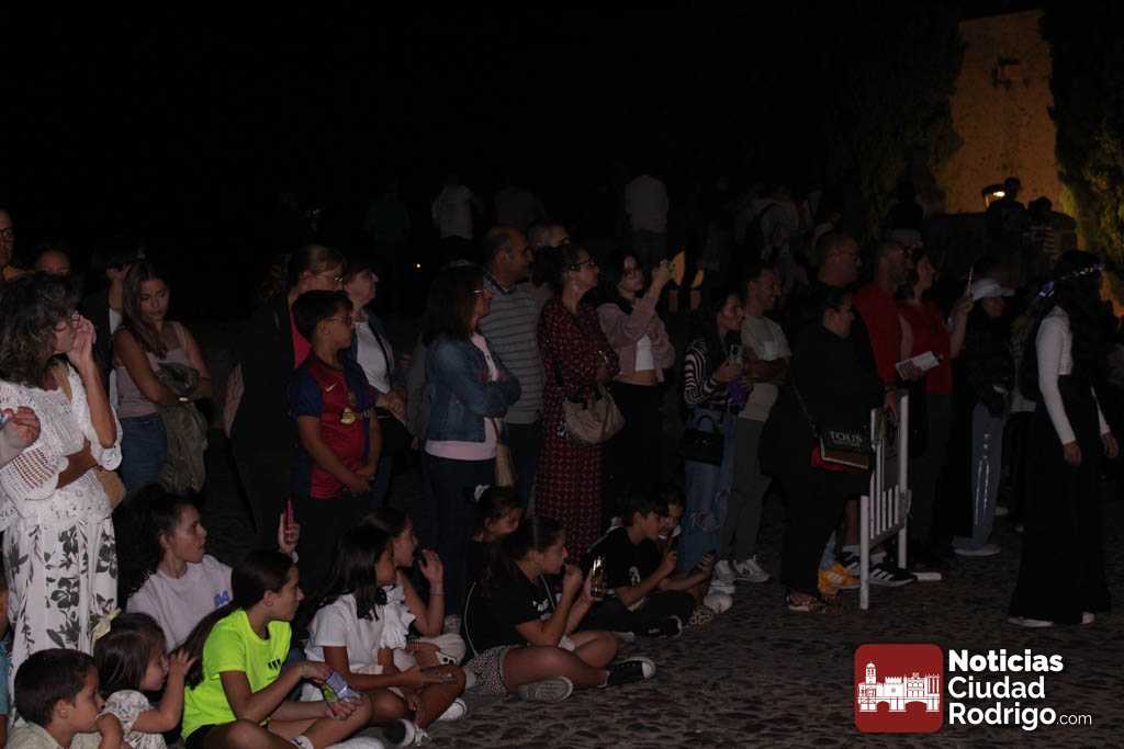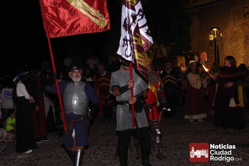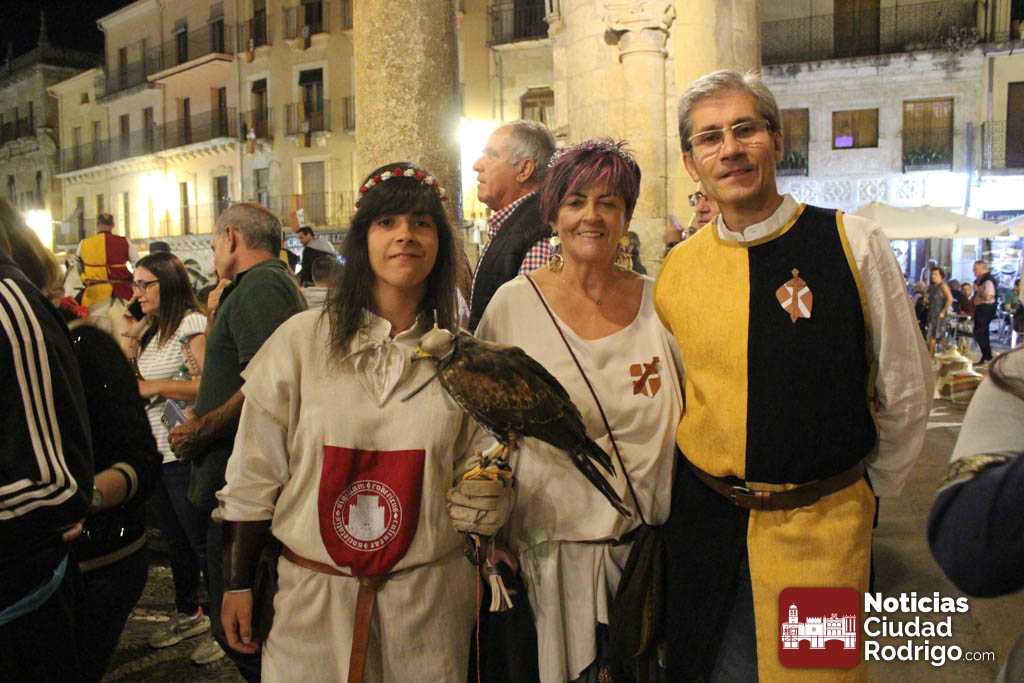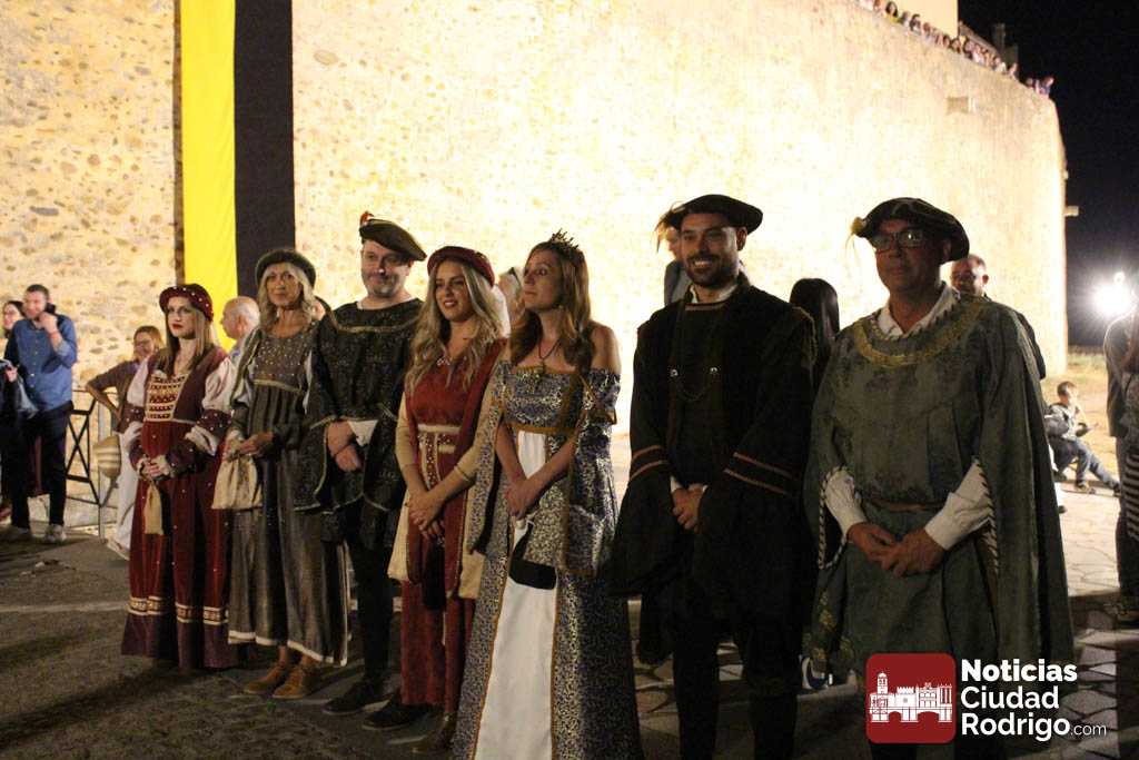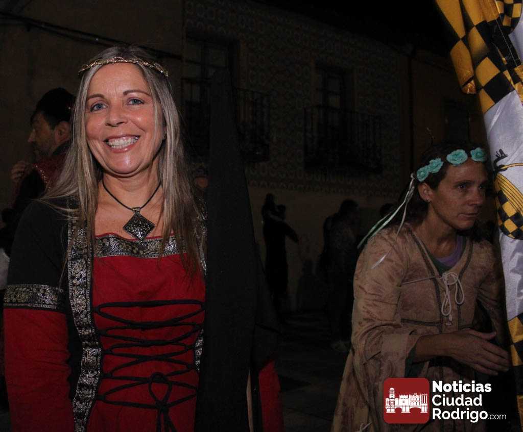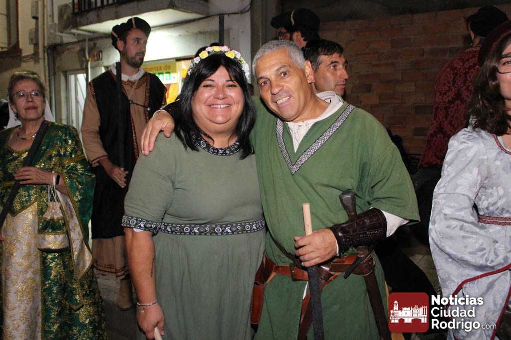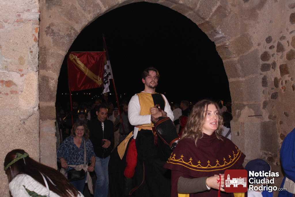 A las nueve de la noche, las personas que iban a desfilar debidamente ataviadas se han dado cita en el Arrabal del Puente. Primero han desfilado los abanderados, seguidos de personas que llevaban aves de cetrería, arqueros,…, decenas y decenas de personas ataviadas con trajes medievales para acompañar a los Reyes. Cerraba la comitiva un buen número de caballos. Música medieval en directo y animación que ha desfilado a lo largo del Puente Mayor con el castillo de fondo iluminado.