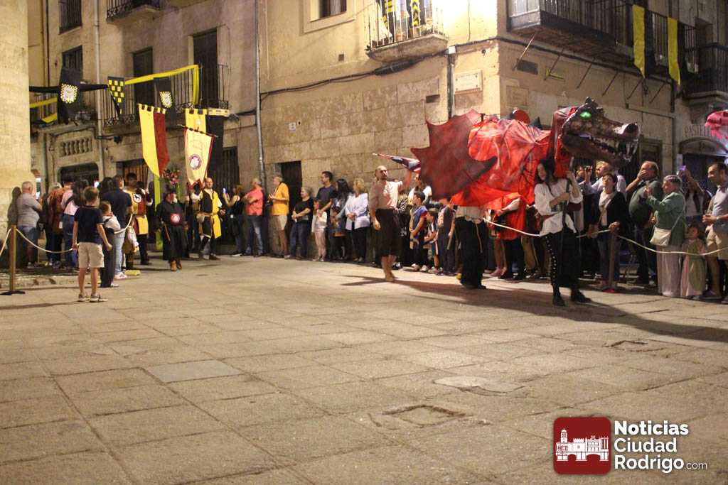 Tras subir la cuesta Santiago, antes de cruzar la muralla de la Ciudad, el alcalde Marcos Iglesias también vestido de medieval, como el resto de la Corporación Municipal, han recibido a los reyes que han hecho un juramento de buenas intenciones. Ha sido allí donde se ha unido a la comitiva un dragón, una de las novedades de este año. La escena ha sido presenciada por numeroso público incluso desde lo alto de la muralla.