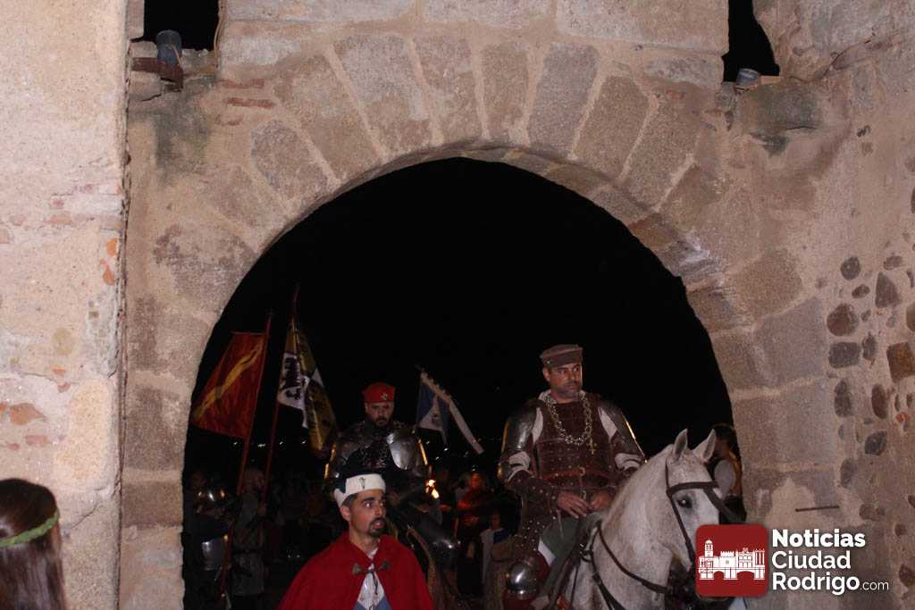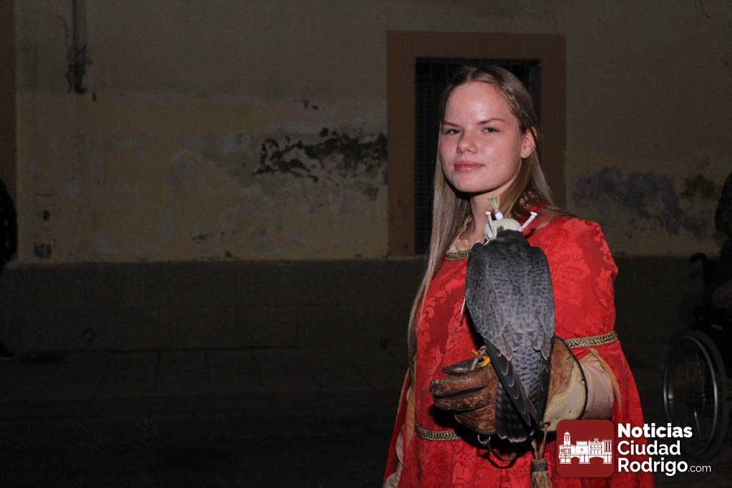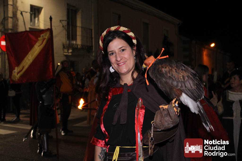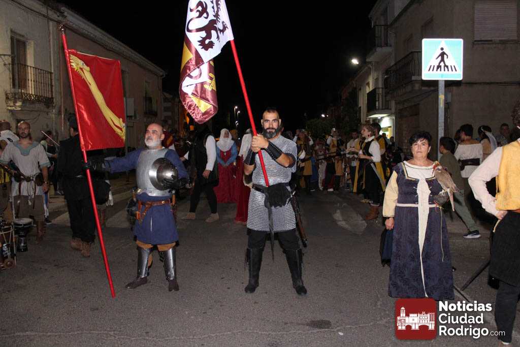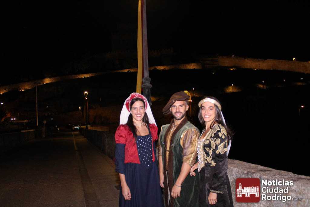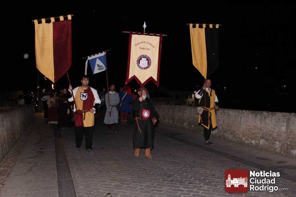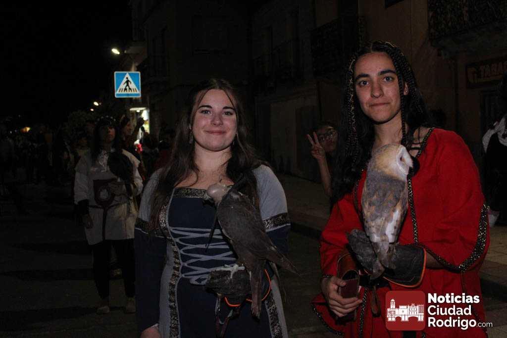 A las nueve de la noche, las personas que iban a desfilar debidamente ataviadas se han dado cita en el Arrabal del Puente. Primero han desfilado los abanderados, seguidos de personas que llevaban aves de cetrería, arqueros,…, decenas y decenas de personas ataviadas con trajes medievales para acompañar a los Reyes. Cerraba la comitiva un buen número de caballos. Música medieval en directo y animación que ha desfilado a lo largo del Puente Mayor con el castillo de fondo iluminado.