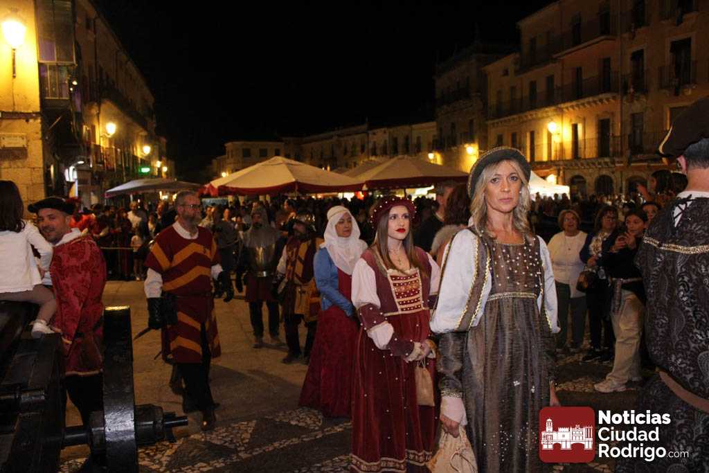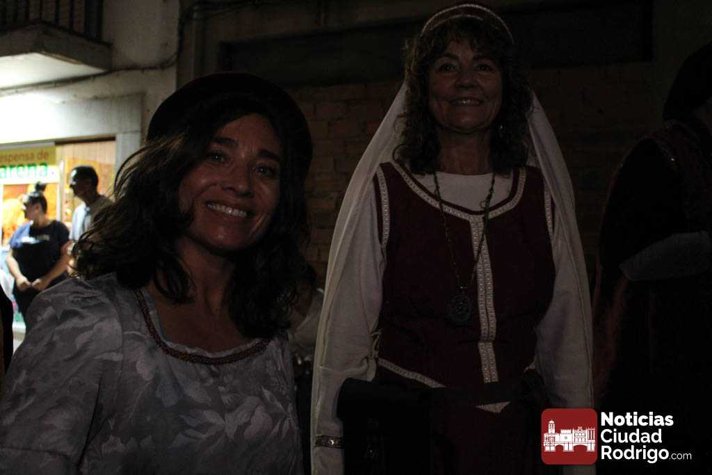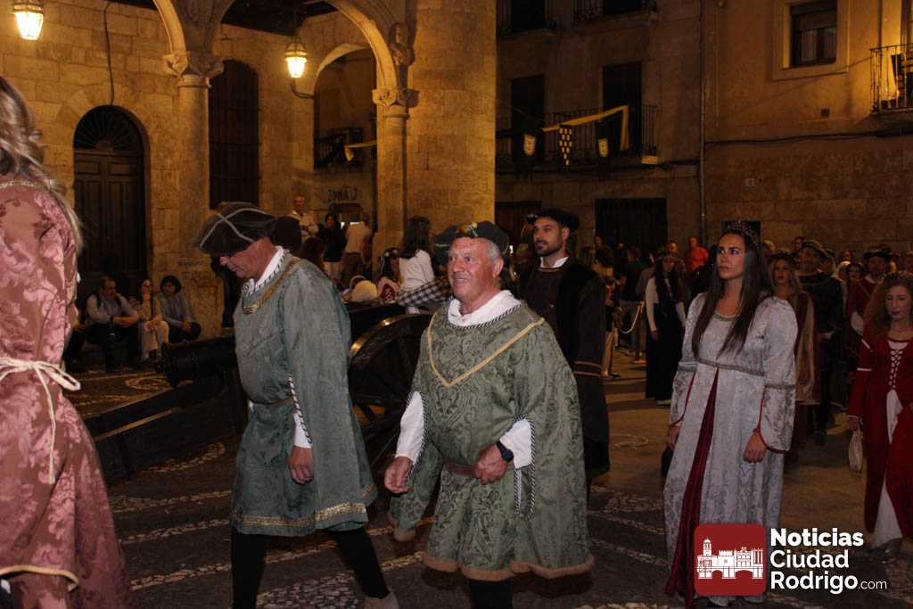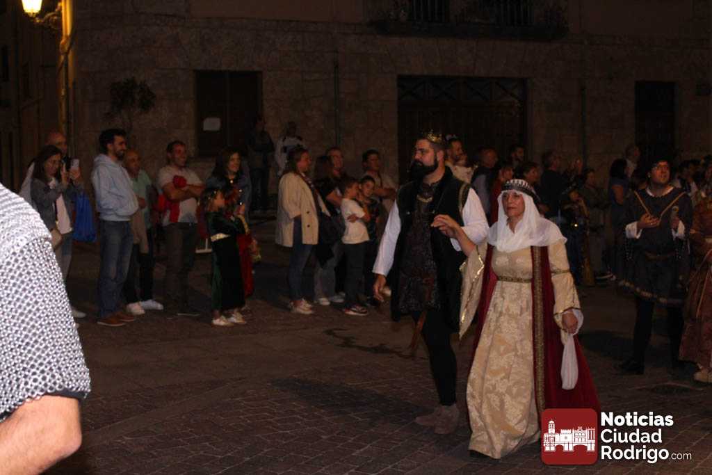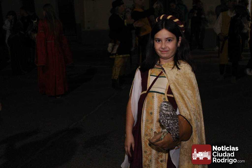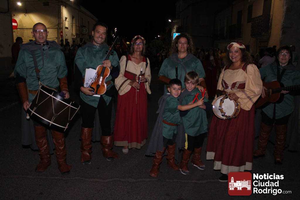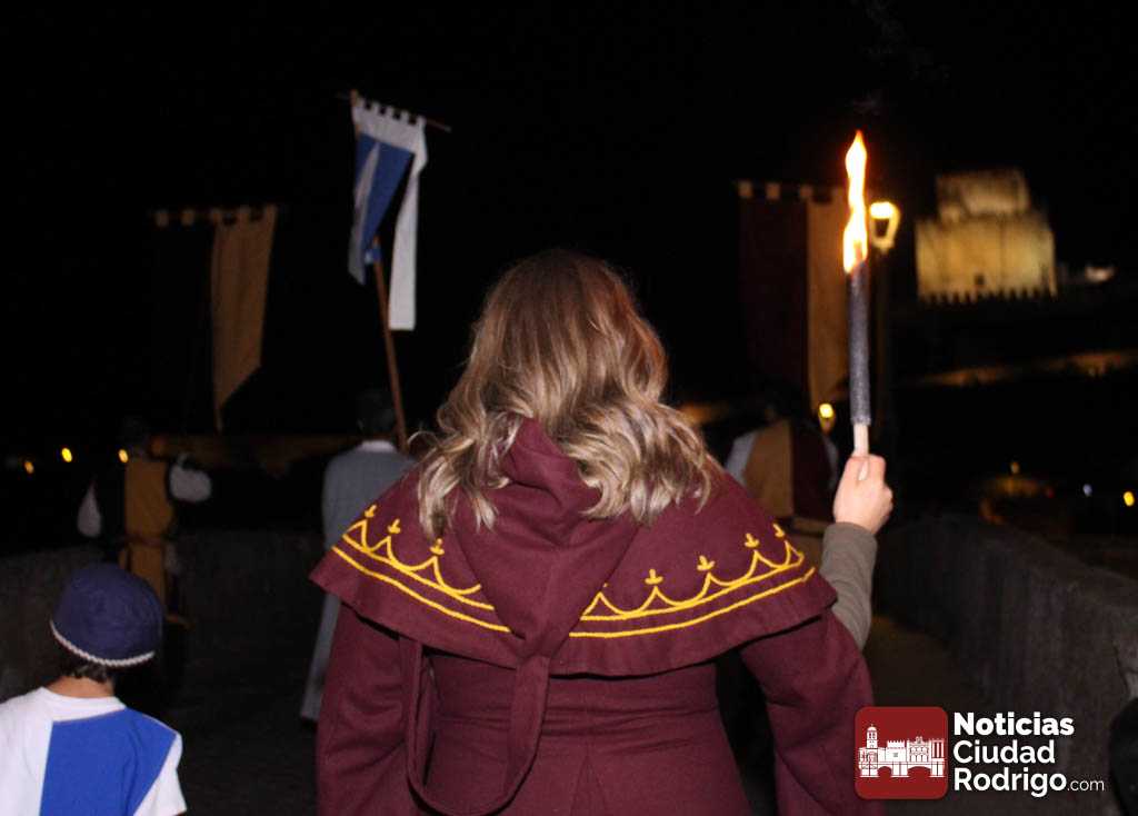 A las nueve de la noche, las personas que iban a desfilar debidamente ataviadas se han dado cita en el Arrabal del Puente. Primero han desfilado los abanderados, seguidos de personas que llevaban aves de cetrería, arqueros,…, decenas y decenas de personas ataviadas con trajes medievales para acompañar a los Reyes. Cerraba la comitiva un buen número de caballos. Música medieval en directo y animación que ha desfilado a lo largo del Puente Mayor con el castillo de fondo iluminado.