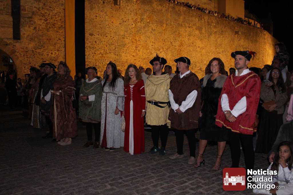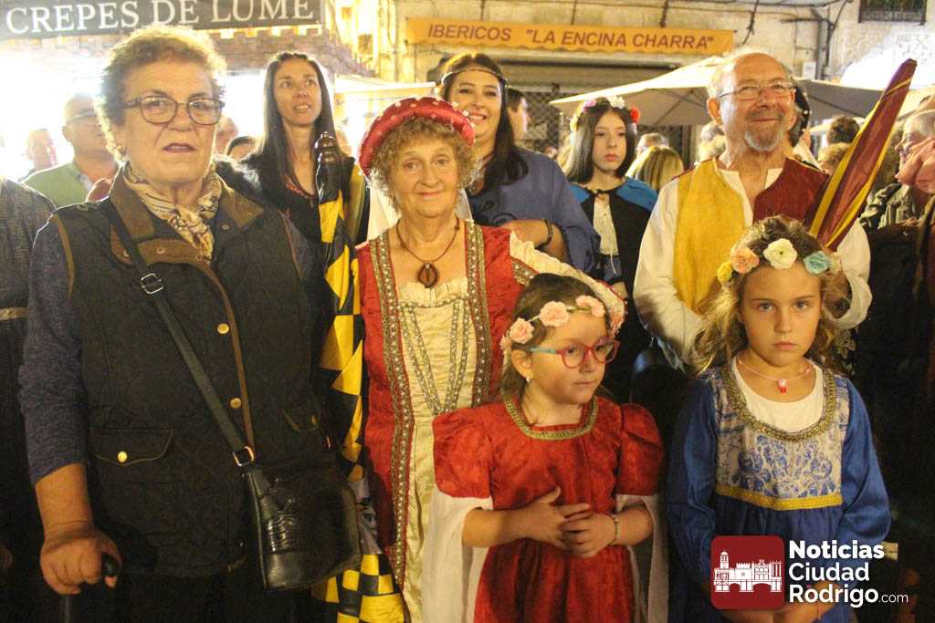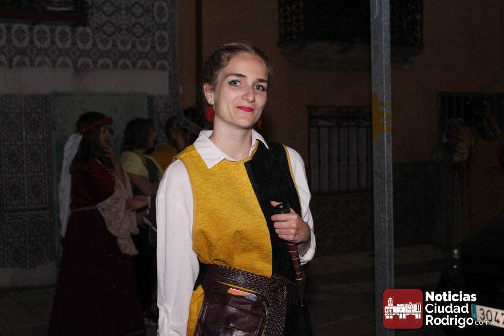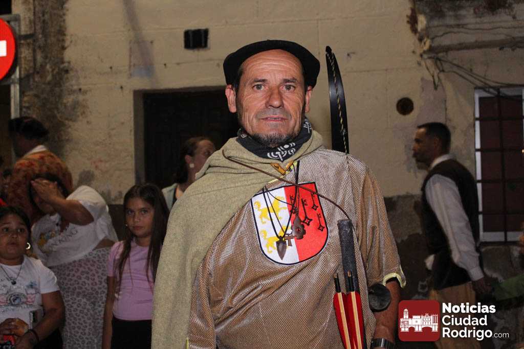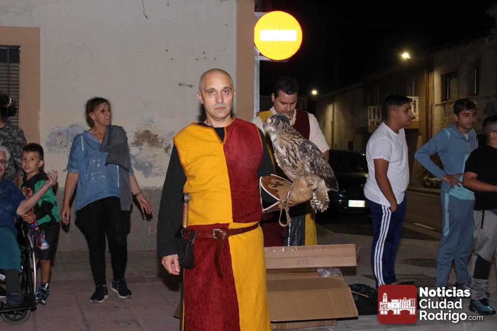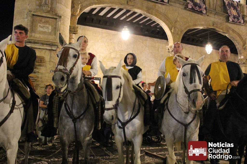 A las nueve de la noche, las personas que iban a desfilar debidamente ataviadas se han dado cita en el Arrabal del Puente. Primero han desfilado los abanderados, seguidos de personas que llevaban aves de cetrería, arqueros,…, decenas y decenas de personas ataviadas con trajes medievales para acompañar a los Reyes. Cerraba la comitiva un buen número de caballos. Música medieval en directo y animación que ha desfilado a lo largo del Puente Mayor con el castillo de fondo iluminado.