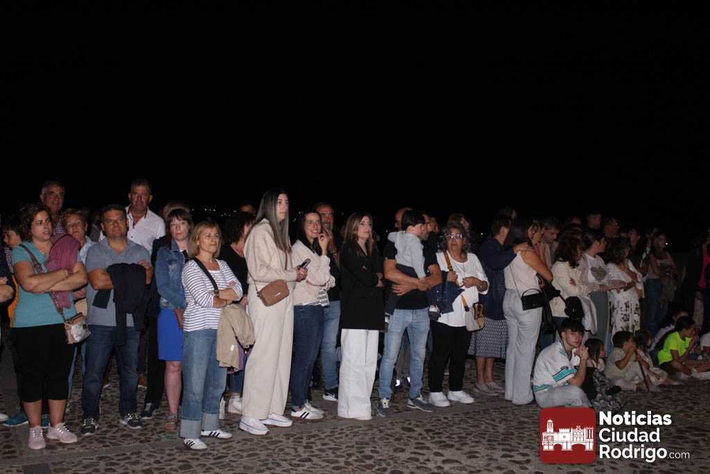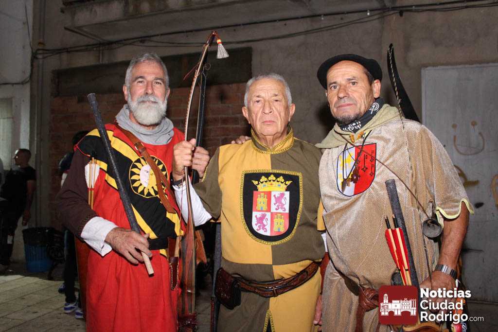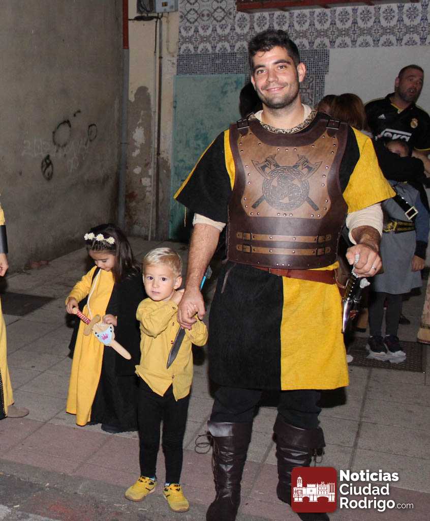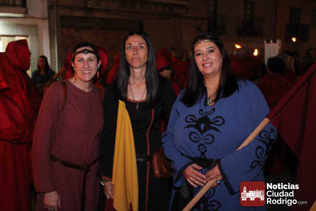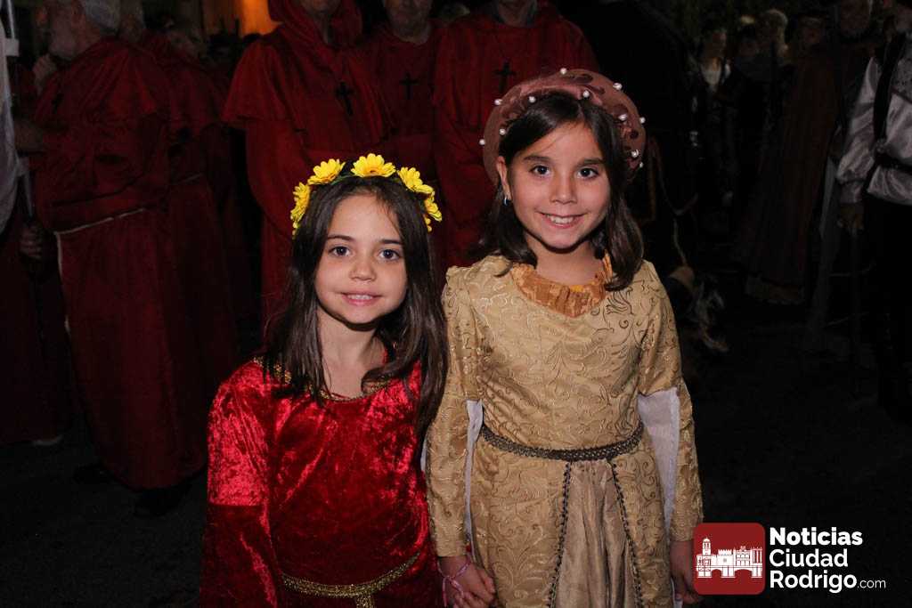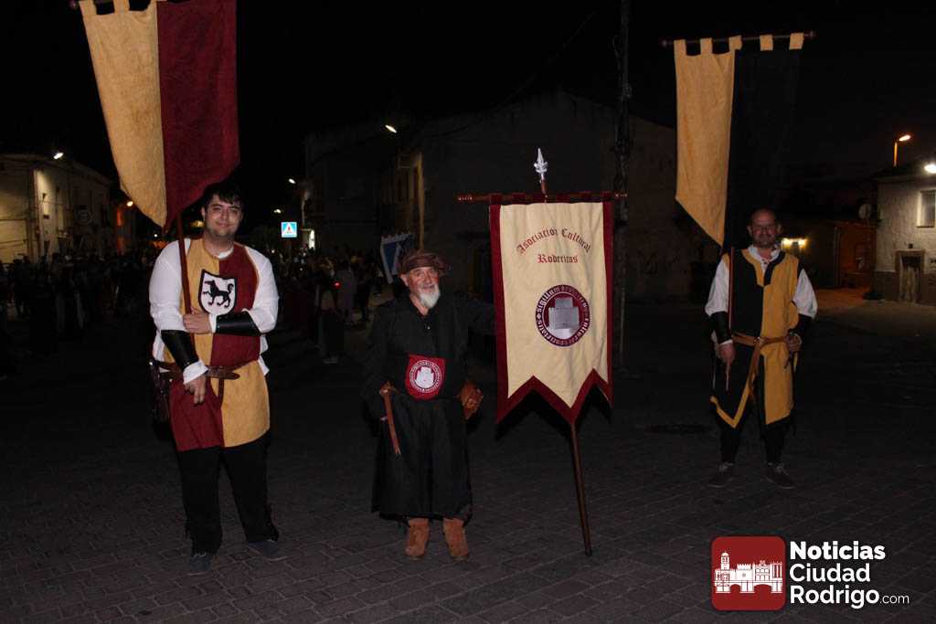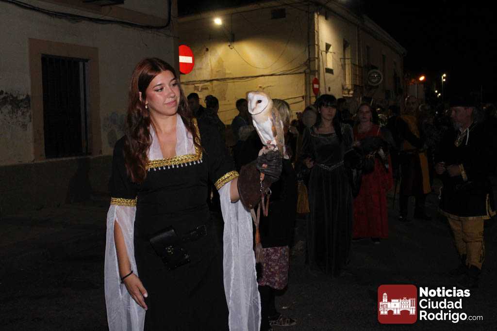 A las nueve de la noche, las personas que iban a desfilar debidamente ataviadas se han dado cita en el Arrabal del Puente. Primero han desfilado los abanderados, seguidos de personas que llevaban aves de cetrería, arqueros,…, decenas y decenas de personas ataviadas con trajes medievales para acompañar a los Reyes. Cerraba la comitiva un buen número de caballos. Música medieval en directo y animación que ha desfilado a lo largo del Puente Mayor con el castillo de fondo iluminado.