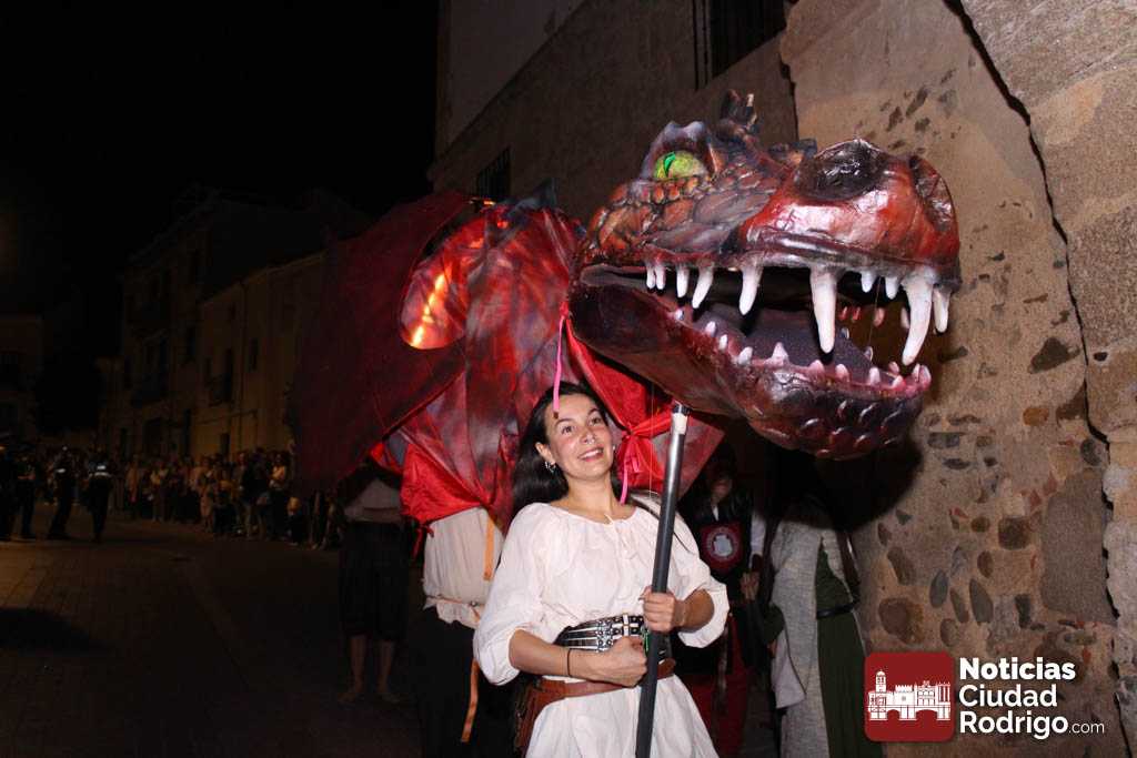 Tras subir la cuesta Santiago, antes de cruzar la muralla de la Ciudad, el alcalde Marcos Iglesias también vestido de medieval, como el resto de la Corporación Municipal, han recibido a los reyes que han hecho un juramento de buenas intenciones. Ha sido allí donde se ha unido a la comitiva un dragón, una de las novedades de este año. La escena ha sido presenciada por numeroso público incluso desde lo alto de la muralla.