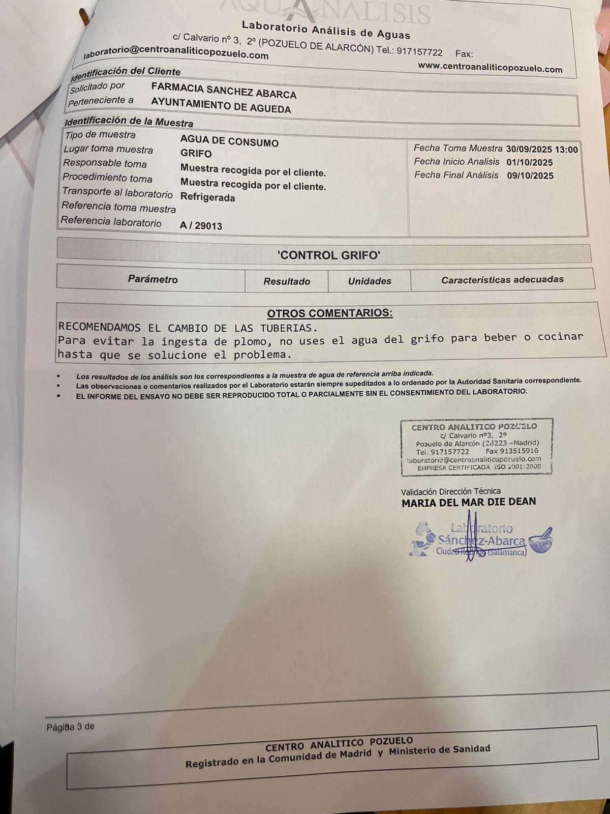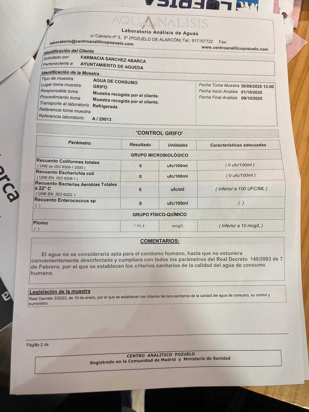 Tras análisis realizados y que adjuntamos a esta información se indica que los valores de Écoli son los correctos y que lo que se observa es valores superiores a los recomendable en plomo debido a la antigüedad de las tuberías, algo que lleva ocurriendo desde siempre debido a que fueron instaladas hace décadas.