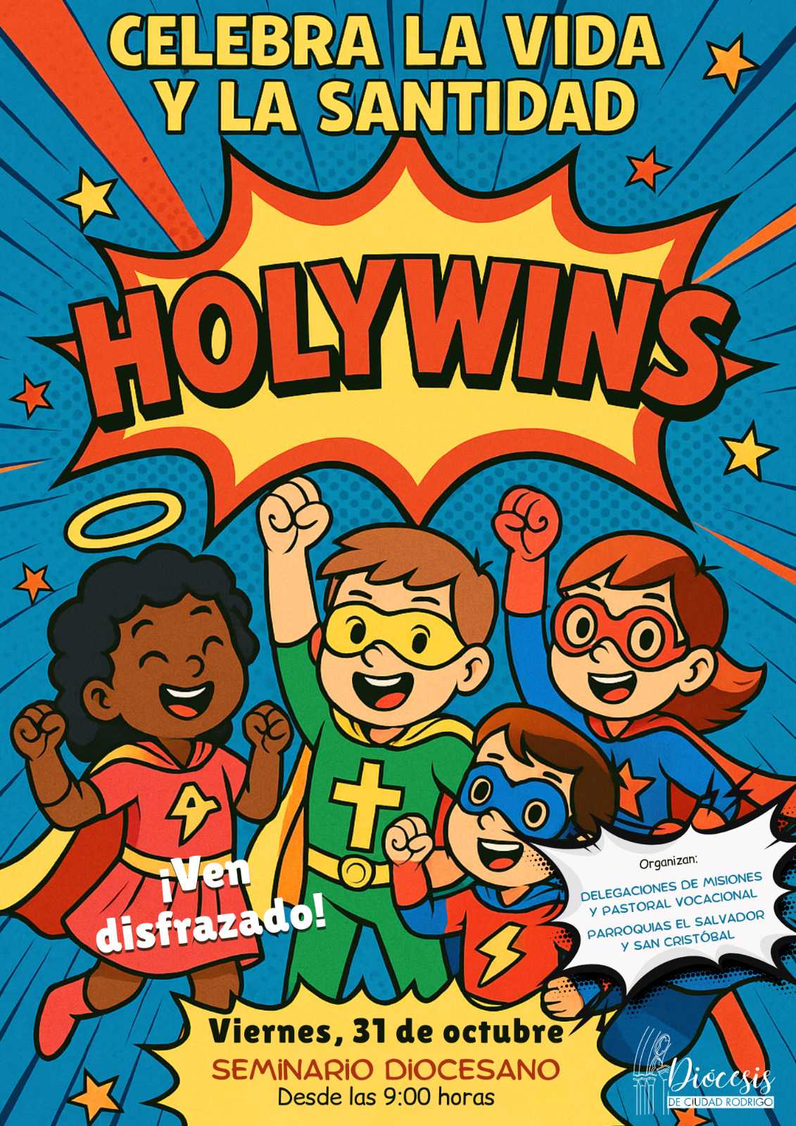 Un año más, la delegación de Misiones de la diócesis de Ciudad Rodrigo y las parroquias de El Salvador y San Cristóbal organizan la fiesta de «Hollywins. Celebra la vida y la santidad». Será en el Seminario Diocesano a partir de las nueve de la mañana. Se invita a los niños y niñas a acudir disfrazados. Habrá diferentes actividades durante toda la mañana.