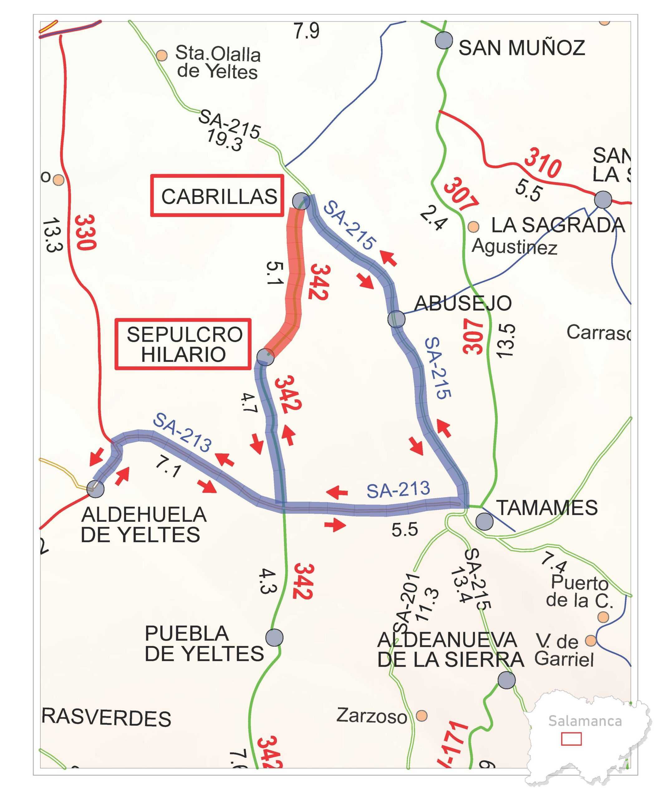El tramo comprendido entre Cabrillas y Sepulcro Hilario desde la intersección de la DSA-342 con la carretera SA-215 a Sepulcro Hilario permanece cerrado al tráfico de vehículos desde el pasado 24 de abril.