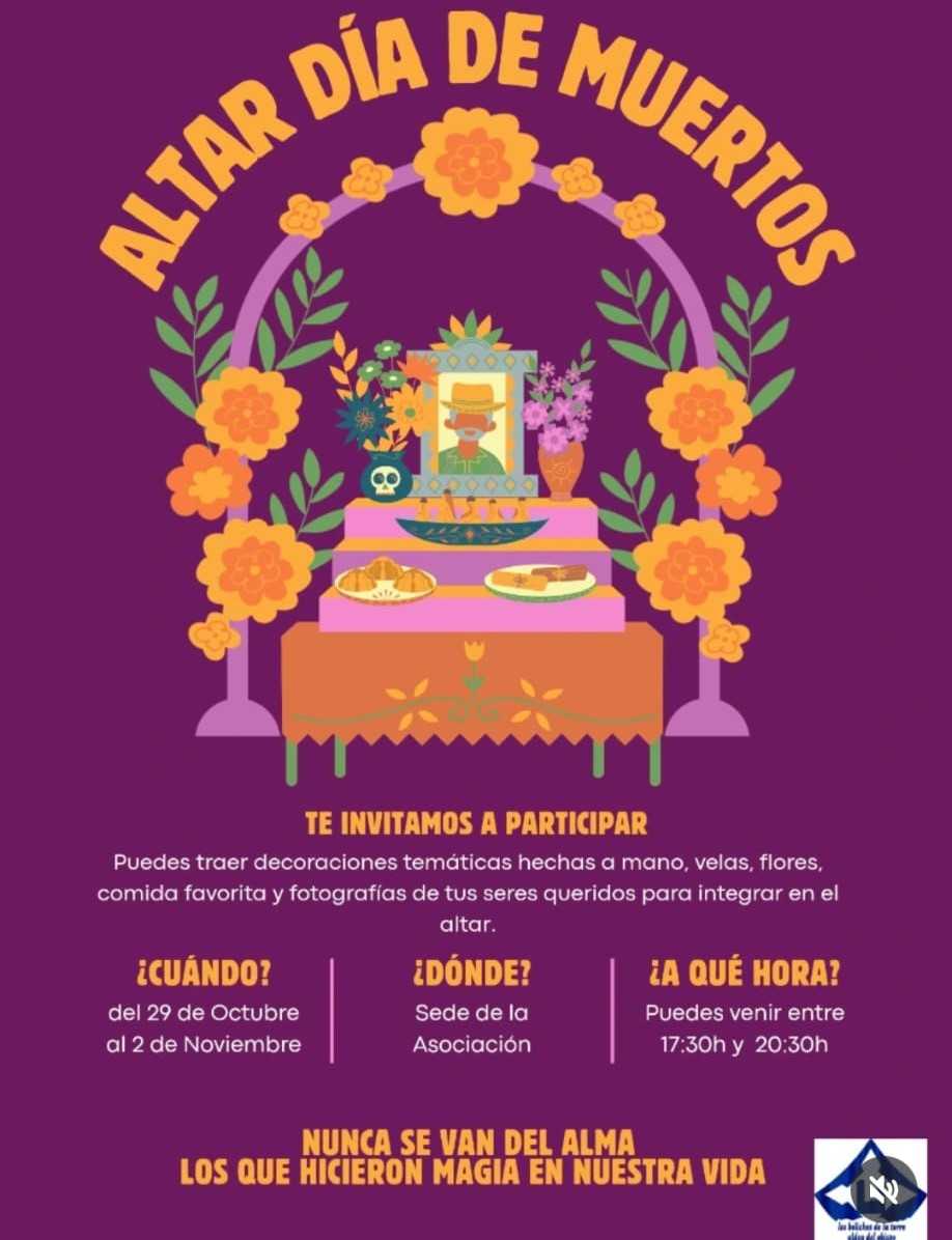 Se celebrará del 29 de Octubre al 2 de Noviembre, de 17:30h a 20:30h en la sede de la asociación. Si se quiere colaborar se puede traer la fotografía de un ser querido y su bebida o comida favorita.