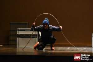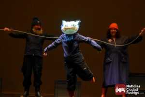 A esta actuación acudieron niños y niñas de 1º y 2º de EP del CEIP Miróbriga, CEIP El Puente, CEIP San Francisco, Colegio Misioneras/Sta. Teresa y CRA Campo de Argañán con los colegios de Fuentes de Oñoro y Gallegos de Argañán. Disfrutando de la obra «El Gato con Botas de Agua», producida por la compañía gijonesa «El Callejón del Gato», quiénes tuvieron un un pequeño coloquio con los asistentes al finalizar la obra.