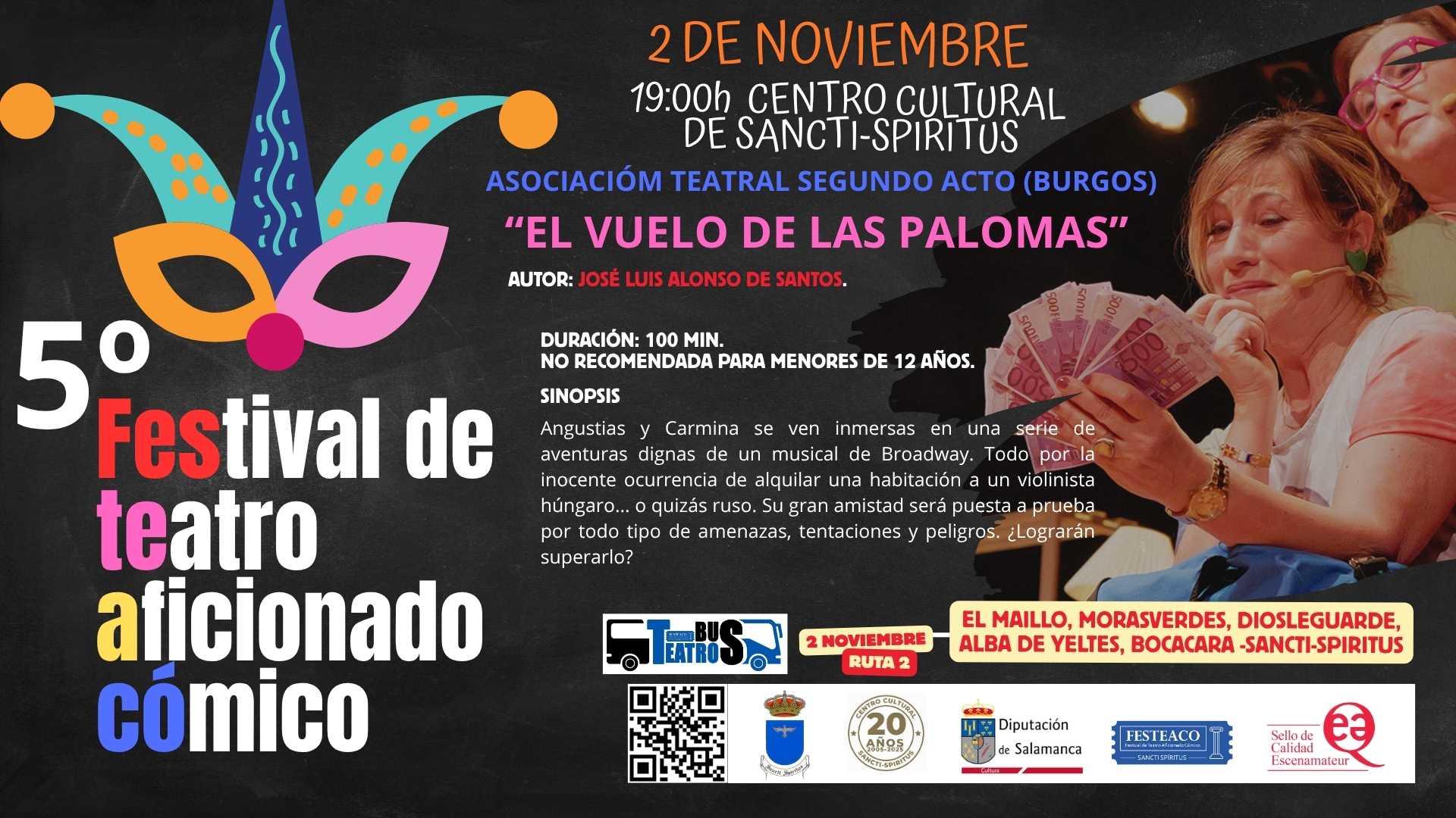 La asociación teatral «Segundo acto» pondrá hoy en escena «El vuelo de las palomas» de Alonso de Santos. Representación teatral enmarcada en el Festival de Teatro Aficionado Cómico de Sancti Spiritus, FESTEACO 2025. Esta es la segunda obra incluida en la programación del festival.