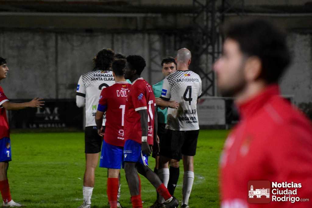 Ya en la segunda mitad la necesidad apremió al Ciudad Rodrigo CF, que salió con más ímpetu, pero que le depararía la acción en clave ya comentada y que decide en gran medida el duelo: Balón a la contra que acaba con Álex Hernández expulsado tras un claro derribo dentro del área local, penalti, y detiene el lanzamiento Pepo. Hasta aquí todo bien, pero la situación se descontrola una vez que detiene el penalti el meta de La Fuente de San Esteban, pues el colegiado a instancias del línea determina erróneamente que Pepo se encuentra con los dos pies por delante de la línea de cal, por lo que se repite la pena máxima. 0-2 y el Francisco Mateos se convierte en un incendio.