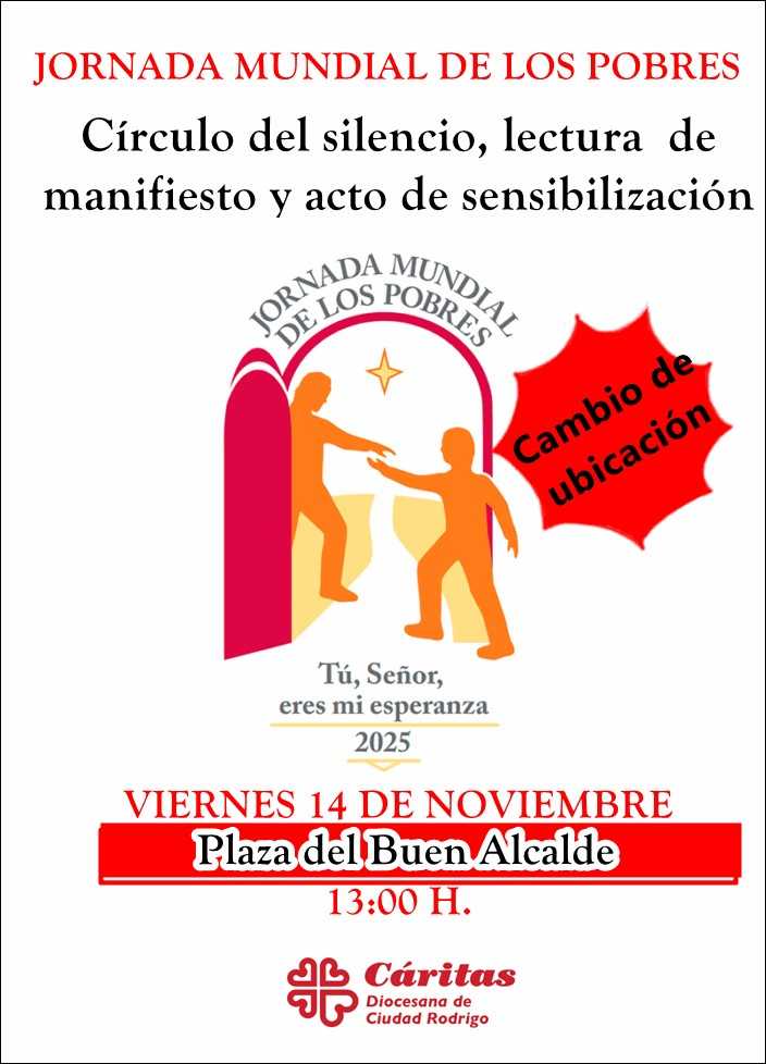 Debido a las previsiones meteorológicas de lluvia y viento, cambia la ubicación del acto organizado por Cáritas Diocesana Ciudad Rodrigo con motivo de la Jornada Mundial de los Pobres. En lugar de ser en la Glorieta, como estaba previsto, el acto se desarrollará este viernes 14 de noviembre en la plaza del Buen Alcalde a la una de la tarde. Círculo del Silencio, lectura de manifiesto y acto de sensibilización, en el que puede participar todo aquel que lo desee.