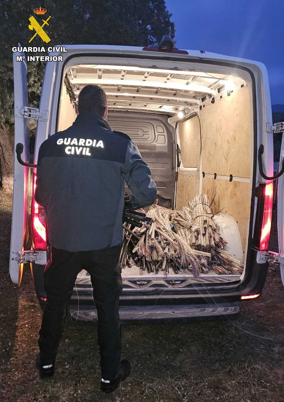 Ante la posibilidad de que sus cómplices hubieran cortado y ocultado más cableado para una posterior recogida, modus operandi habitual por este tipo de grupos delictivos, se llevó a cabo una batida de los terrenos cercanos, pudiendo localizar a un segundo varón junto a numerosas piezas de cable que tenían oculto y listo para su recogida, incautándose de un total de 1.033 kilogramos de cableado.