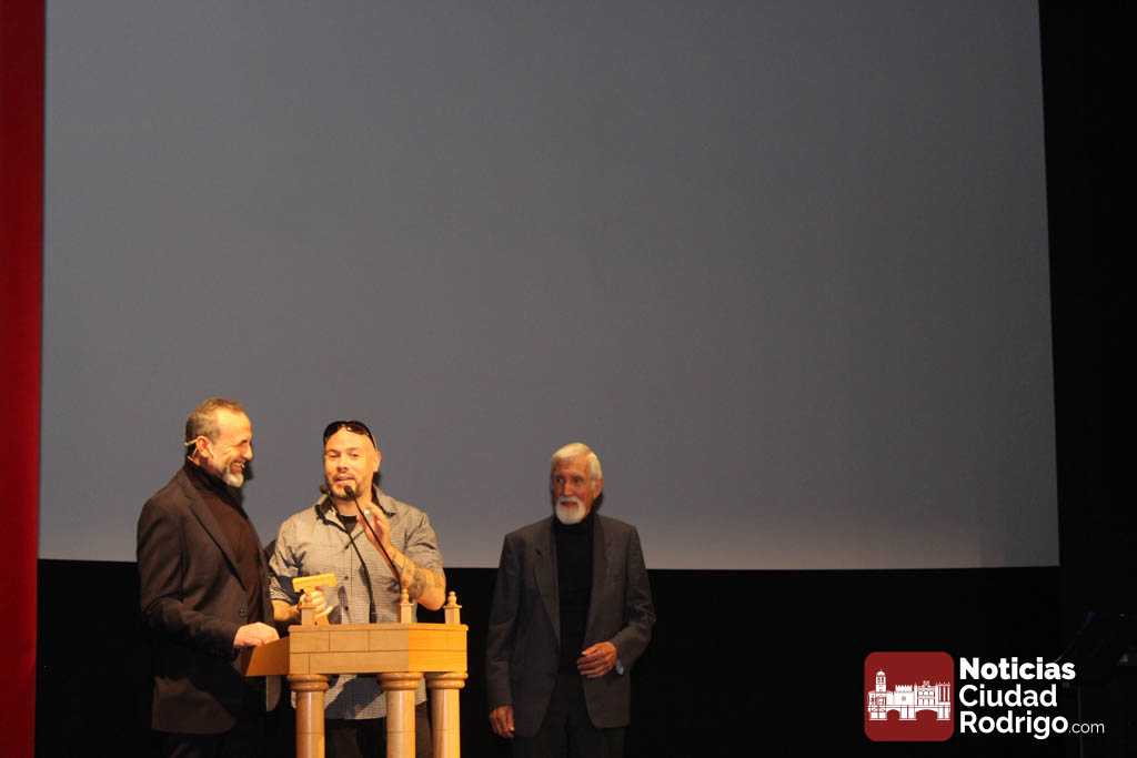 Los ganadores del premio Especial 7Tau del público del FICCI-ON OFF RURAL, ex aequo para 893KM de Rubén Guindo y La mía voz de Ana Aznárez Yera, han sido los últimos en subir al escenario para recoger el ansiado galardón que fue concedido hace unas semanas por los vecinos de diez municipios de la provincia de Salamanca en la iniciativa del festival por llegar al medio rural durante los meses estivales. Entregó este premio el alcalde de Lumbrales, Carlos Pedraz.