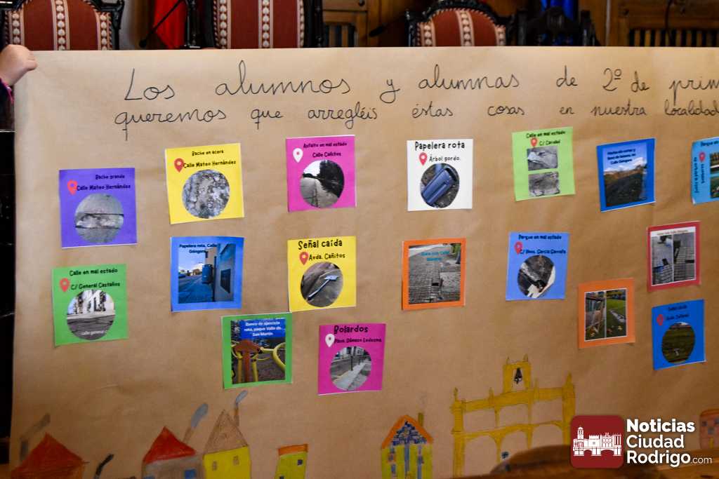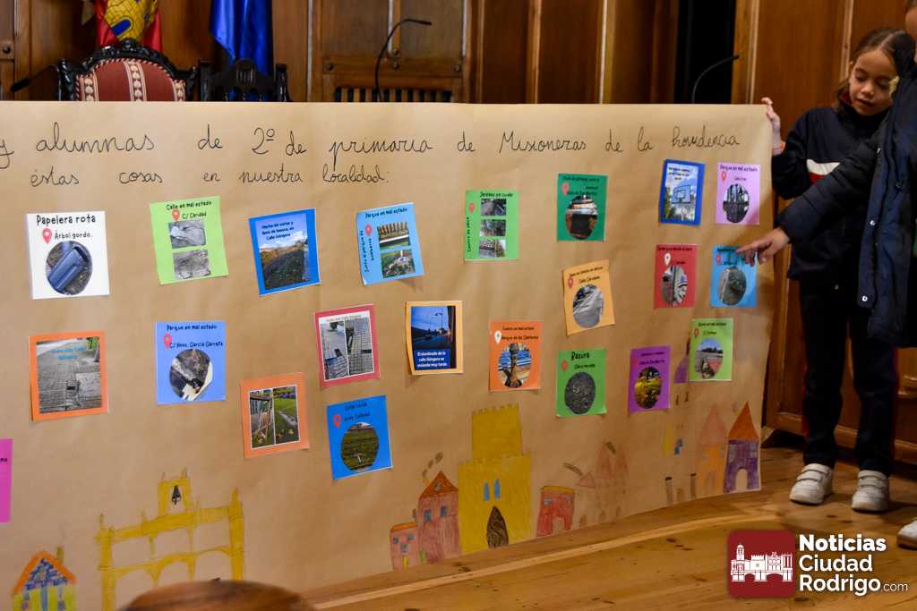 Ya en el Salón de Plenos de la casa consistorial, recibieron una explicación instructiva por parte del Alcalde acerca de las funciones del Ayuntamiento y del espacio en el que se encontraban. Posteriormente, los alumnos del centro sacaron una pancarta con una serie de «reivindicaciones» hacia el consistorio: Papeleras rotas, hasta farolas puestas en mala posición, fuentes atascadas, bordillos por arreglar y, sobre todo, peticiones concretas en torno a los parques mirobrigenses, cosa lógica al ser los usuarios de los mismos.