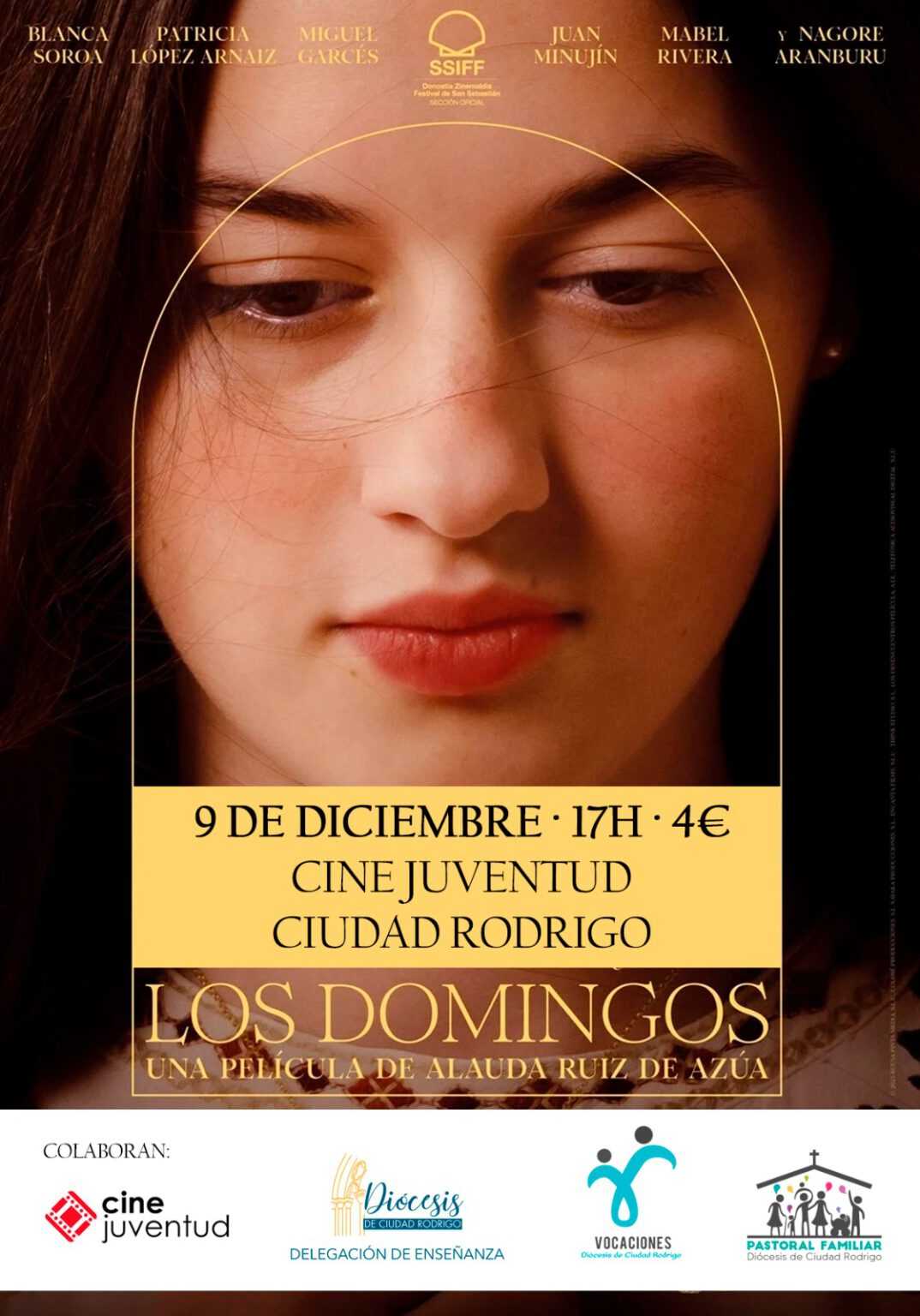 Las delegaciones diocesanas de Enseñanza, Vocaciones y Pastoral Familiar de la Diócesis de Ciudad Rodrigo, en colaboración con el Cine Juventud, organizan la proyección de la película Los Domingos el martes, 9 de diciembre, a las 17:00 horas. La cinta, dirigida por Alauda Ruiz de Azúa, ha sido reconocida con el Premio ¡Bravo! 2025 otorgado por la Comisión Episcopal para las Comunicaciones Sociales de la Conferencia Episcopal.