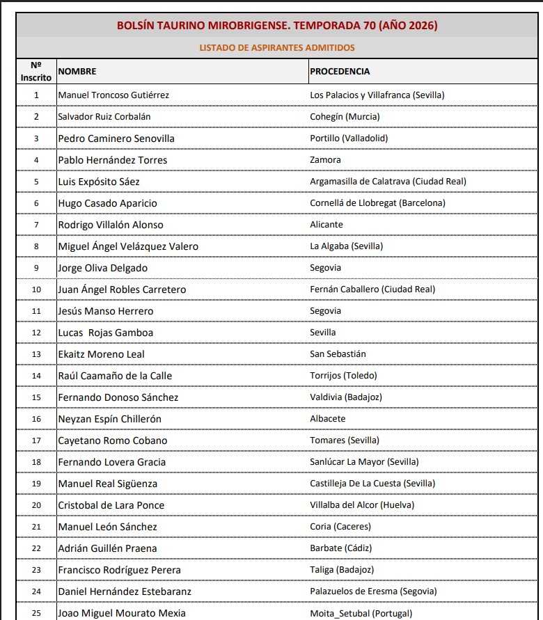 El listado de los 50 participantes en el concurso de aspirantes a toreros más antiguo de España se ha dado a conocer esta tarde