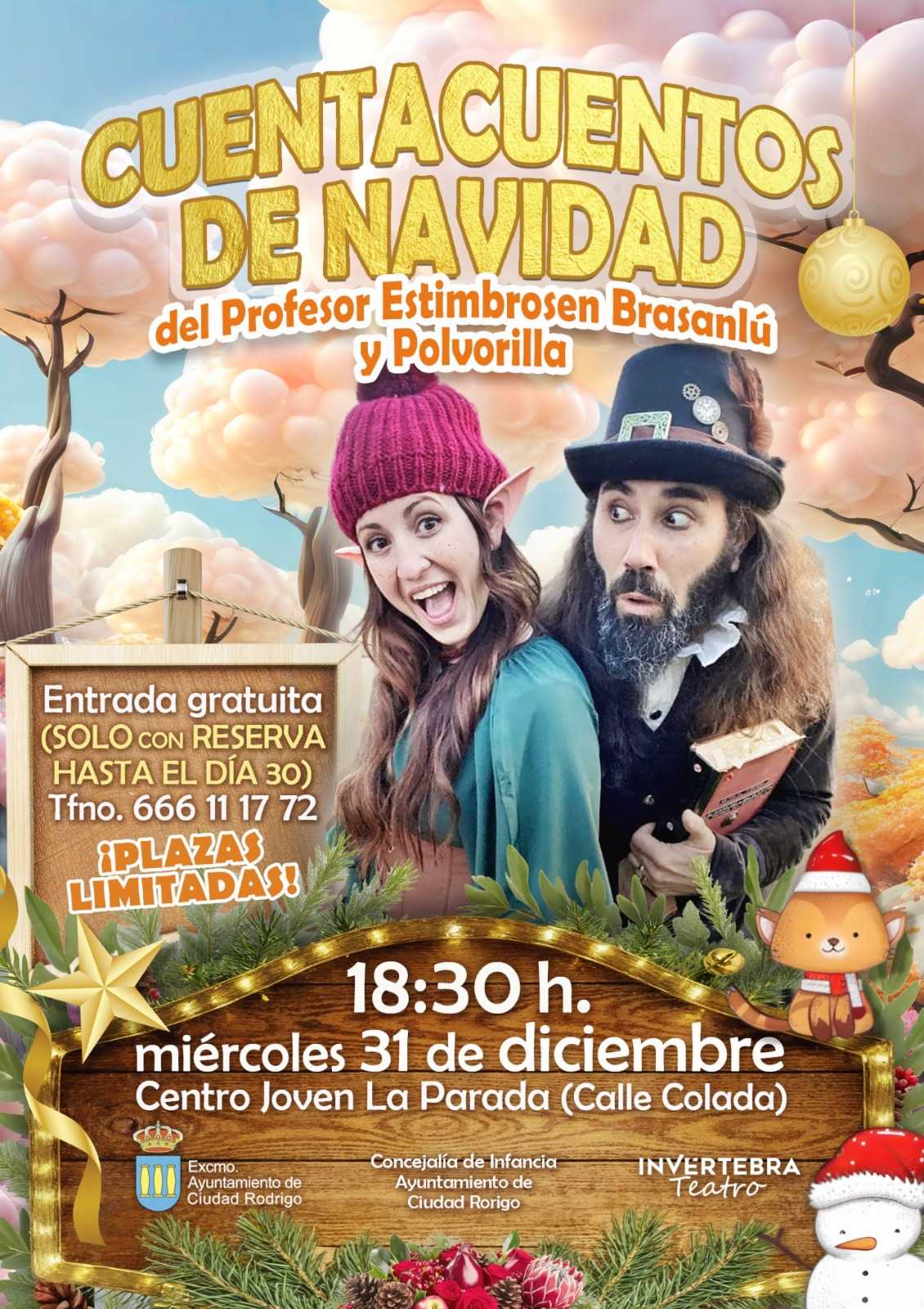 El Cuentacuentos de Navidad del Profesor Estimbrasen Brasanlú y Polvorilla tendrá lugar el próximo miércoles 31 de diciembre a las seis y media de la tarde en el Centro Joven «La Parada» (Puerta de La Colada).