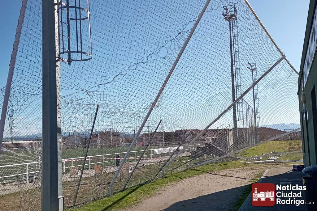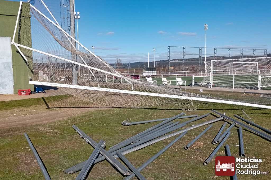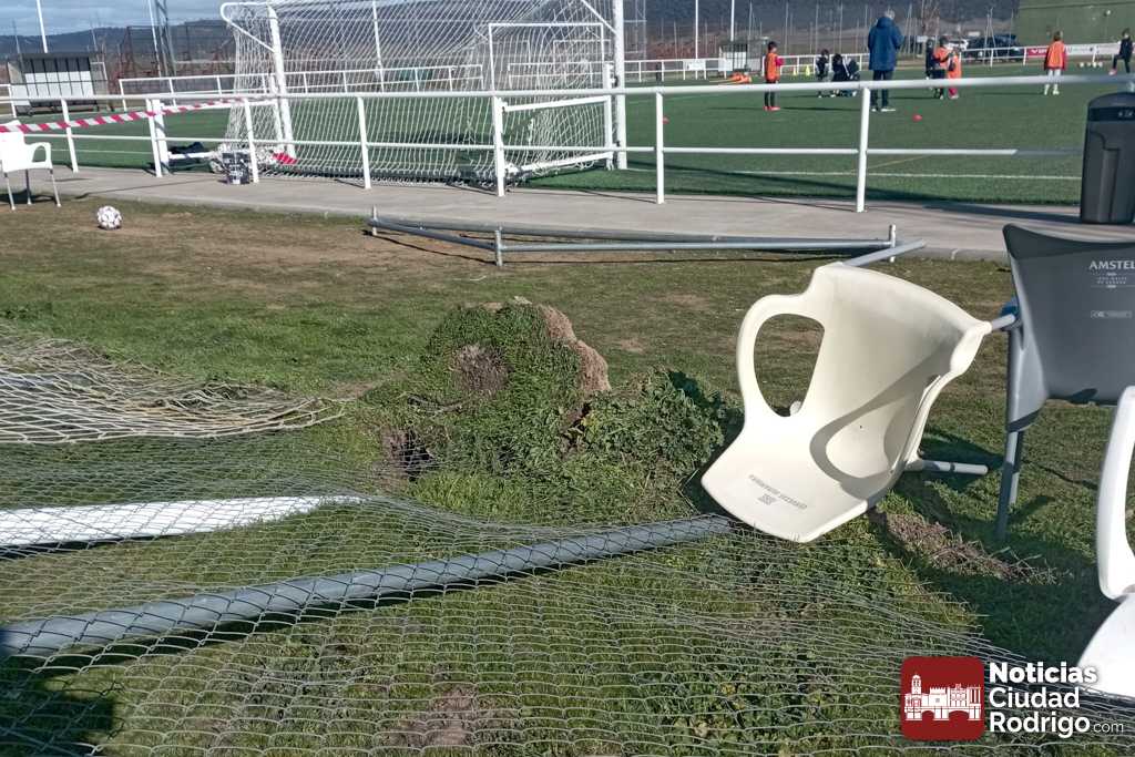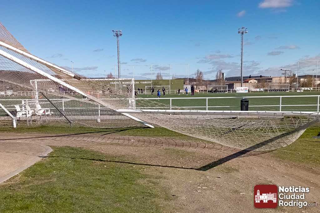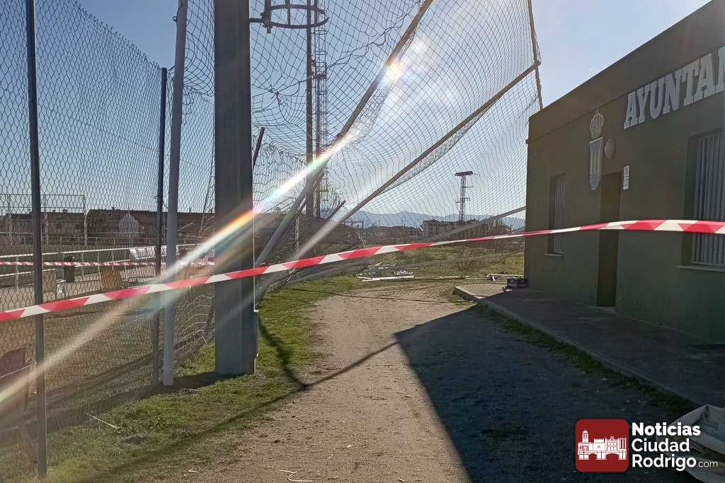 Las enormes ráfagas de viento producidas esta madrugada en Ciudad Rodrigo se han vuelto a cobrar como «víctima» el Campo Municipal Toñete, que ha amanecido con uno de sus laterales completamente volcado.