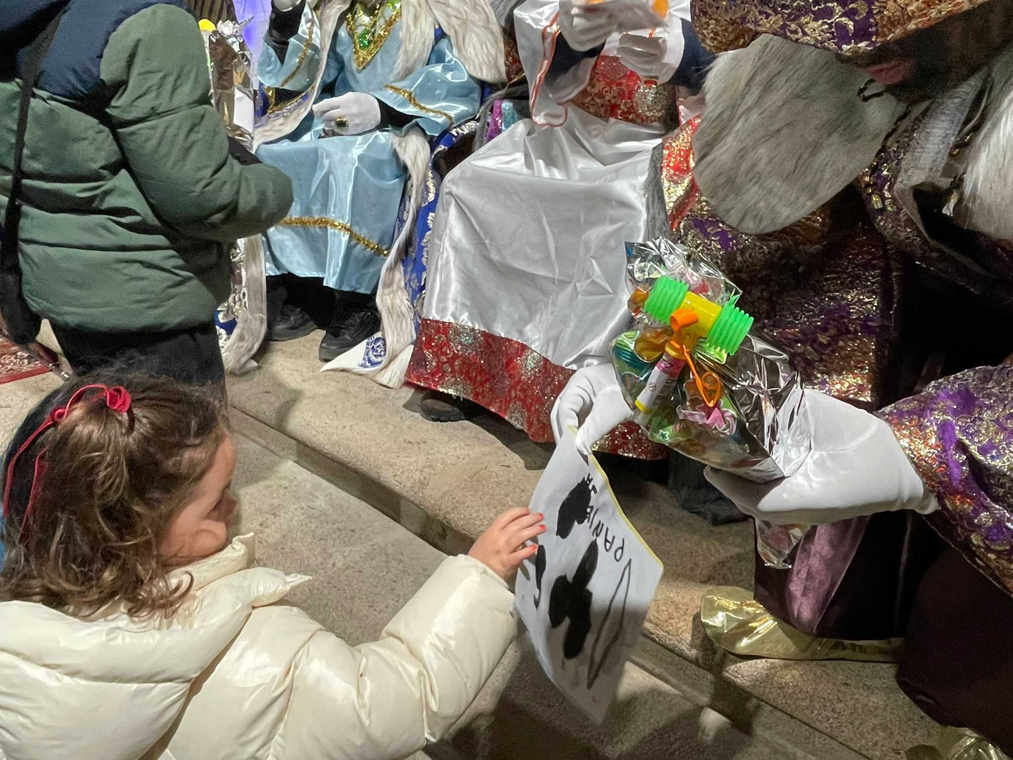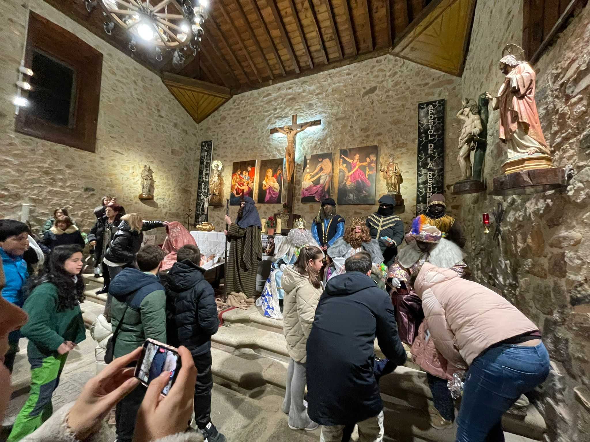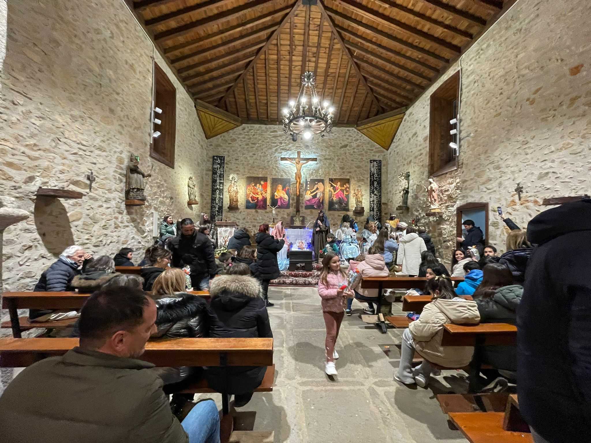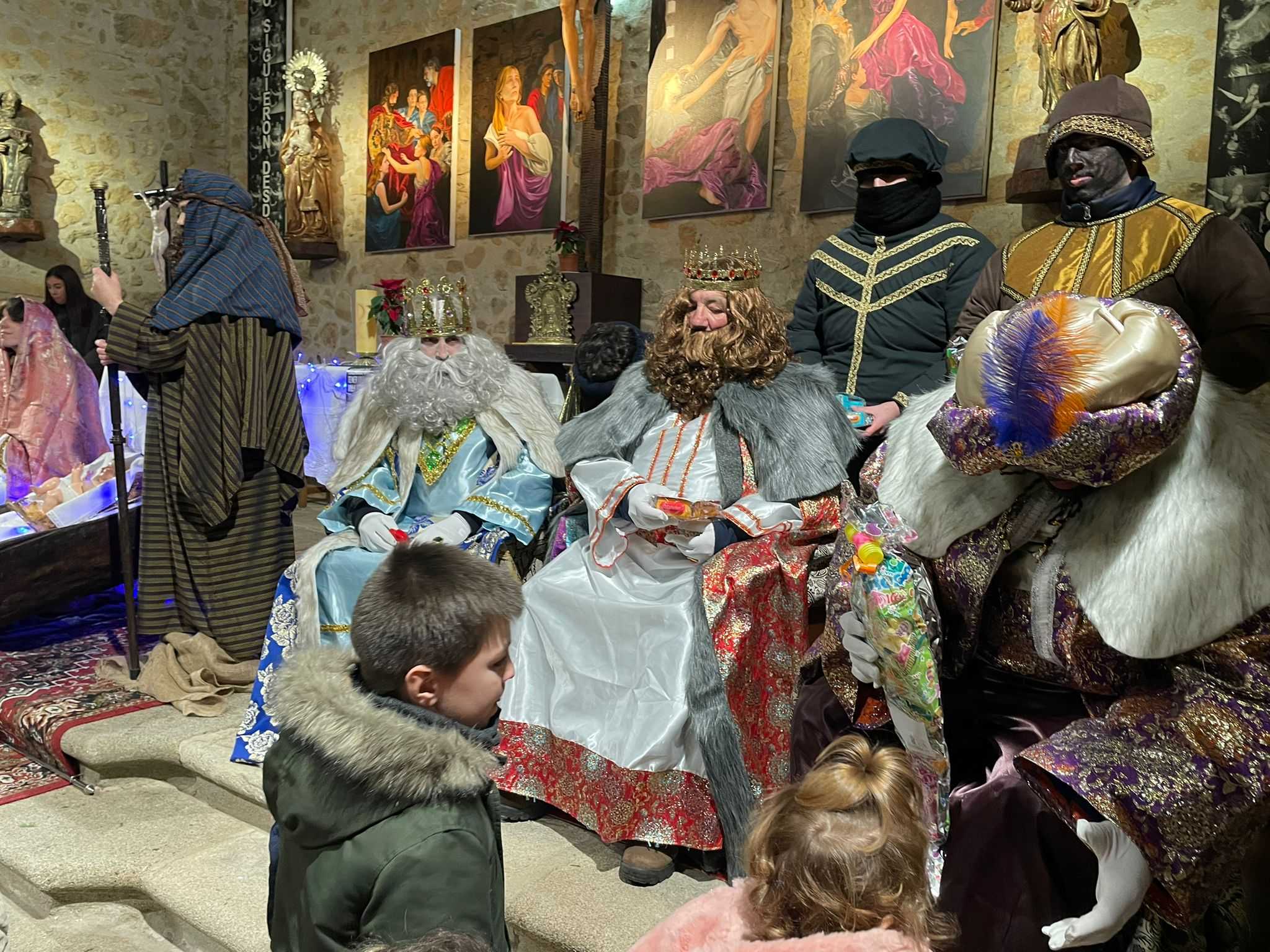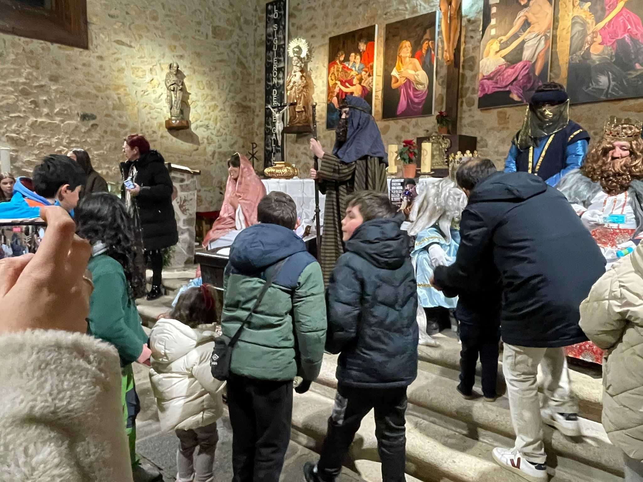 En El Maíllo, los Reyes Magos llegaron sobre las siete y cuarto portando antorchas. En el interior del templo parroquial, se recreó un Nacimiento y se instalaron tronos donde Melchor, Gaspar y Baltasar saludaron a los pequeños y les repartieron regalos.