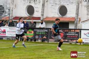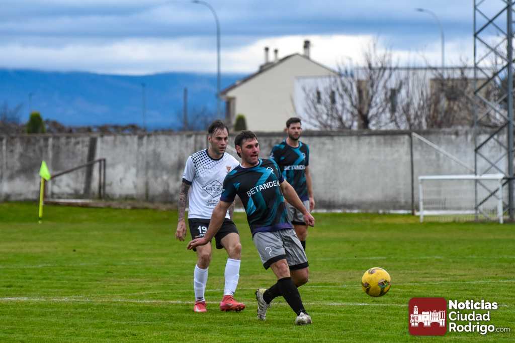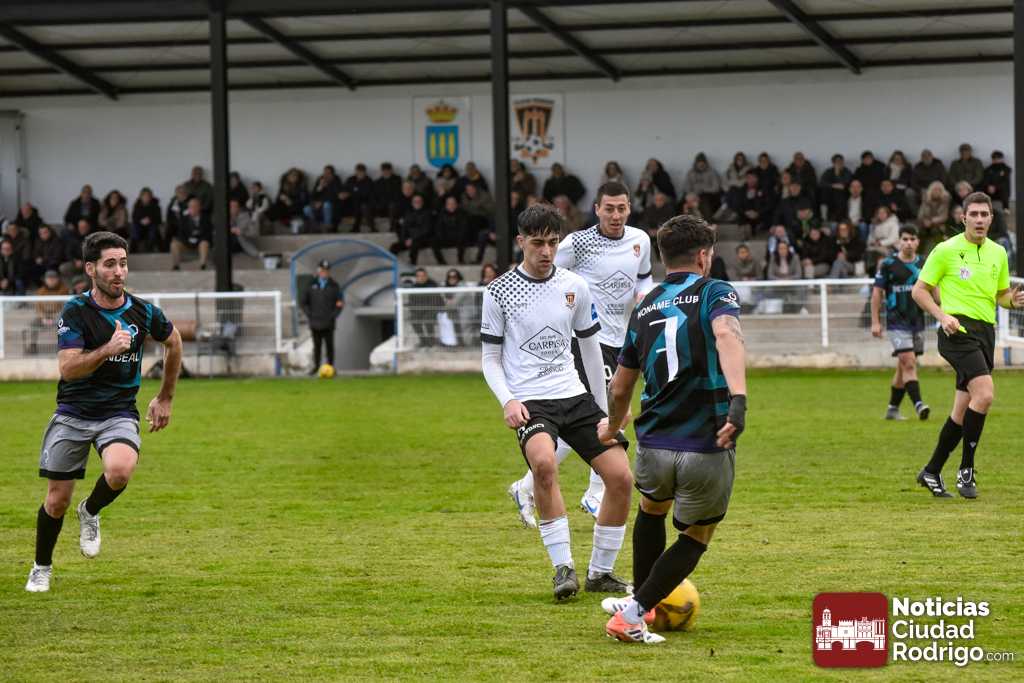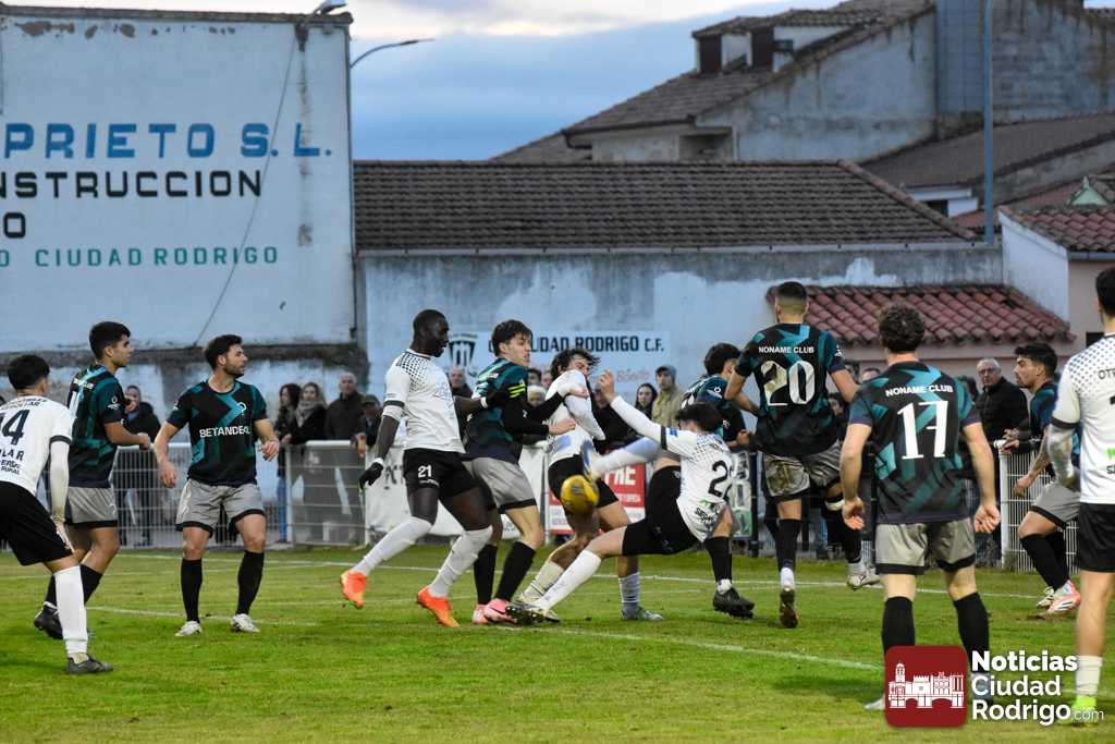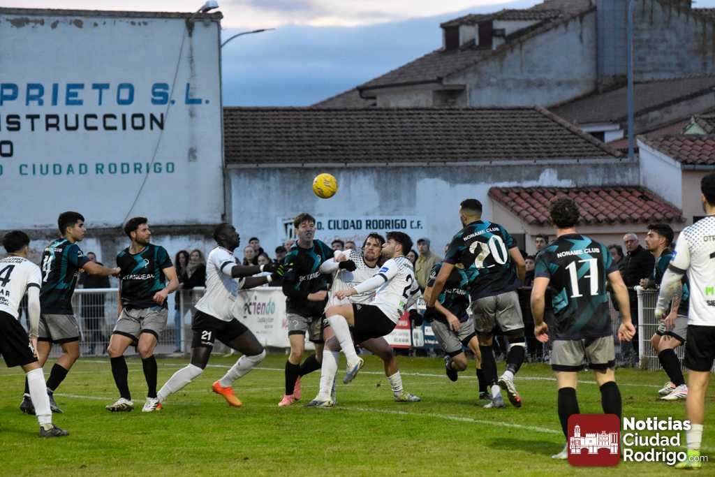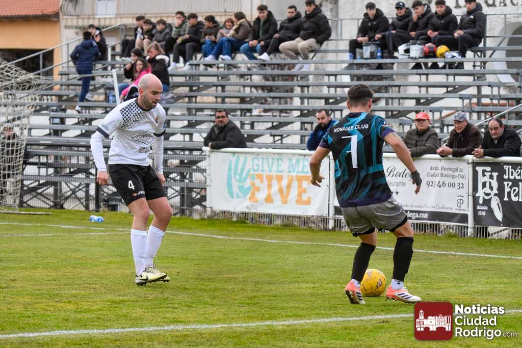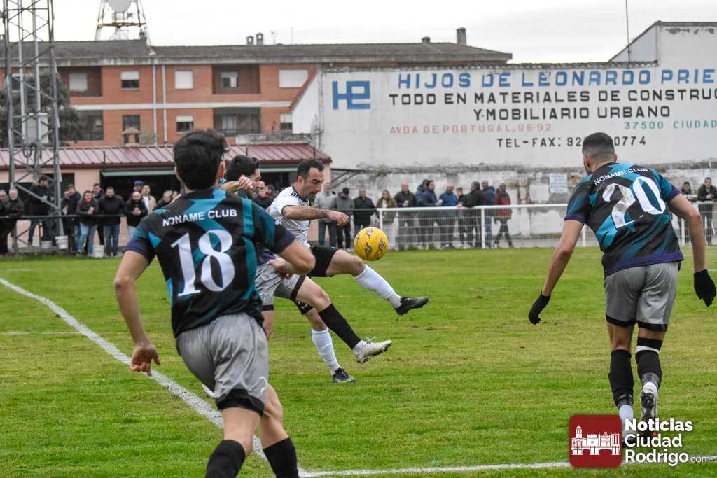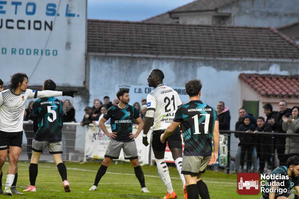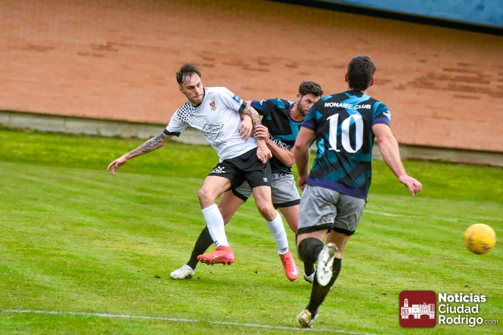 El gol ni espoleó a los locales, ni animó a los visitantes, que los siguientes 20 minutos realizaron una «oda» al tenis, con un juego descontrolado donde el balón pasaba de un lado a otro sin orden ni concierto. Con la media hora cumplida la cosa mejoró para el Ciudad Rodrigo CF, que tuvo algo más de dominio, aunque sin llegar a definir de cara a puerta y con mucha falta de orden en el centro del campo. El 0-1 del descanso pudo ser aún peor, pues el Noname se quedó cerca de ampliar distancias con dos balones al larguero, que fue el mejor aliado del Ciudad Rodrigo CF en todo el partido.
