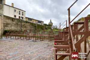 Faltan 23 días para el inicio del Carnaval del Toro 2026 y han comenzado las labores de instalación de diferentes elementos propios en el recorrido. En este caso, ha sido la zona del Registro la primera intervenida, al colocarse durante esta mañana los graderíos y el conocido como «Puente de Aris», que une ambos lados del foso en ese tramo y que ofrece un atajo desde el Registro al recinto ferial.