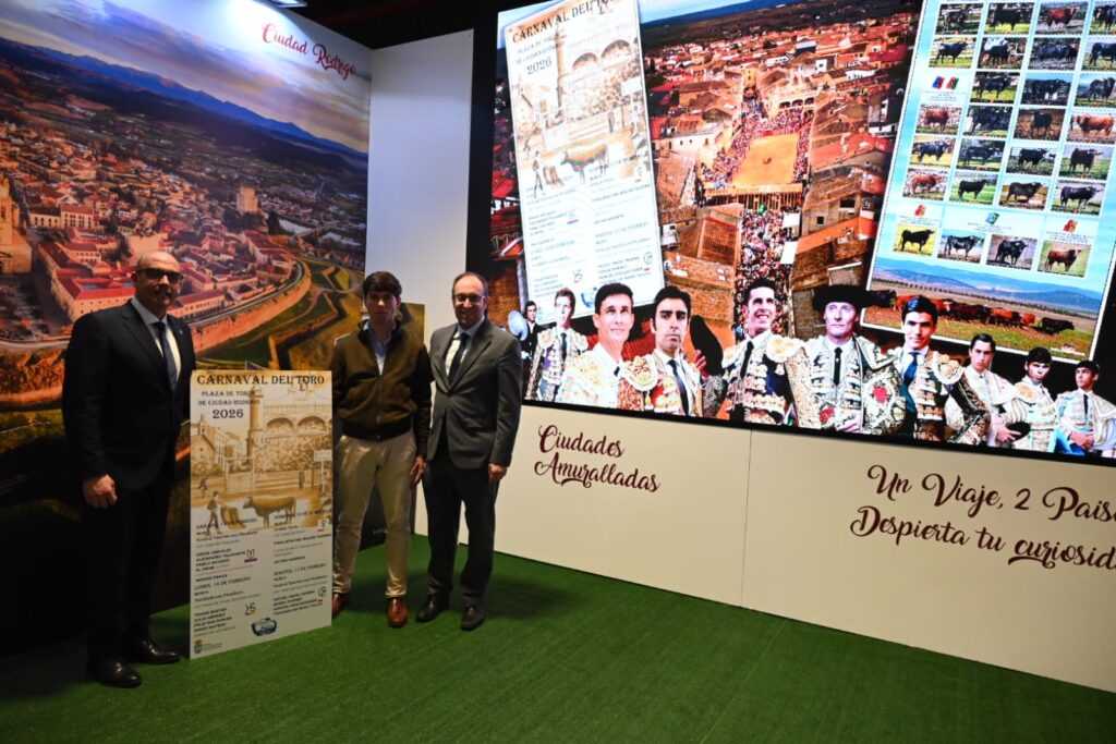 El Ayuntamiento de Ciudad Rodrigo presentó durante esta tarde en FITUR el cartel anunciador de los festivales y novilladas del Carnaval del Toro 2026. Una presentación en la que se mostró como temática una ilustración representativa de una de las novilladas del Bolsín Taurino Mirobrigense, que cumple 70 ediciones, y que contó con la presencia del Alcalde Marcos Iglesias, el Presidente de la Comisión del Carnaval, Ramón Sastre, y del novillero Julio Méndez, que toreará el lunes.