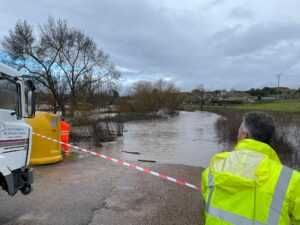 La situación con las lluvias y la crecida de todos los caudales se ha vuelto aún más compleja durante esta mañana con el desbordamiento del regato de San Giraldo a su paso por la zona de la Puentecilla. Una crecida que ha obligado al corte del acceso a dicha zona y, a su vez, ha obligado a los residentes a dar la vuelta por el camino de Pedrotoro a la Ermita para poder acceder a sus viviendas.