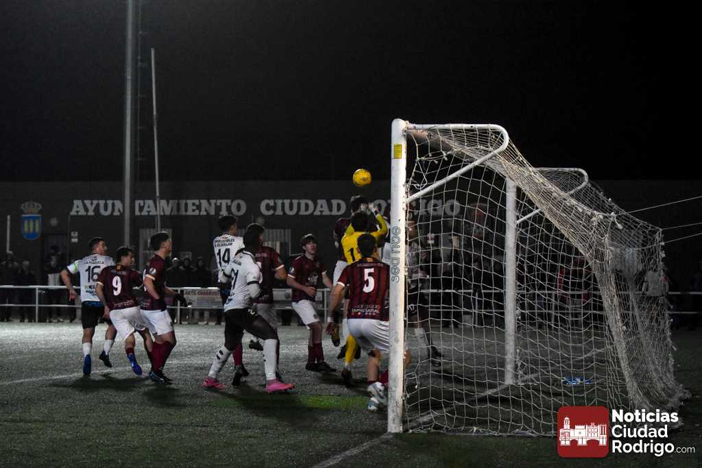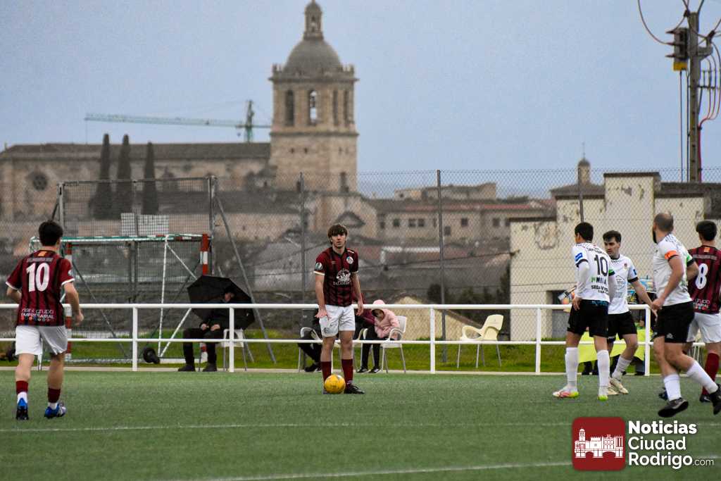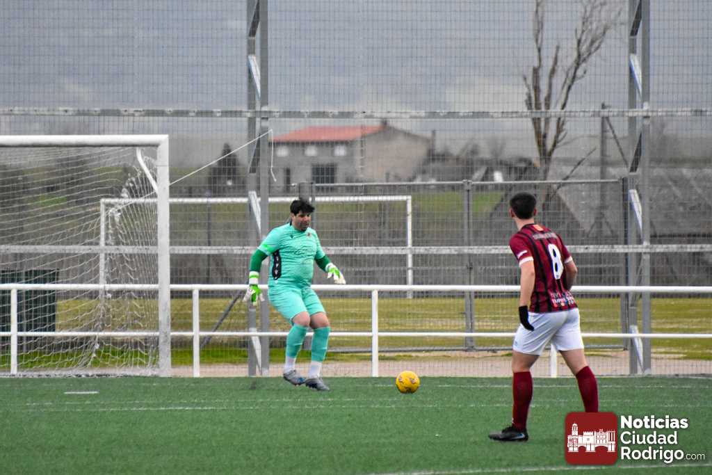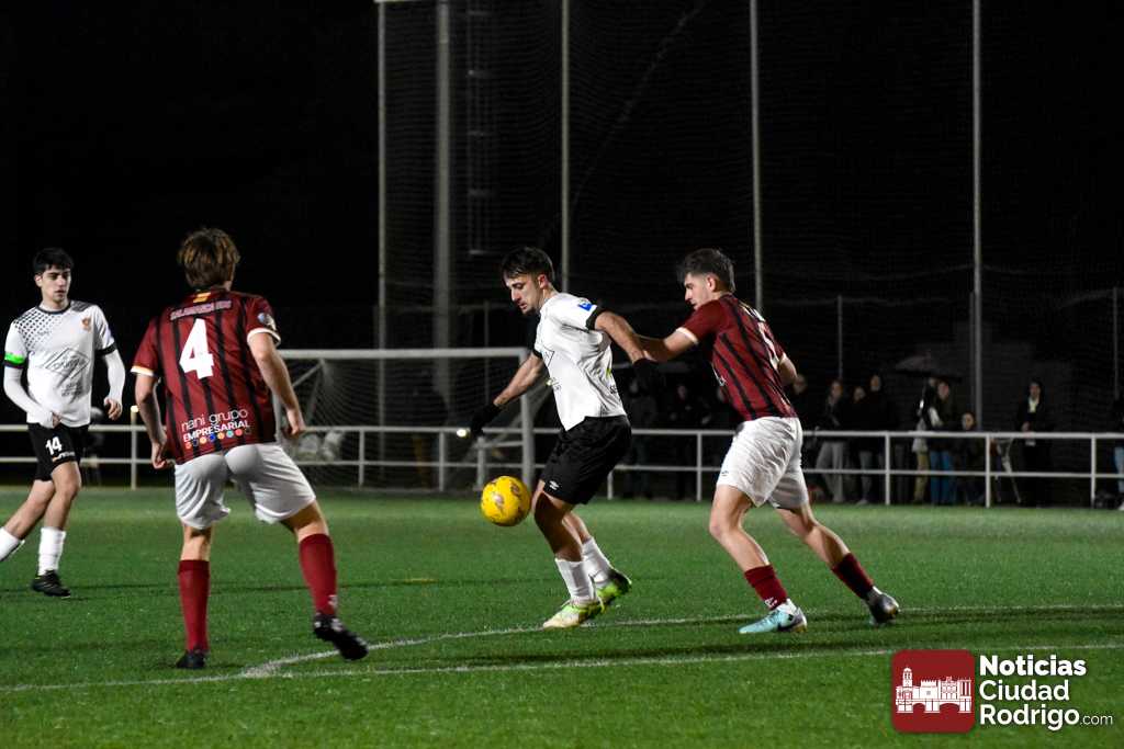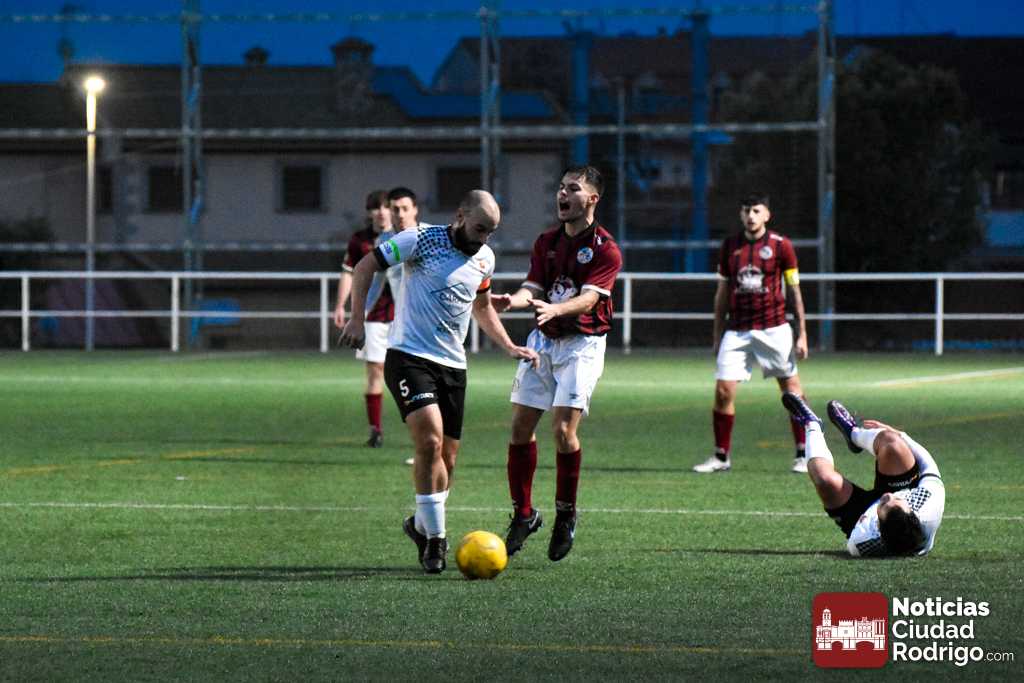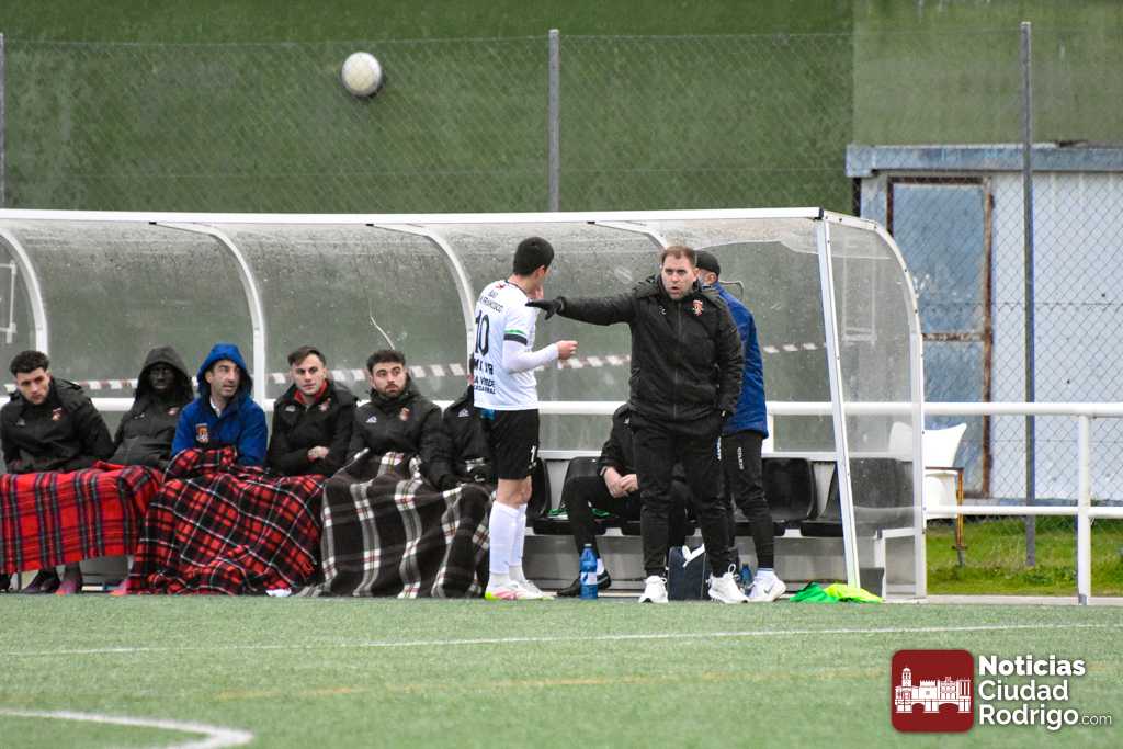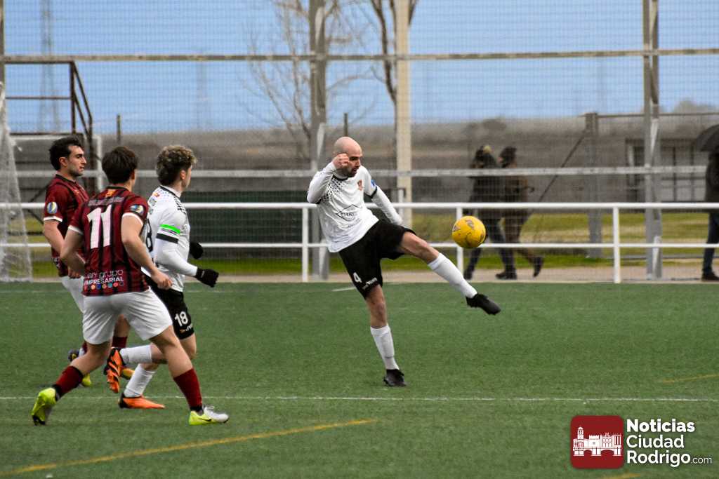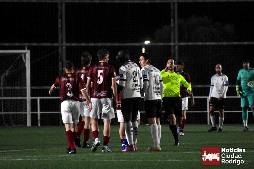 El encuentro arrancó de poder a poder, típico de conjuntos establecidos en la zona alta de la clasificación. Tuvo la oportunidad de golpear primero el Ciudad Rodrigo CF desde los 11 metros por mediación de Sergi, pero erró la pena máxima. Esto hundió a nivel de juego a los locales, que empezaron a verse peor en el juego por parte de los charros hasta verse, en el minuto 18, por detrás en el marcador tras rematar Asier Domínguez un rechace tras una gran parada de Pepo. El gol azuzó a los locales y lograron igualar en el 30´ con un remate de Zuco. Así mismo, los locales tuvieron una oportunidad muy clara en un remate al larguero de Maza al patear una falta directa al filo del descanso.