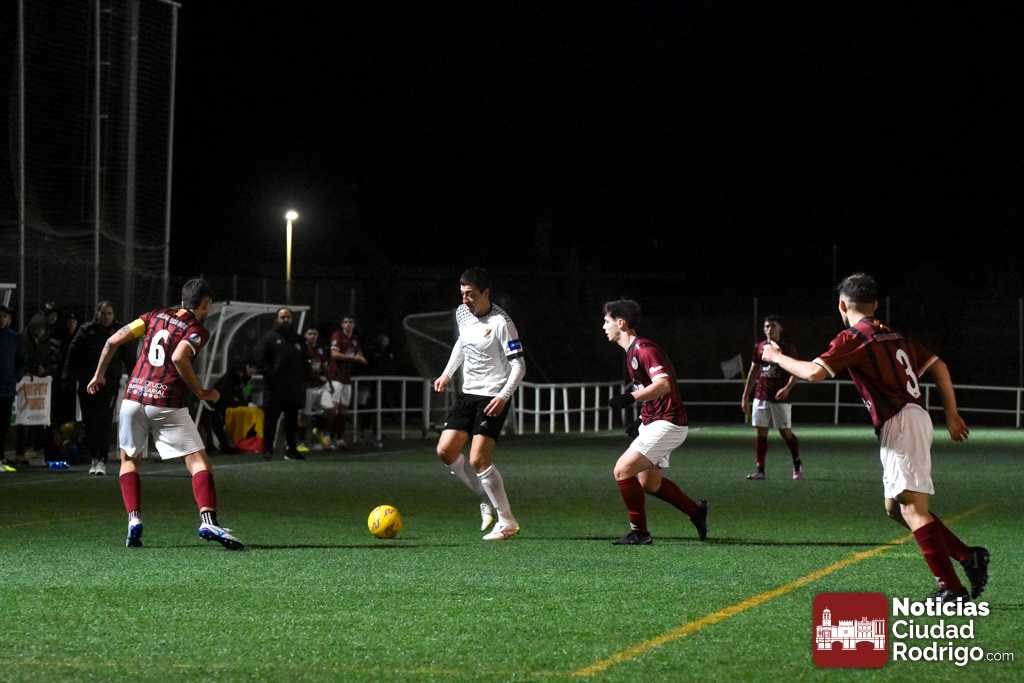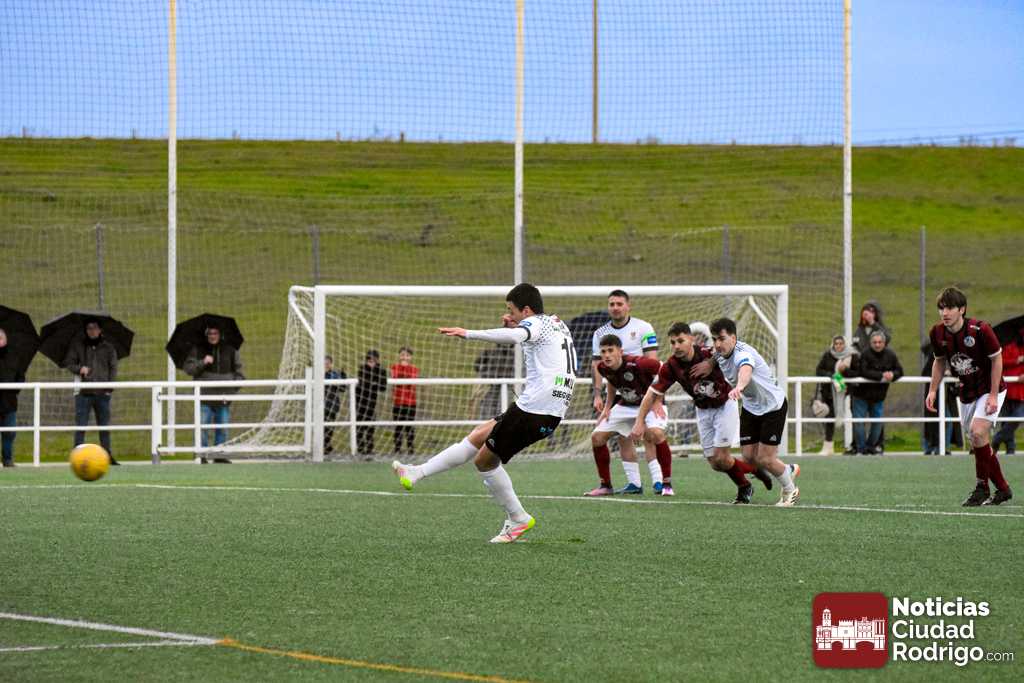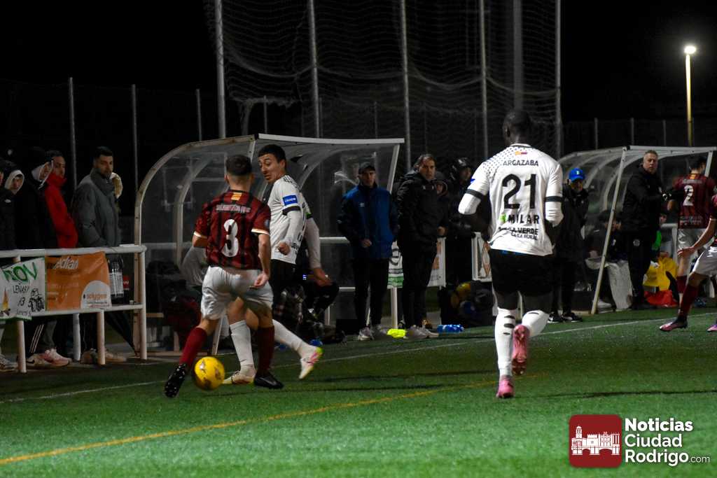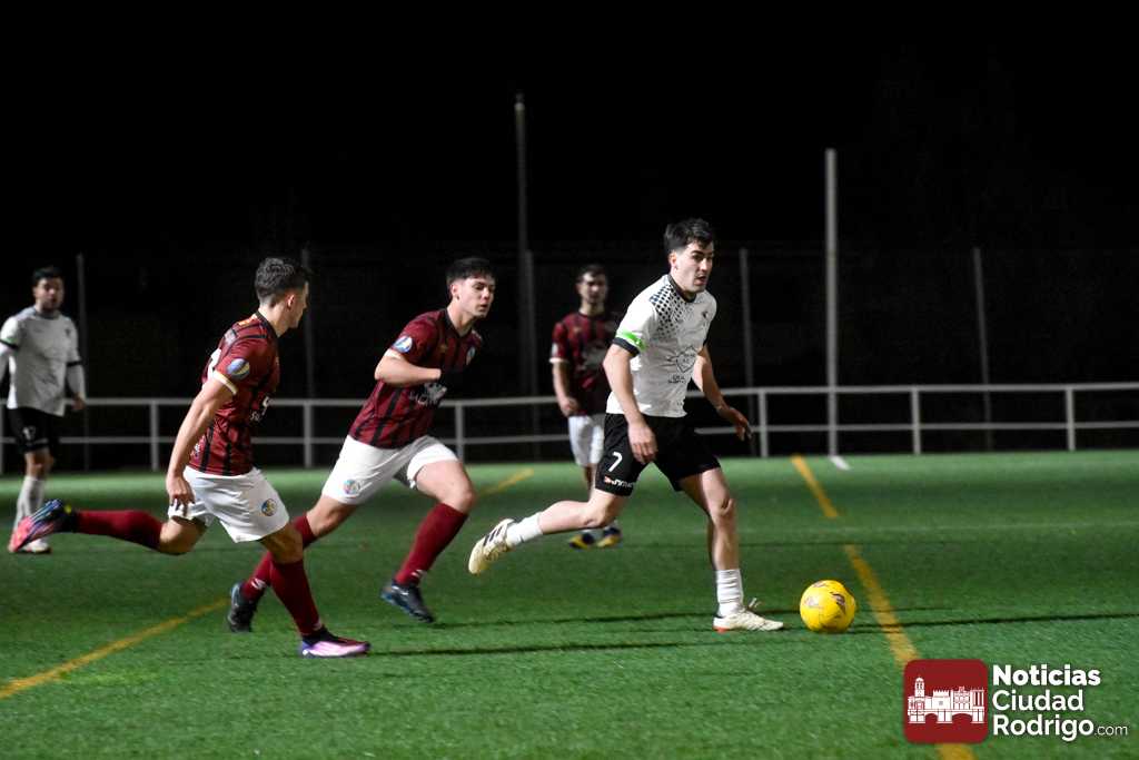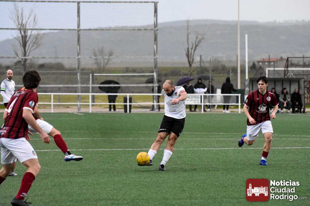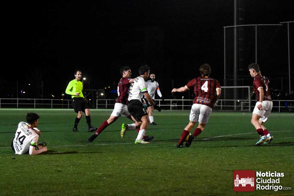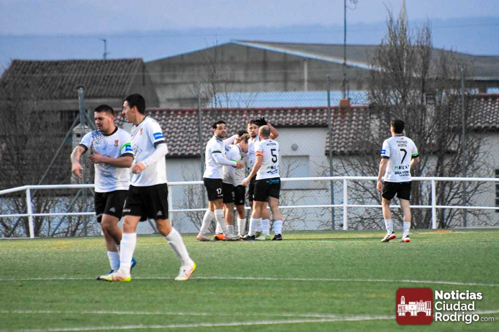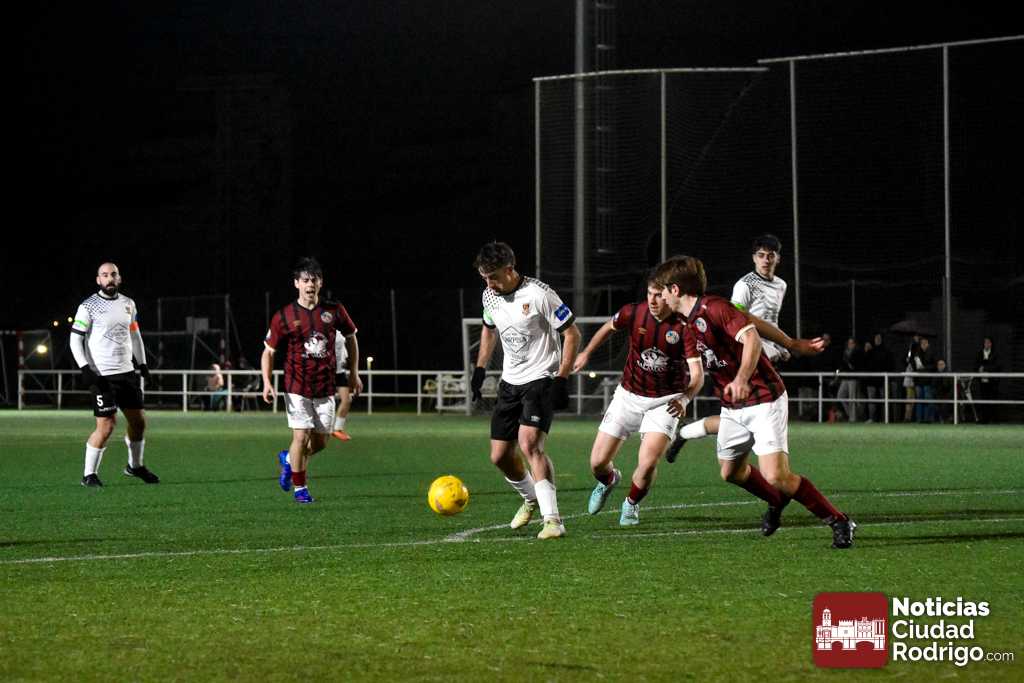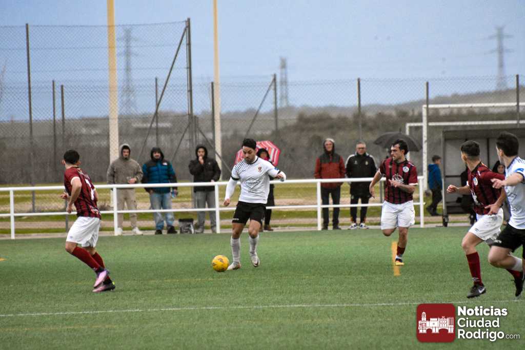 El encuentro arrancó de poder a poder, típico de conjuntos establecidos en la zona alta de la clasificación. Tuvo la oportunidad de golpear primero el Ciudad Rodrigo CF desde los 11 metros por mediación de Sergi, pero erró la pena máxima. Esto hundió a nivel de juego a los locales, que empezaron a verse peor en el juego por parte de los charros hasta verse, en el minuto 18, por detrás en el marcador tras rematar Asier Domínguez un rechace tras una gran parada de Pepo. El gol azuzó a los locales y lograron igualar en el 30´ con un remate de Zuco. Así mismo, los locales tuvieron una oportunidad muy clara en un remate al larguero de Maza al patear una falta directa al filo del descanso.