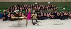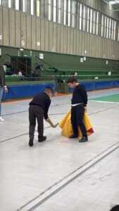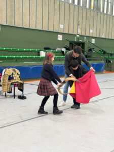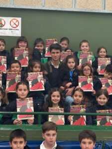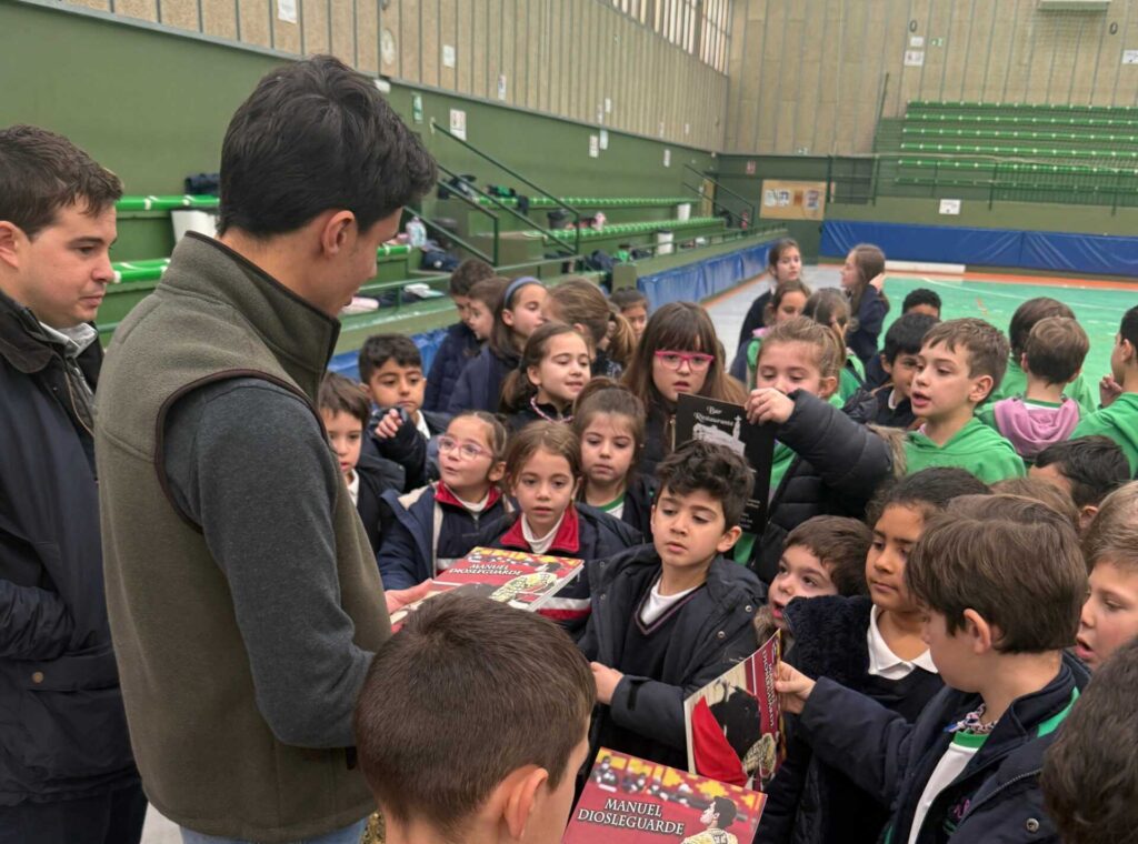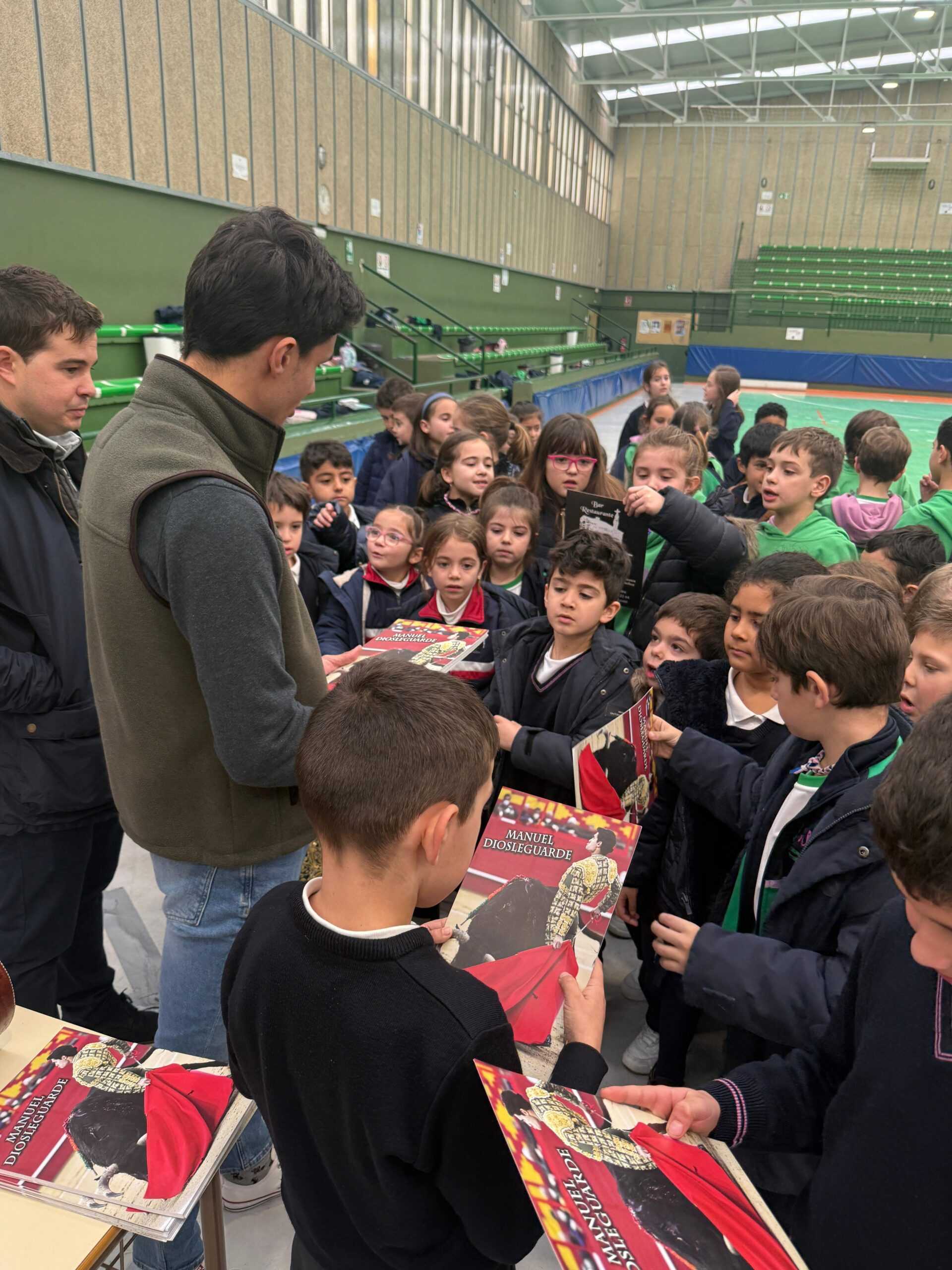 Posteriormente, Manuel Diosleguarde realizó una demostración práctica de distintos pases con la muleta y el capote (en el mismo pabellón donde empezó de niño con la Escuela de Tauromaquia de Salamanca), ya posteriormente los niños, que mostraron una gran ilusión por conocer al torero, pudieron participar activamente realizando algún pase y llevándose de recuerdo cada uno una foto dedicada.